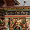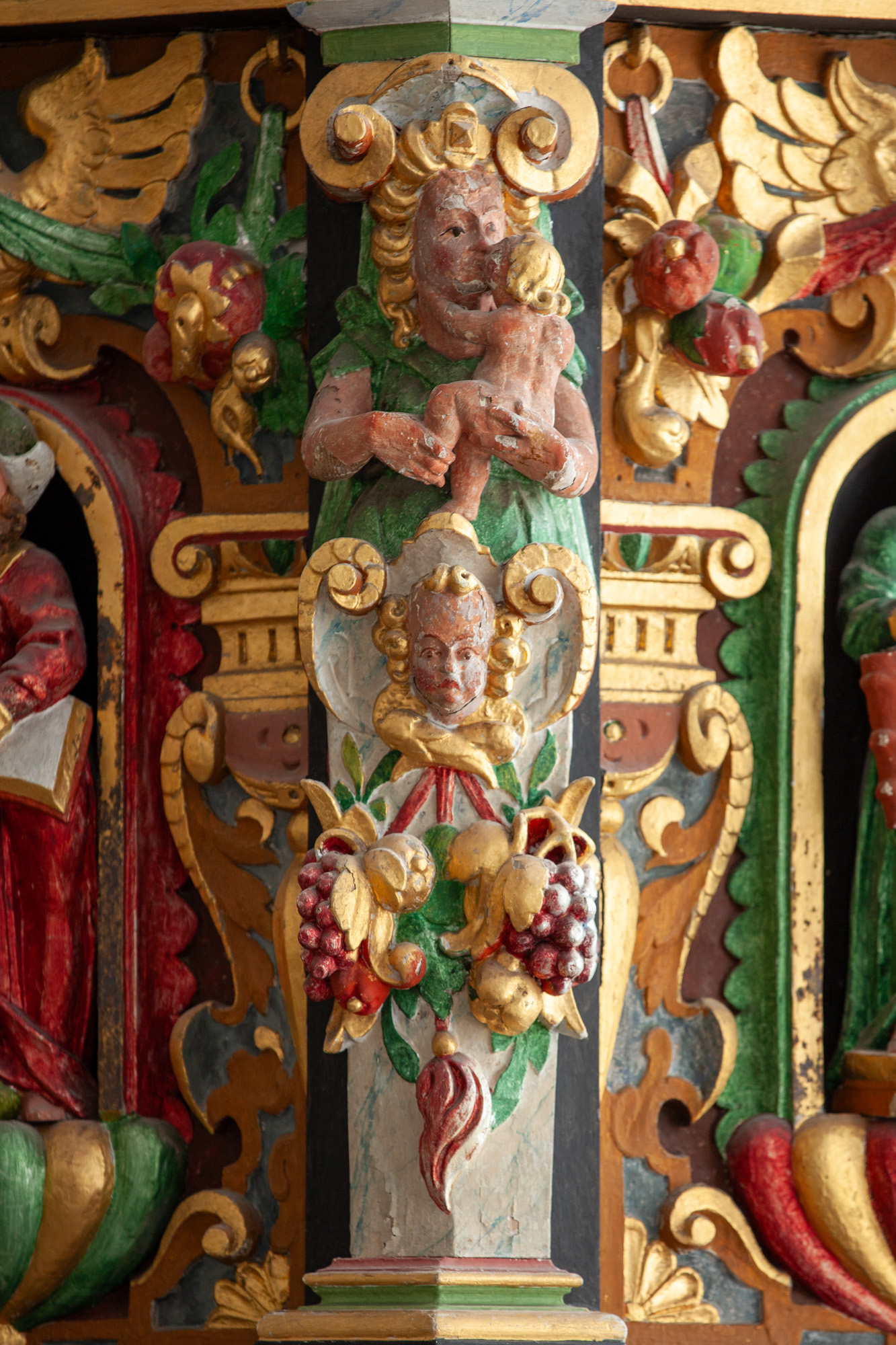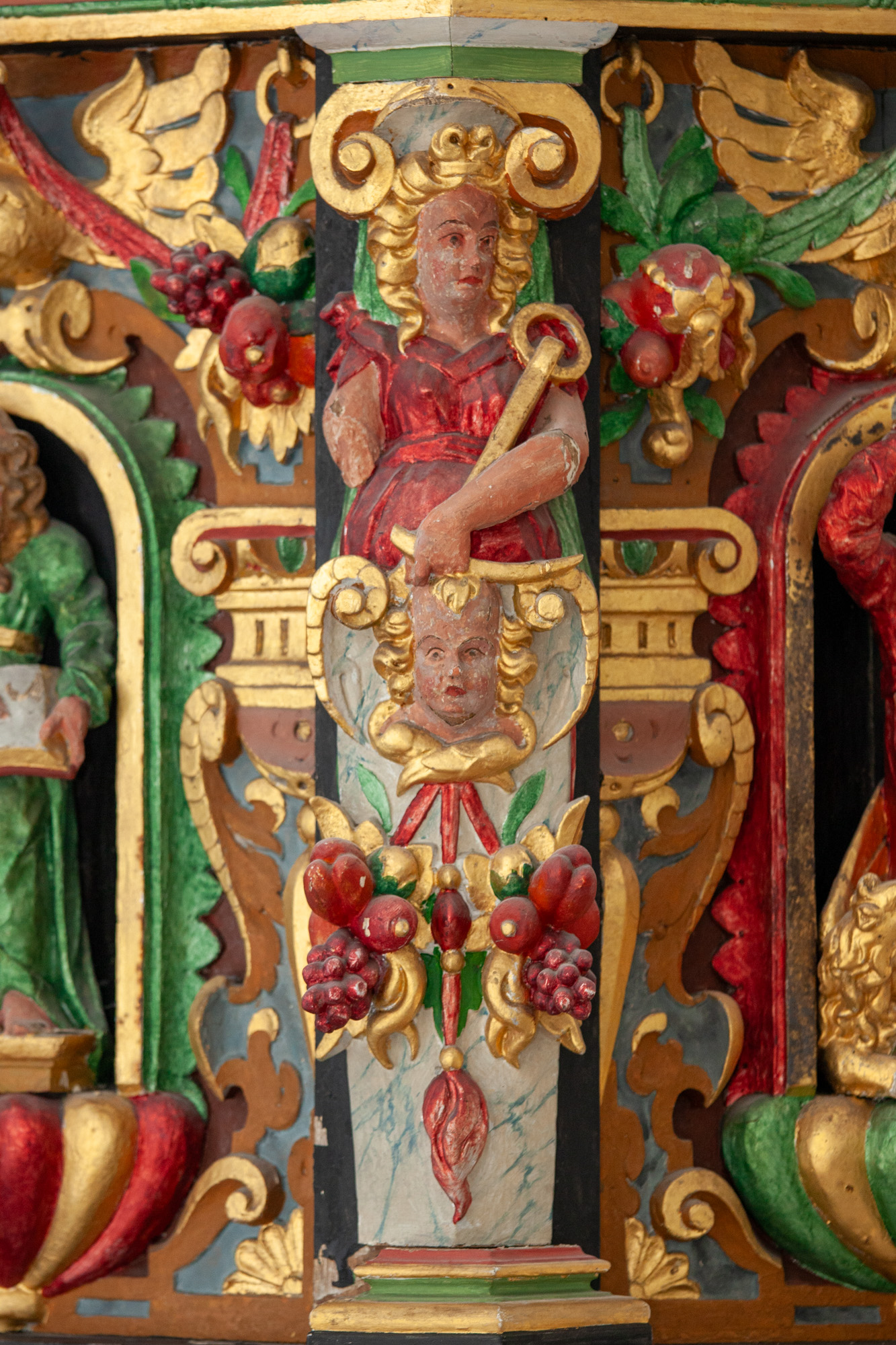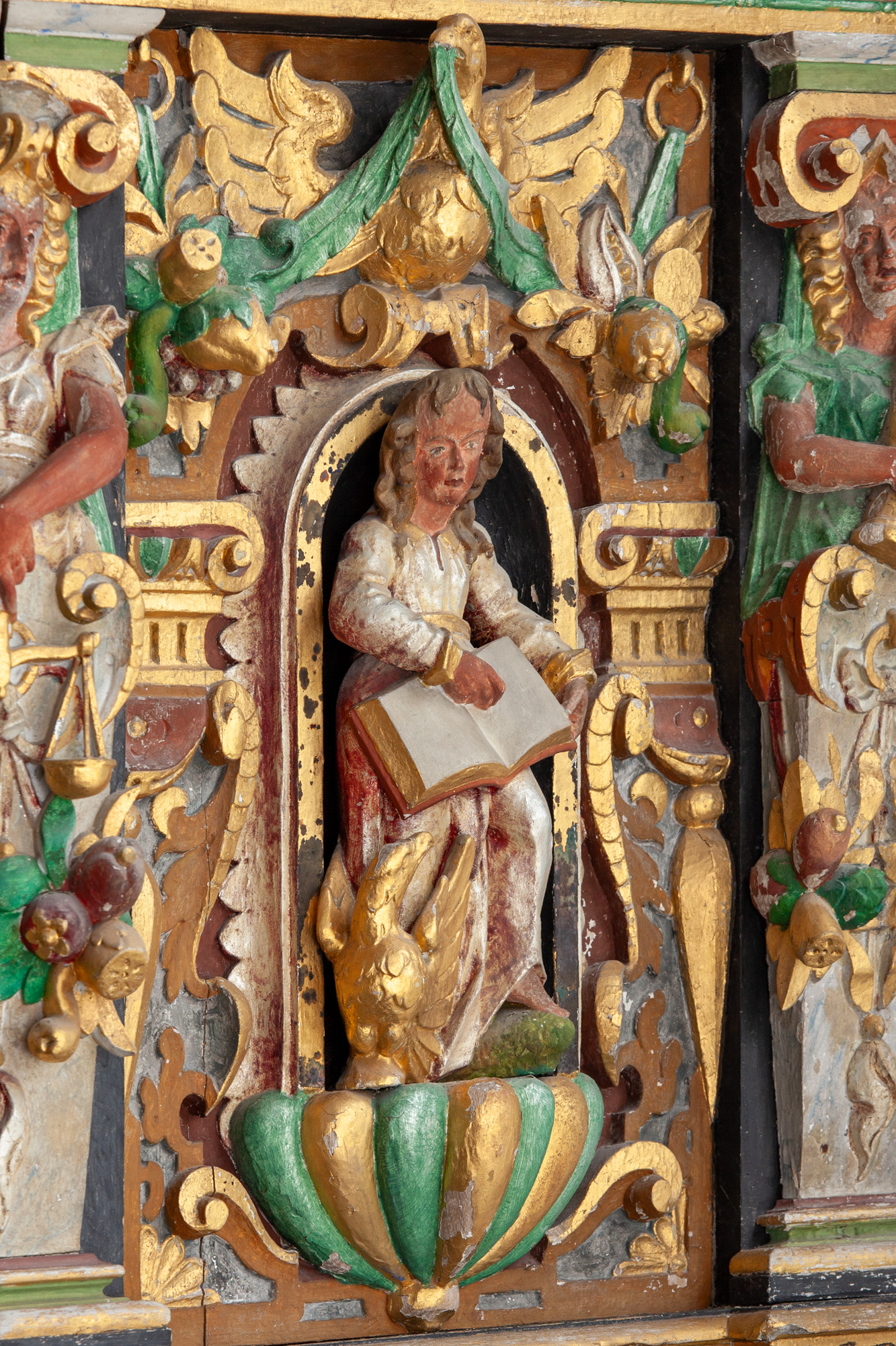 Storfelterne har figurer, der forestiller evangelisterne. De står i en forholdsvis lille rundbue på en godronneret sokkel. Rammen udgøres af noget, der nærmest kan kaldes pilastre i bruskbarok. Over rundbuen sidder en stor fugl (ørn?) med udbredte vinger. Den flankeres af to frugtklaser med grønne blade, som den holder i næbbet.