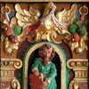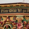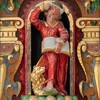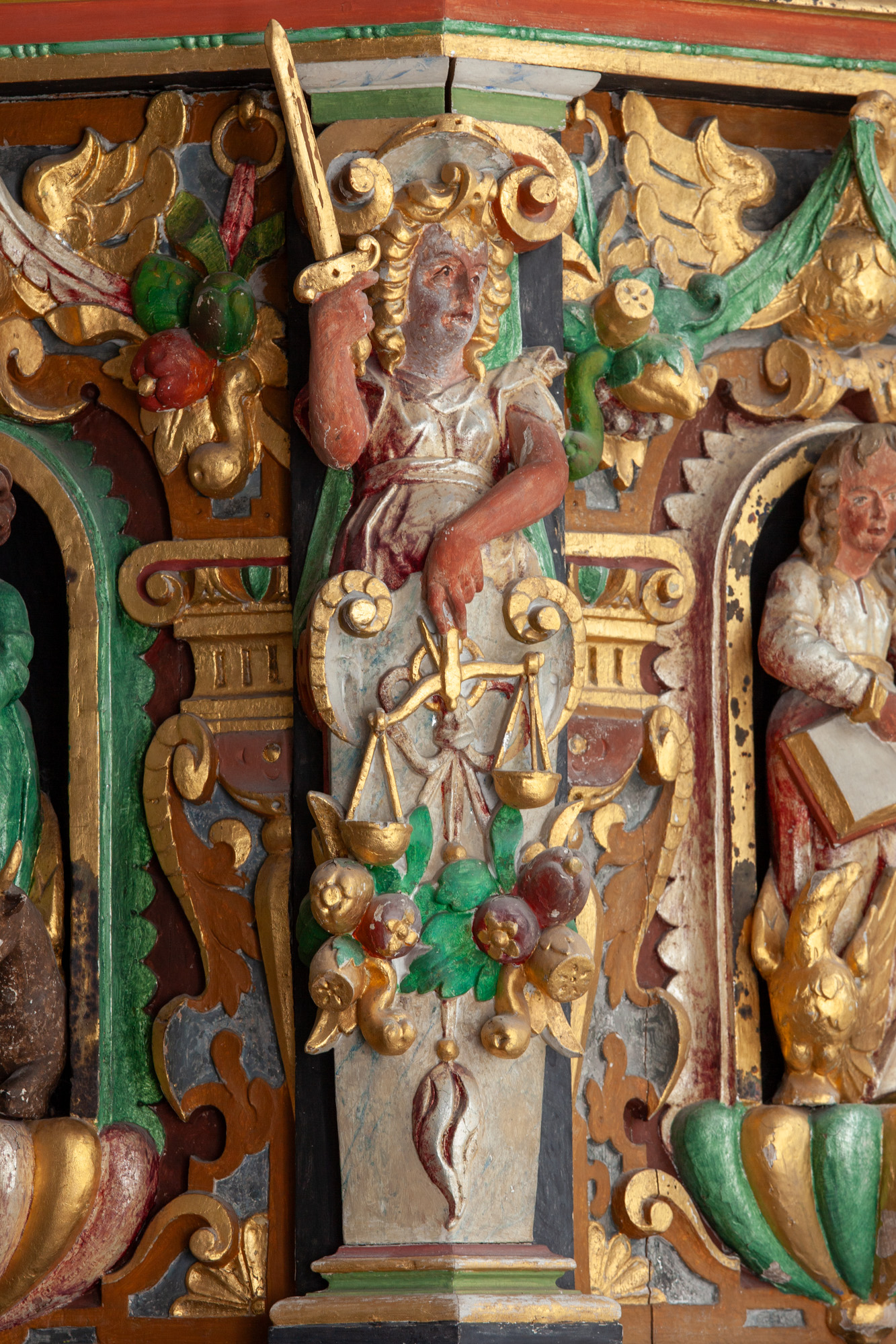 På hjørnerne står der dyder. Den første har mistet sin attribut, men ellers er det Spes, Caritas, Justitia og Fortitudo.