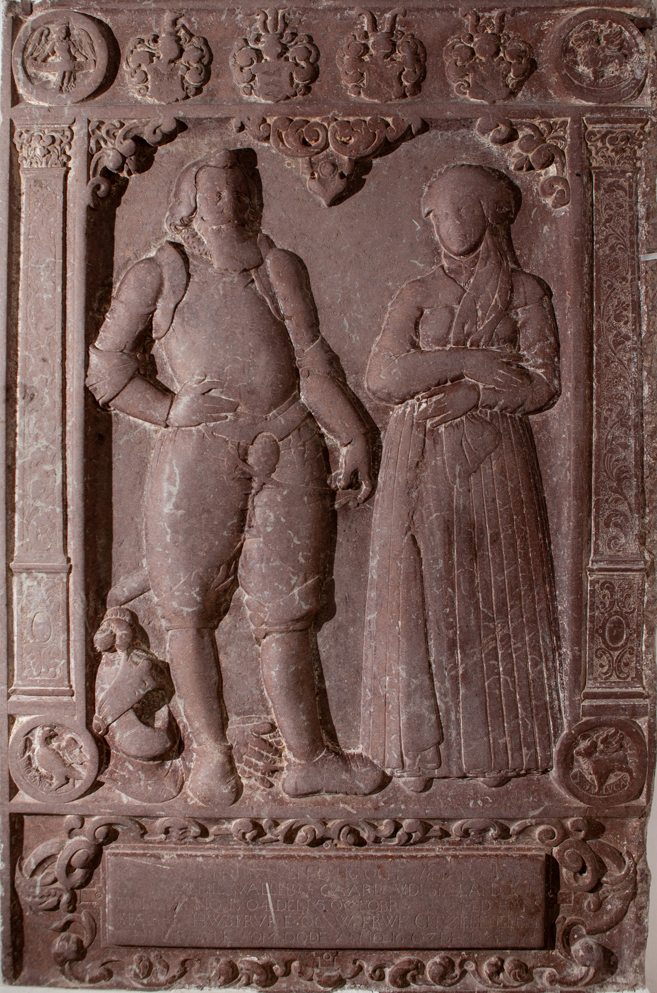 Det er en sen anvendelse af buer over personerne. Pilastrene står på en høj sokkel, og de nederste evangelistsymboler er anbragt over soklen. Mellem de to øverste evangelistsymboler er fire hjelmede våbenskjold. Han er iført rustning, hjelm med visir samt handsker ligger ved hans fødder. Med venstre hånd holder han på skæftet på sit sværd. Hun er iført en lang kjole og holder hænderne foran livet. Både buerne udgøres delvist af bruskbarok, og udsmykningen omkring tekstfeltet i soklen består udelukkende af bruskbarok.