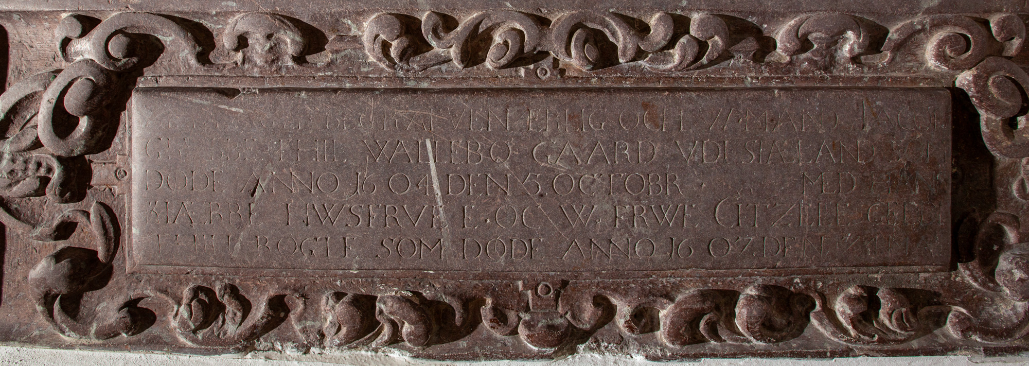 … begrafven erlig och w. mand Jacob Grubbe thil Wallebo gaard udi Siæland som døde anno 1604 den 5. octobr - med hans kiærre hwsfrue e. oc w. frwe Citzele Geddi thil Røgle som døde anno 1607 den 24. maj.