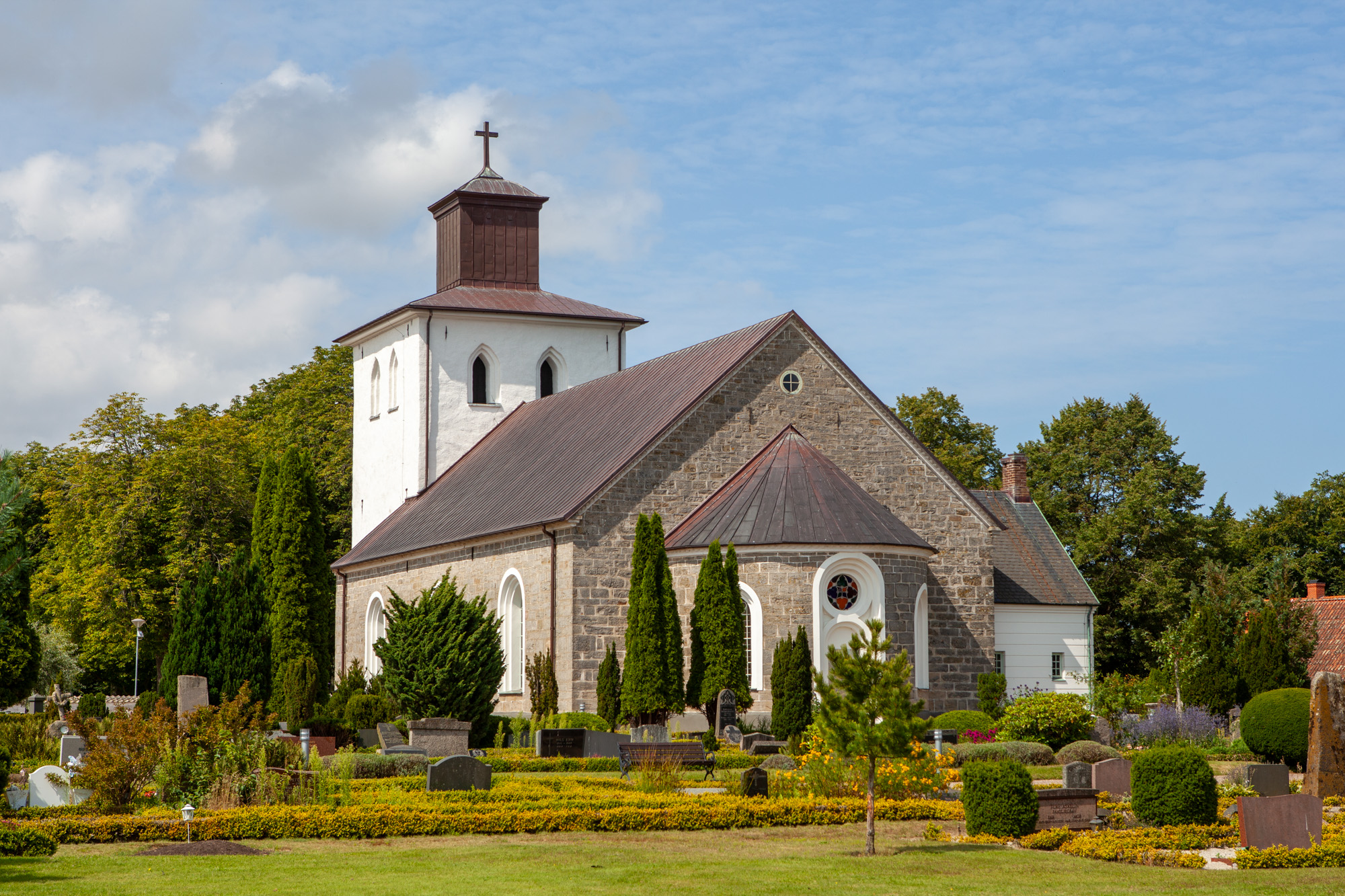 Den romanske kirke fra senest omkring 1200 bestod af skib, kor og apsis. Den var opført af nordvestskånsk sandsten. Soklen var profileret, og syddøren havde doriske søjler og en bue af sandsten. På et ukendt tidspunkt skal skibet være forlænget mod vest. I 1400-tallet blev der bygget et vesttårn med samme bredde som skibet. En stor spidsbuet åbning forbandt tårnrum og skib. På tårnets anden etage på nordsiden var en indgang sikkert via en udvendig trætrappe. Den blev senere skiftet ud med et trappetårn med vindeltrappe. Loftet var fladt bjælkeloft, og væggene havde kalkmalerier. En gang i 1400-tallet blev loftet udskiftet med hvælvinger: tre i skibet og et i koret. De blev udsmykket med kalkmalerier. Der blev også opført et våbenhus på skibets sydside. 1818-1820 blev tårnet ændret til sit nuværende udseende, hvor det blandt andet blev forhøjet med 1 meter. Før ombygningen havde tårnet gavle med kamtakker mod øst og vest og blændinger i gavlene. Det udvendige trappetårn og våbenhuset blev revet ned. En indvendig trappe blev lavet, og indgangen blev flyttet til tårnets vestside.