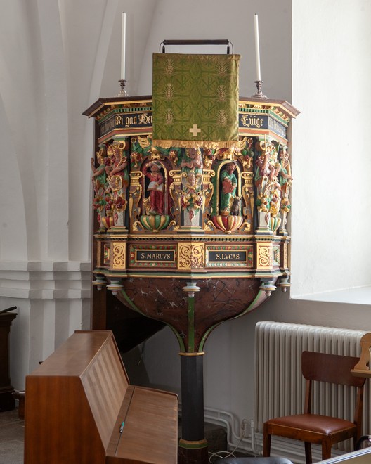 Storfelterne har en påfaldende lighed med storfelterne på prædikestolen i Ysby / Øsby, som er fra 1620. Dyderne ligner også. Prædikestolen i Ysby har bevaret sin trappeopgang med portal. Ligesom her har portalen et tekstfelt.