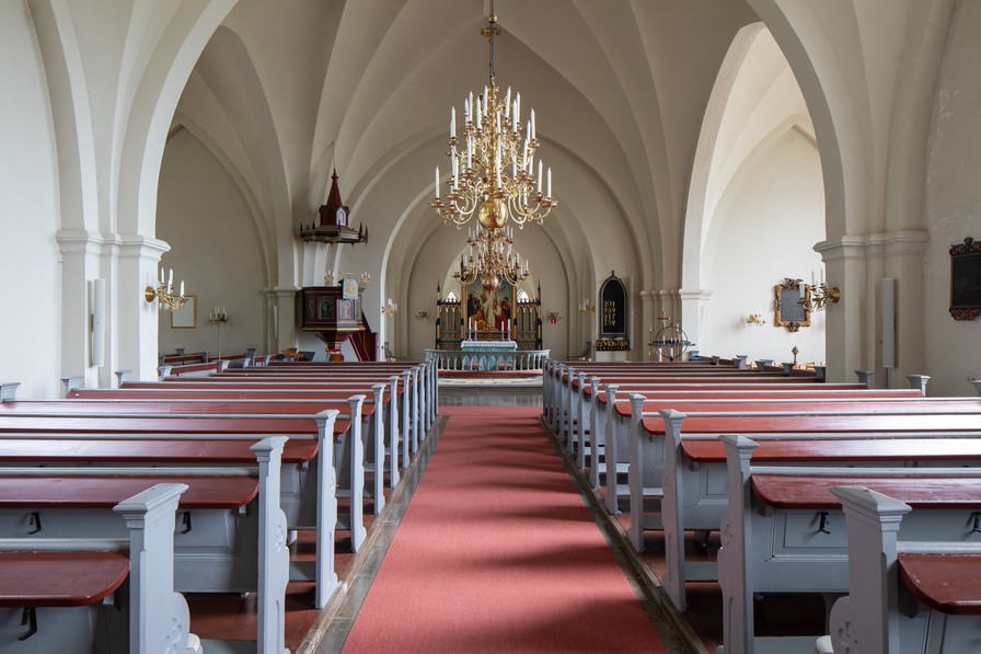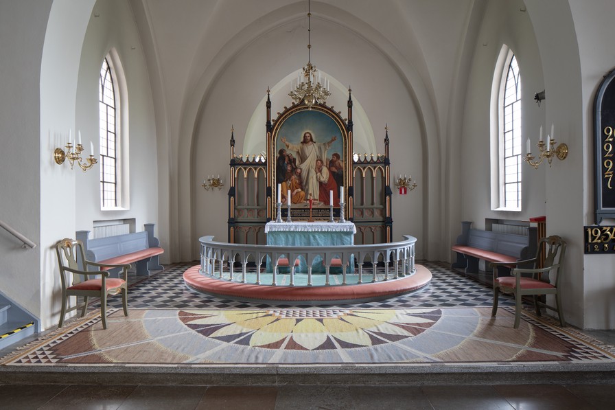 Alterbordet står 60 cm fra apsisvæggen. Der er ligeledes spor af to sidealtre i skibets to østhjørner.