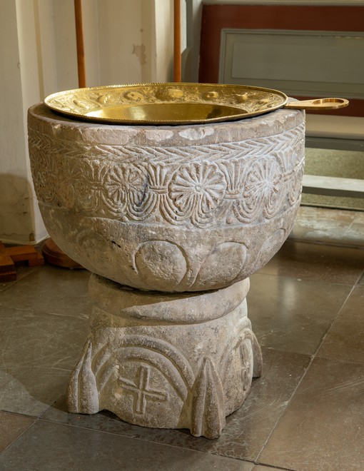 Døbefonten er af sandsten, og den er forsynet med både fals og udtømningshul. Den tilhører Tørløsegruppen. Kummen har en palmettefrise med en tovstav øverst. Brede bægerblade udgår fra bunden.