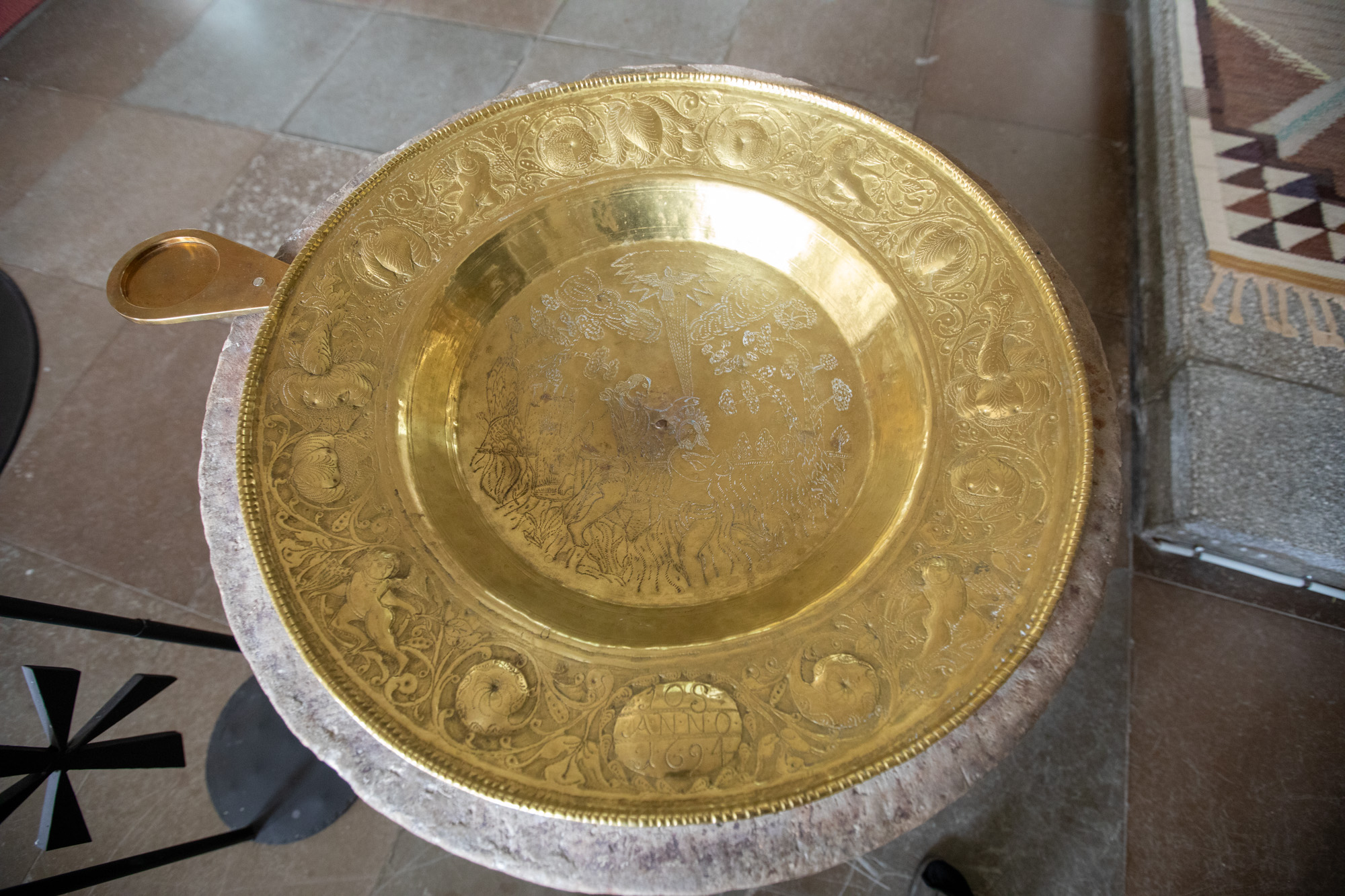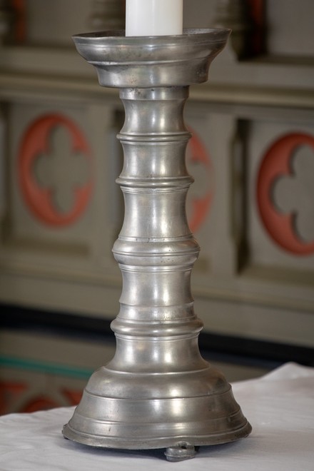 På foden er der dobbelt buslag, som indeholder en lilje, en rose, et ligearmet kors, men ingenting på den fjerde side.