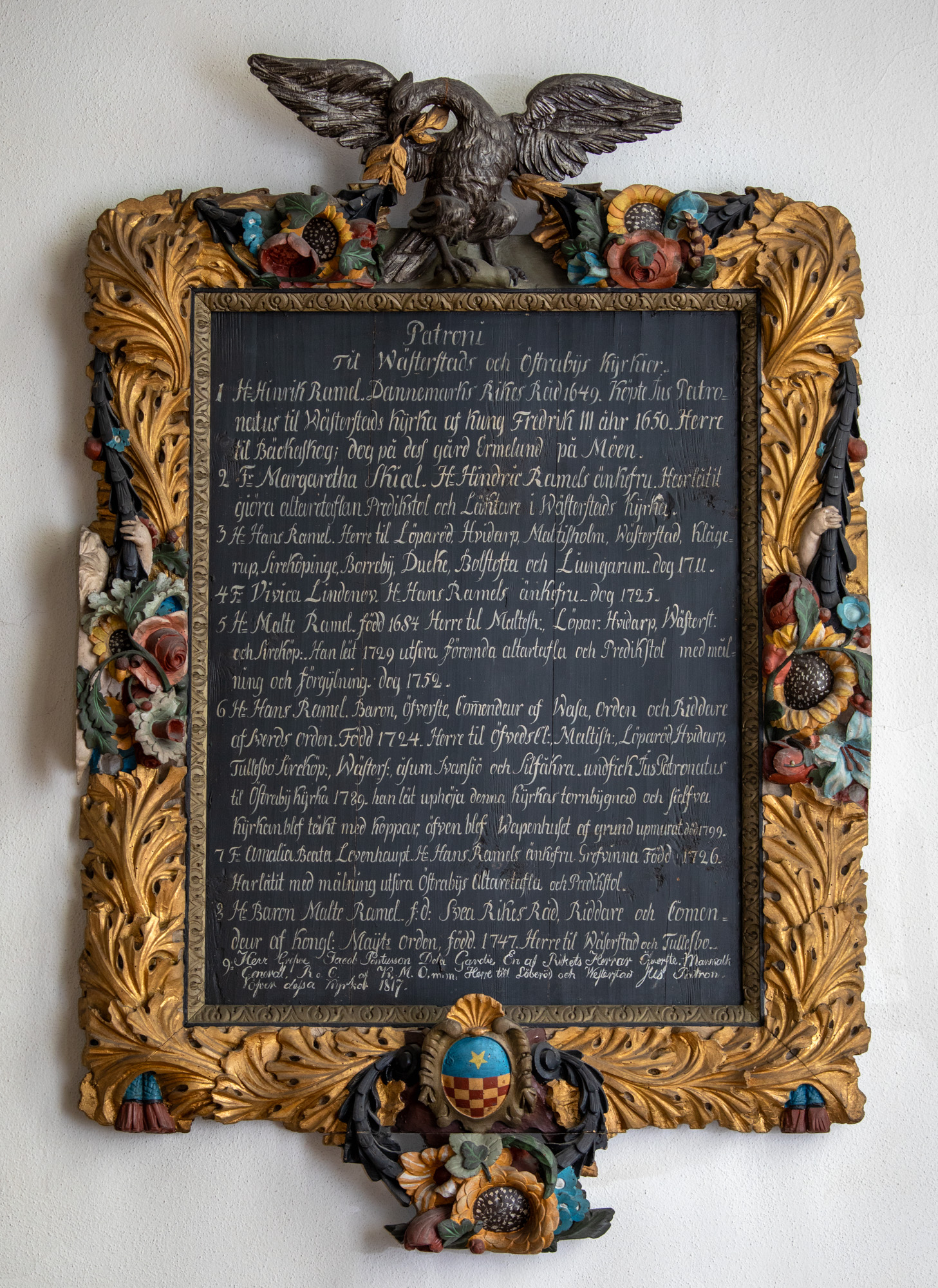 I kirken hænger en tavle over Vestersted og Østerby kirkers ejere og patroner fra 1650 til 1817.