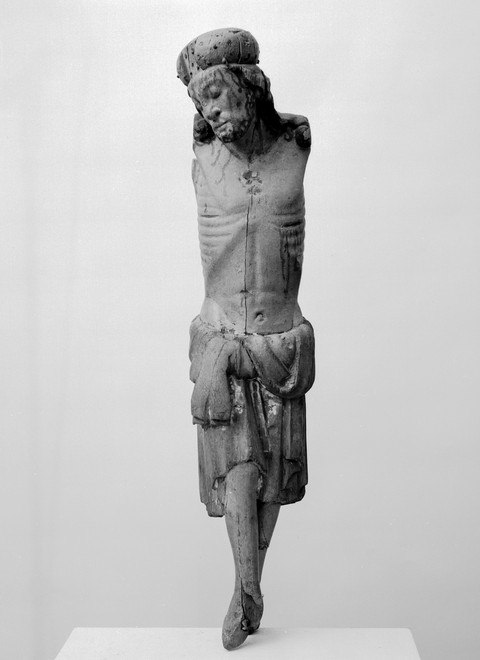 Hovedet er drejet til højre og hælder forover. Den oprindelige krone er senere ændre til en tornekrone. Lændeklædet er knælangt. Højre fod er lagt ind over venstre.