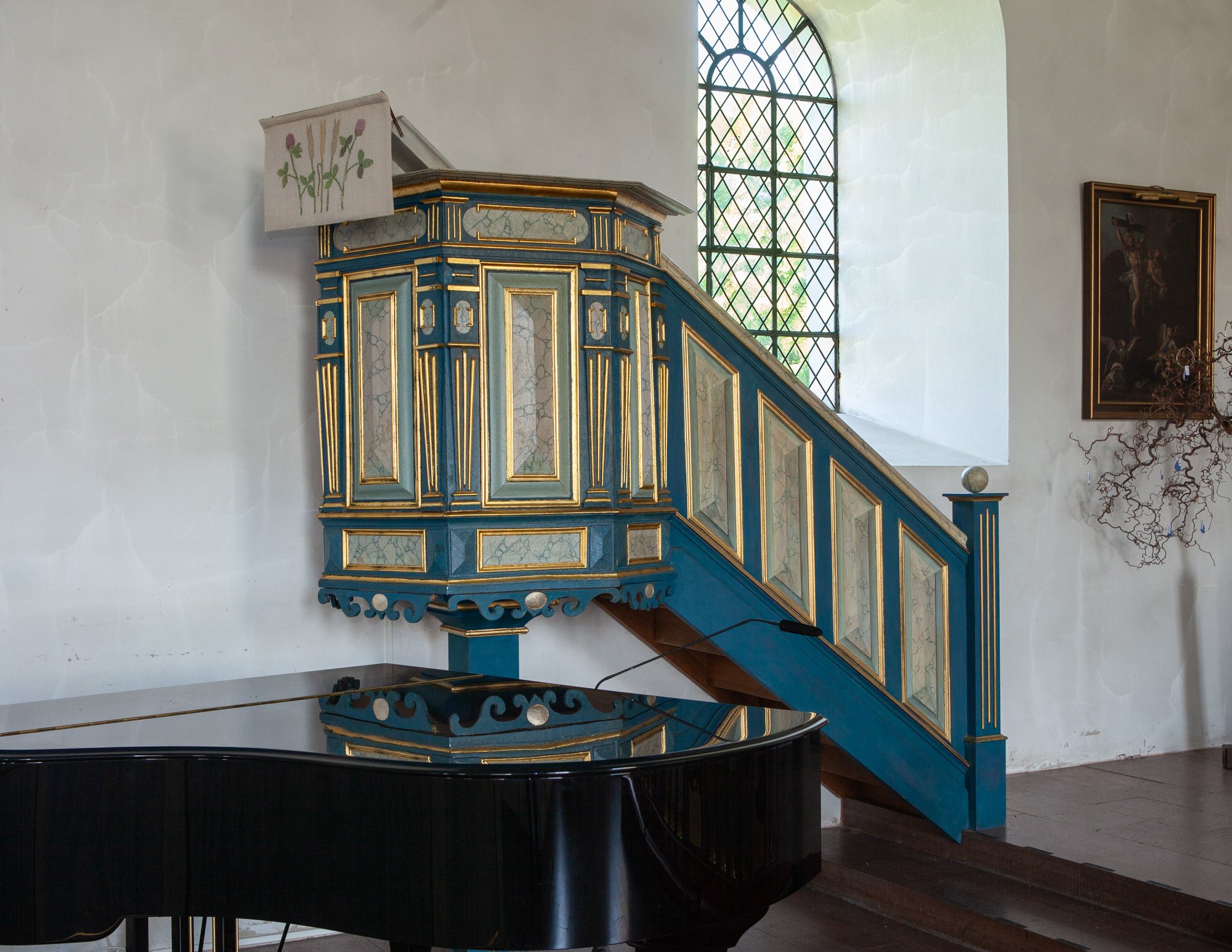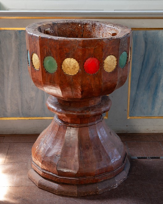 Døbefonten er udført af ét stykke egetræ omkring år 1600. Der findes ikke nogen middelalderlig døbefont.