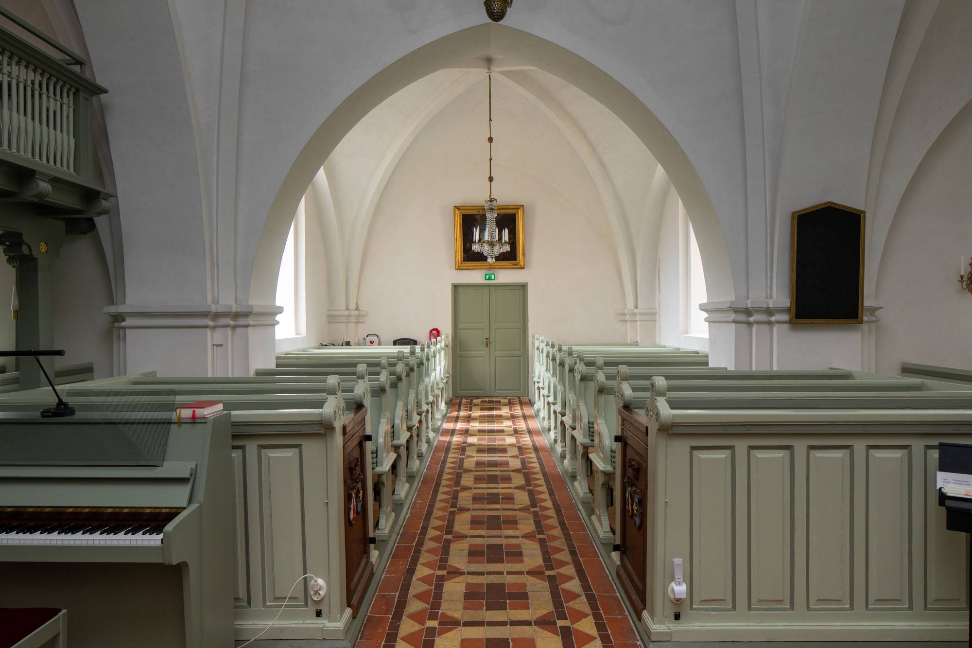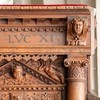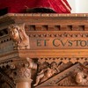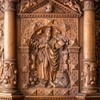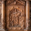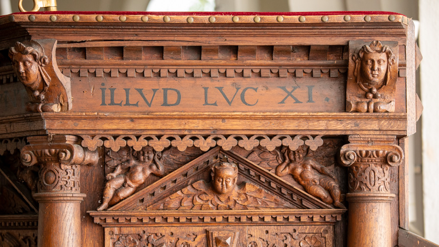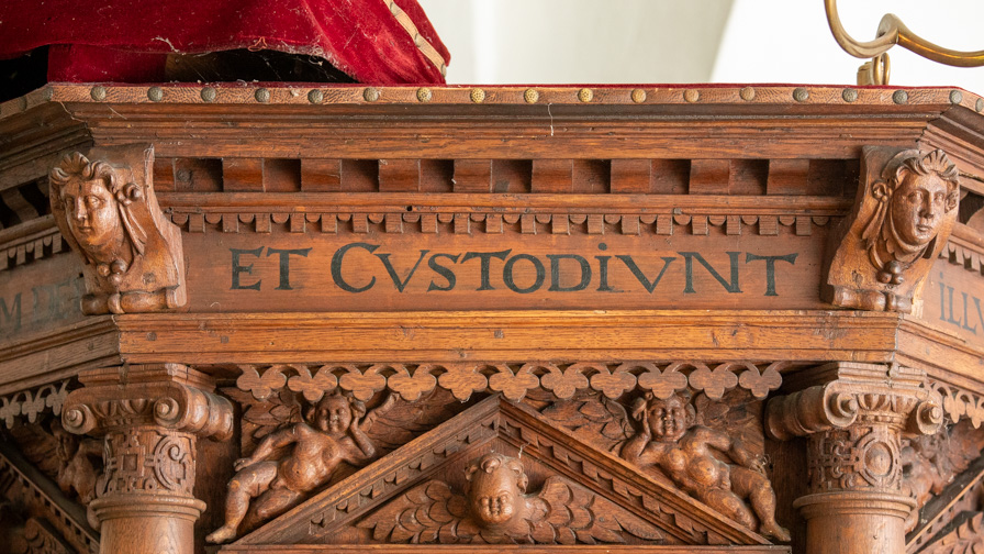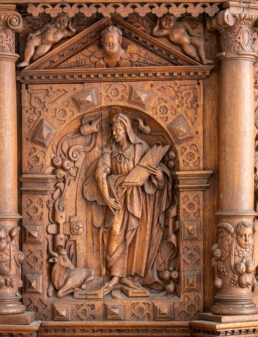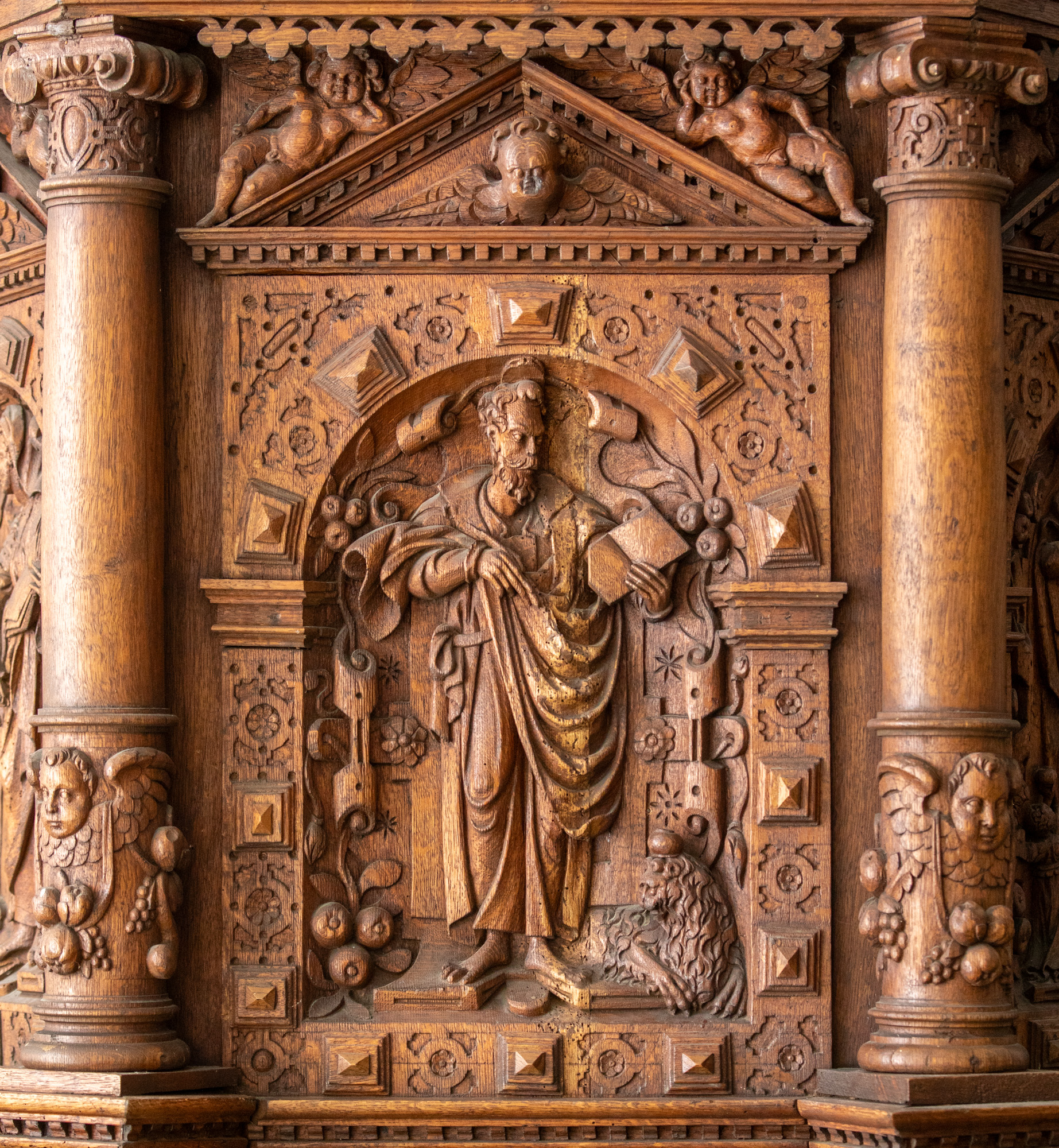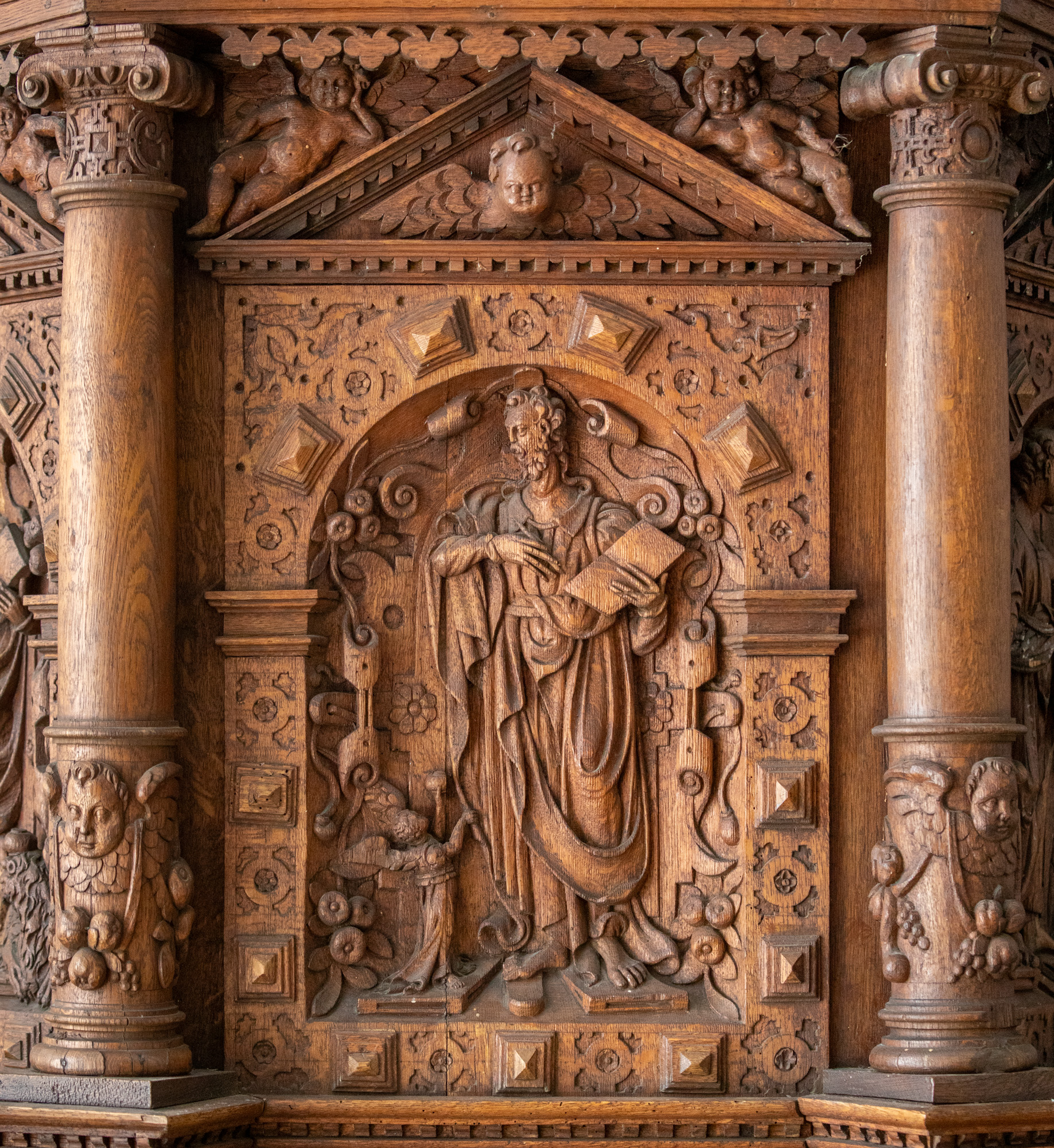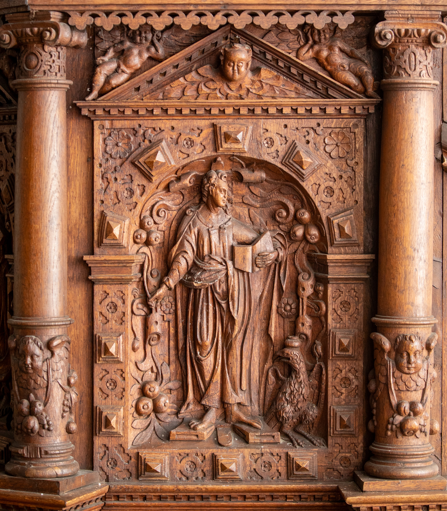 Evangelisterne pryder storfelterne, hvor figurerne er indrammet af en rundbue med diamanter og beslagornamentik. Felterne afsluttes for oven af et gavlfelt med et englehoved og hvilende putti i sviklerne. På hjørnerne står fritstående søjler med glatte skafter, joniske kapitæler og prydbælter med engle og frugtklaser. Søjlerne hviler på konsoller med diamanter på siderne og løvemasker for forsiden.