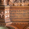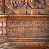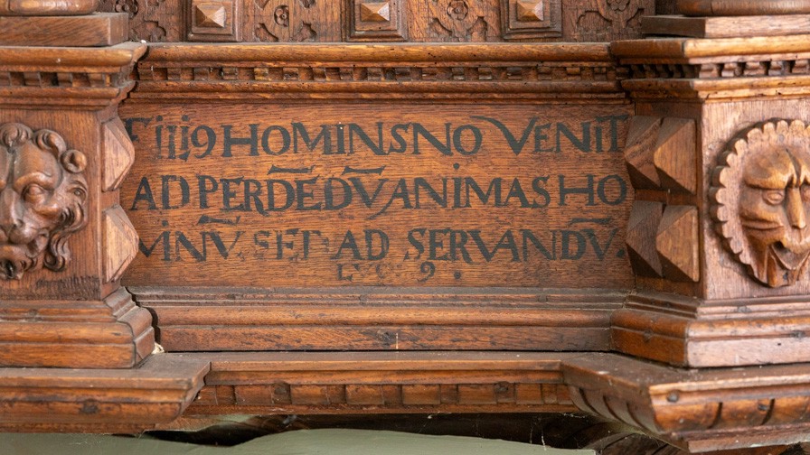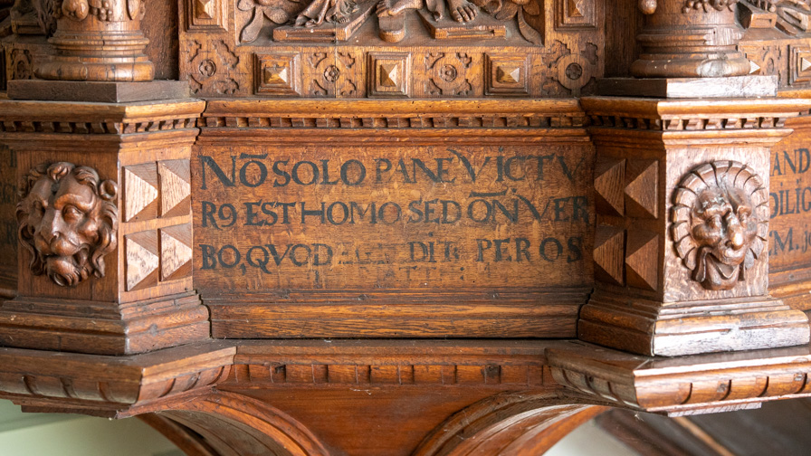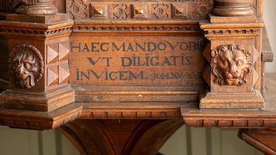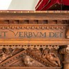 De nederste smalfelter har citater fra evangelisten ovenfor. Der er mange sammentrækninger af ord i teksterne.