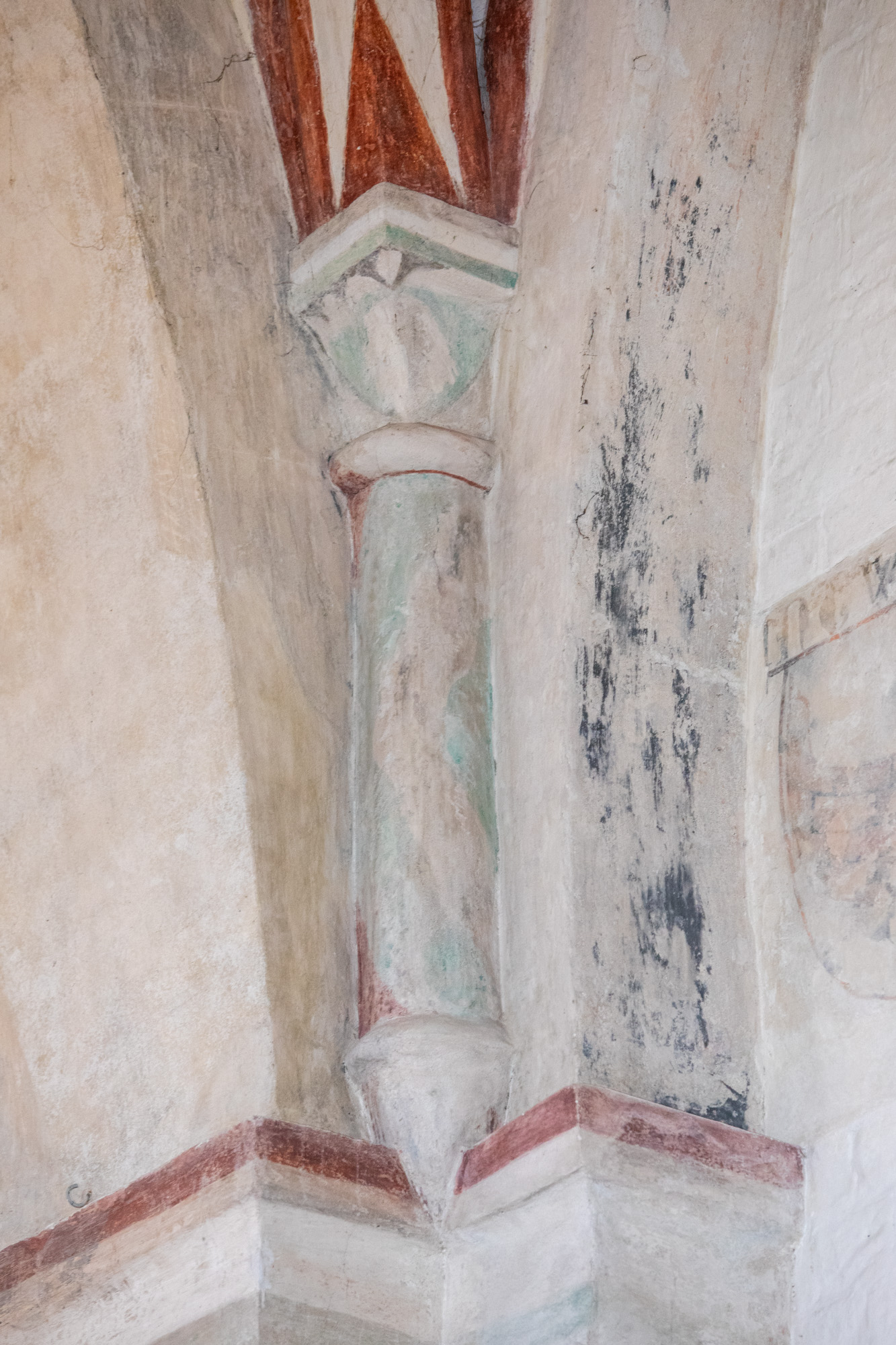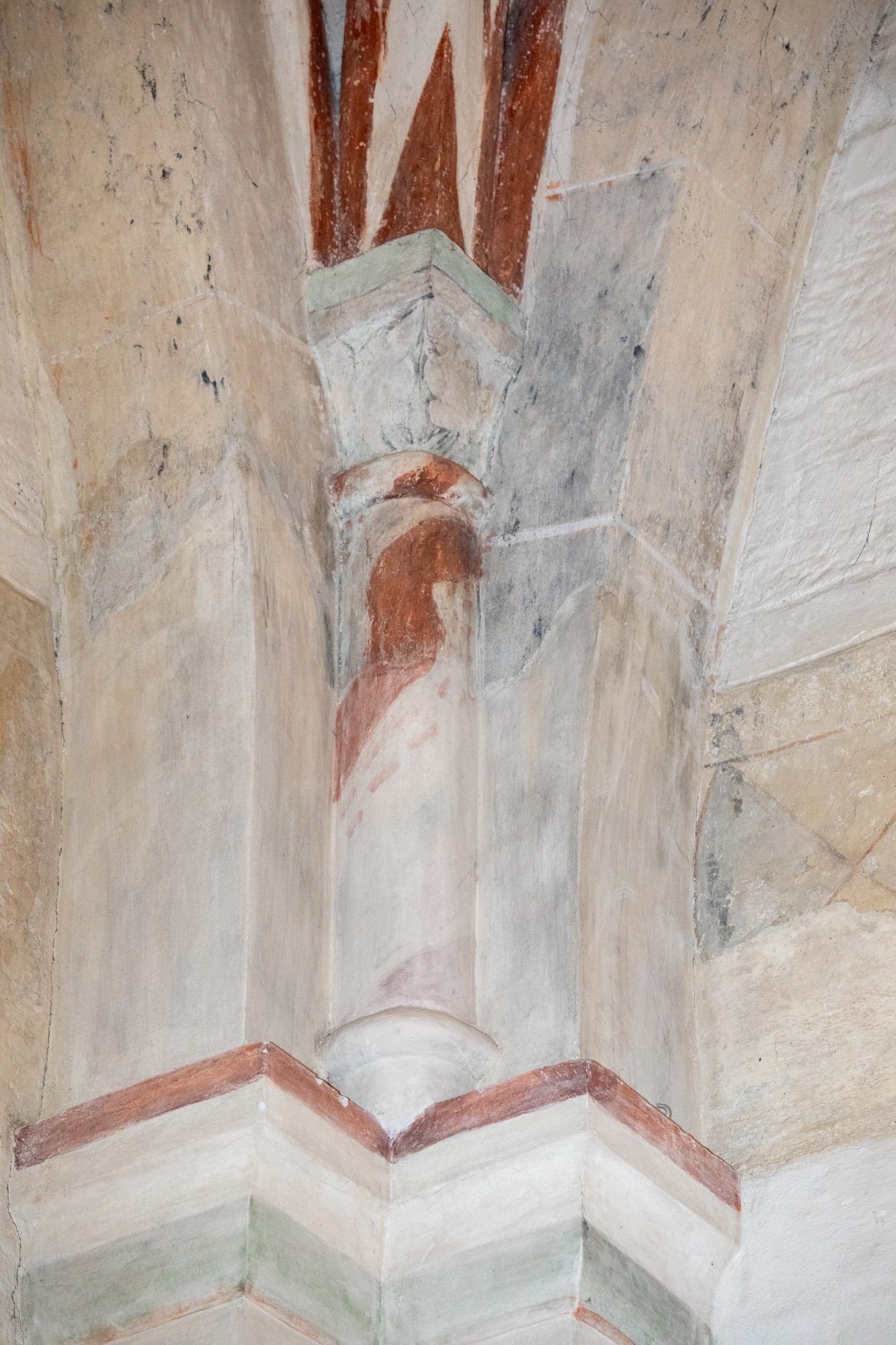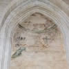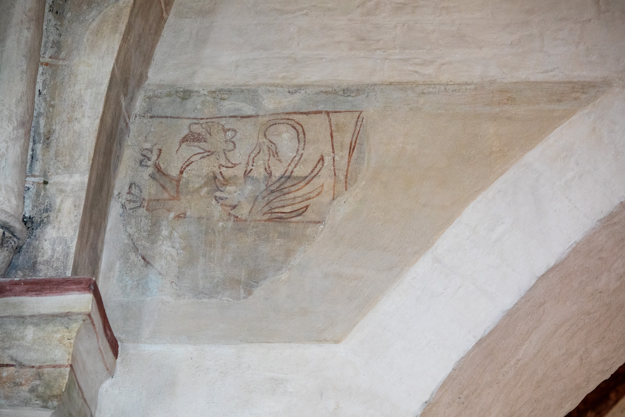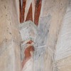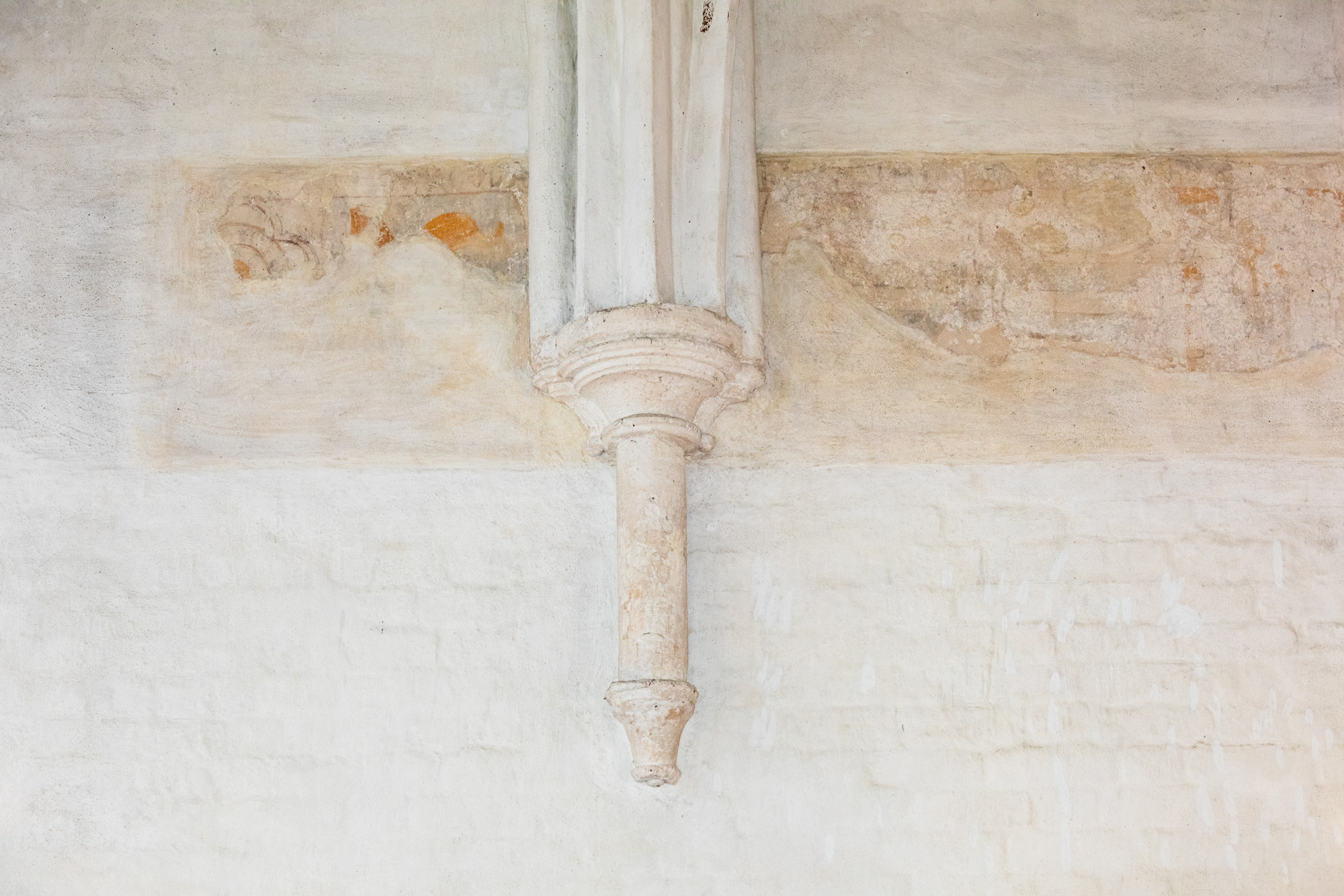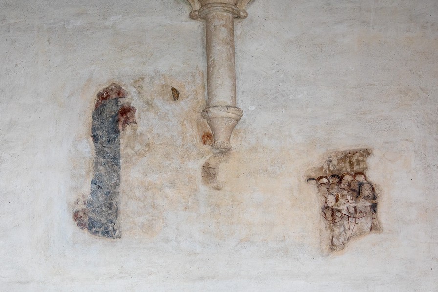 Koret, nordvæg. Til højre for ribbekonsollen ses en gruppe mennesker. Motivet er muligvis Verdensdommen. Til venstre for konsollen ses en stående person og nogle farvepletter. Det kan have hørt til Verdensdommen.