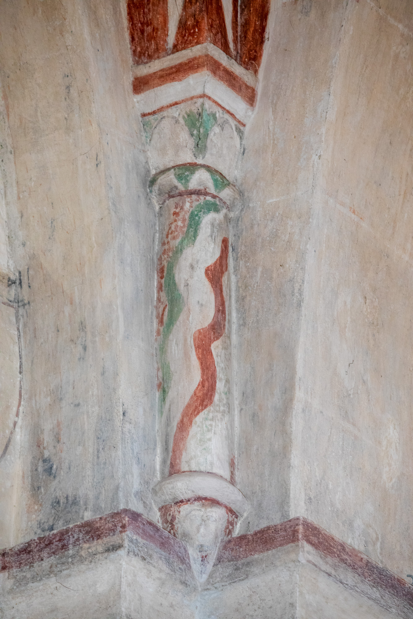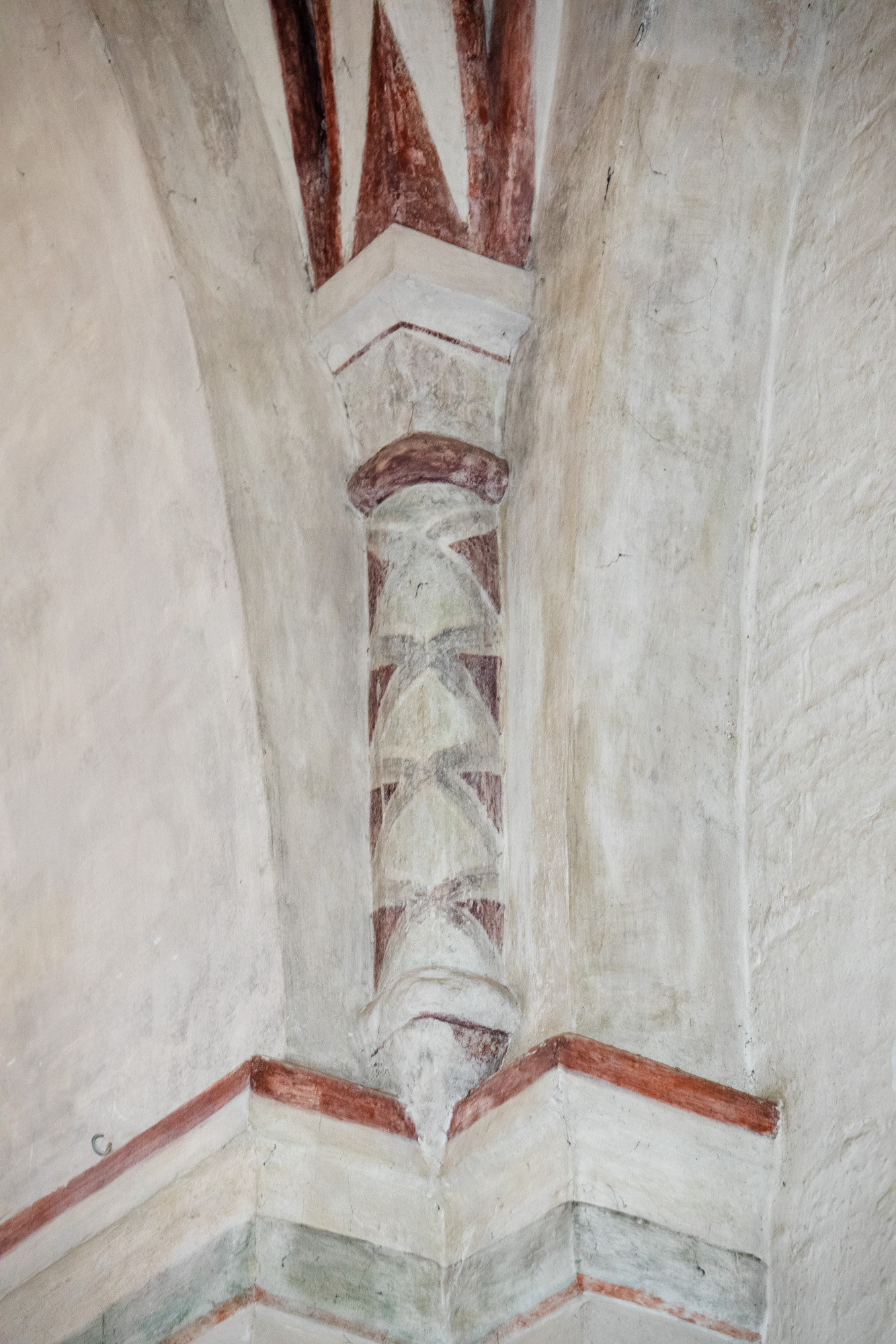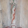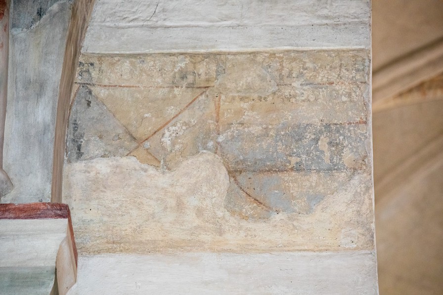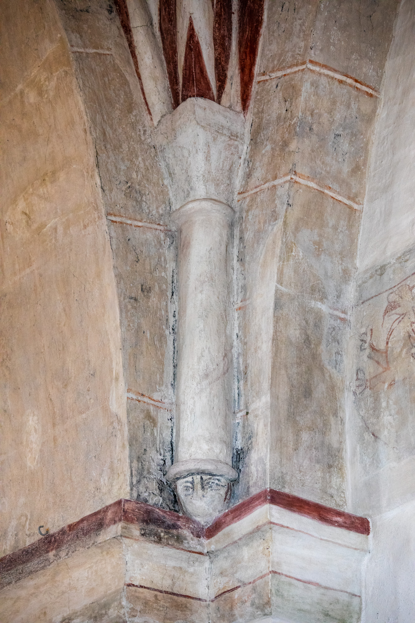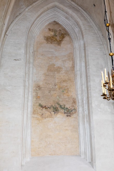 Koret, nordvæg. Til højre for ribbekonsollen ses en gruppe mennesker. Motivet er muligvis Verdensdommen. Til venstre for konsollen ses en stående person og nogle farvepletter. Det kan have hørt til Verdensdommen.
