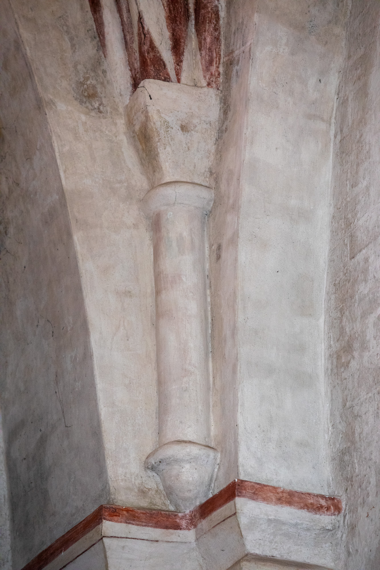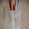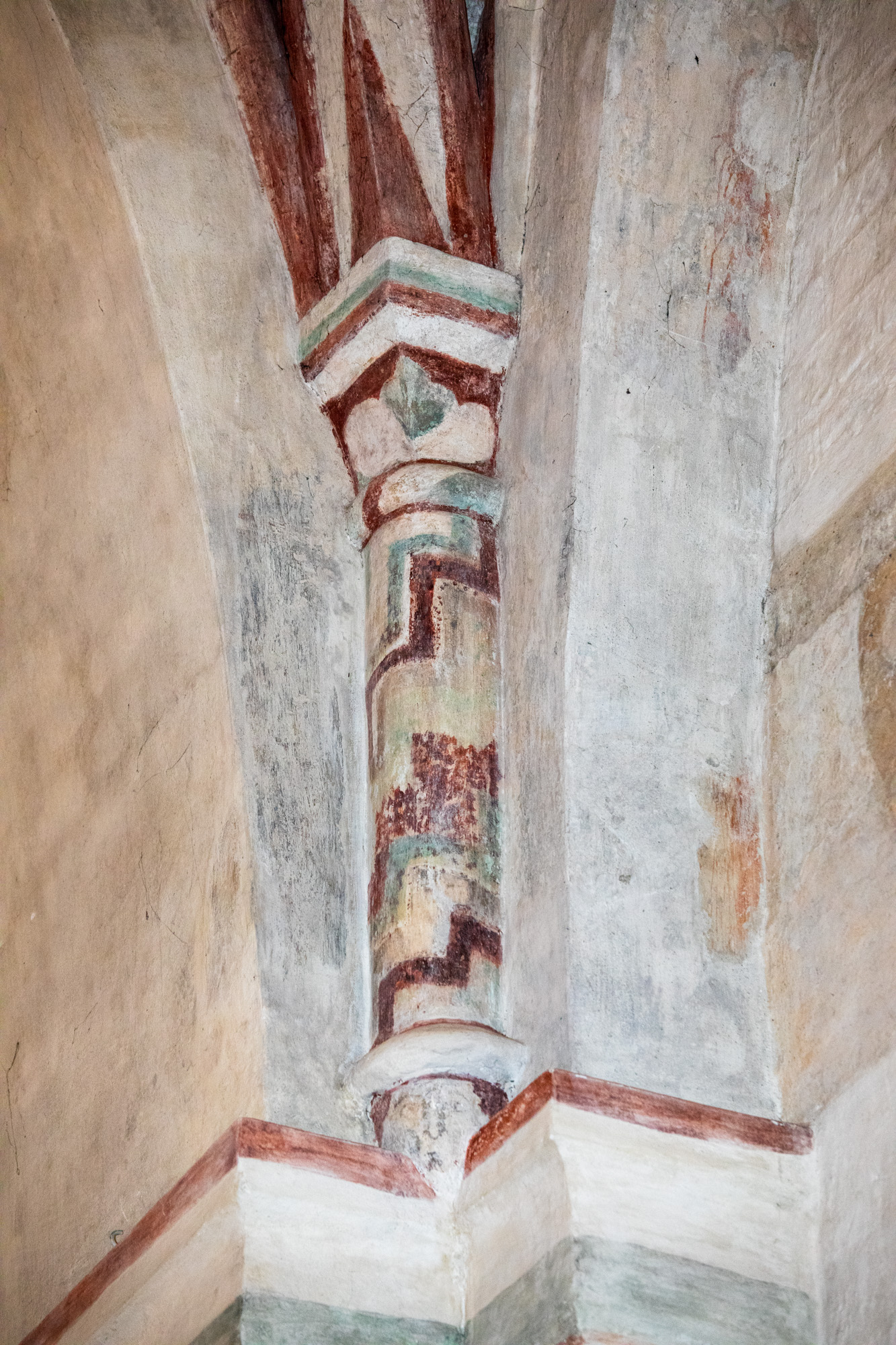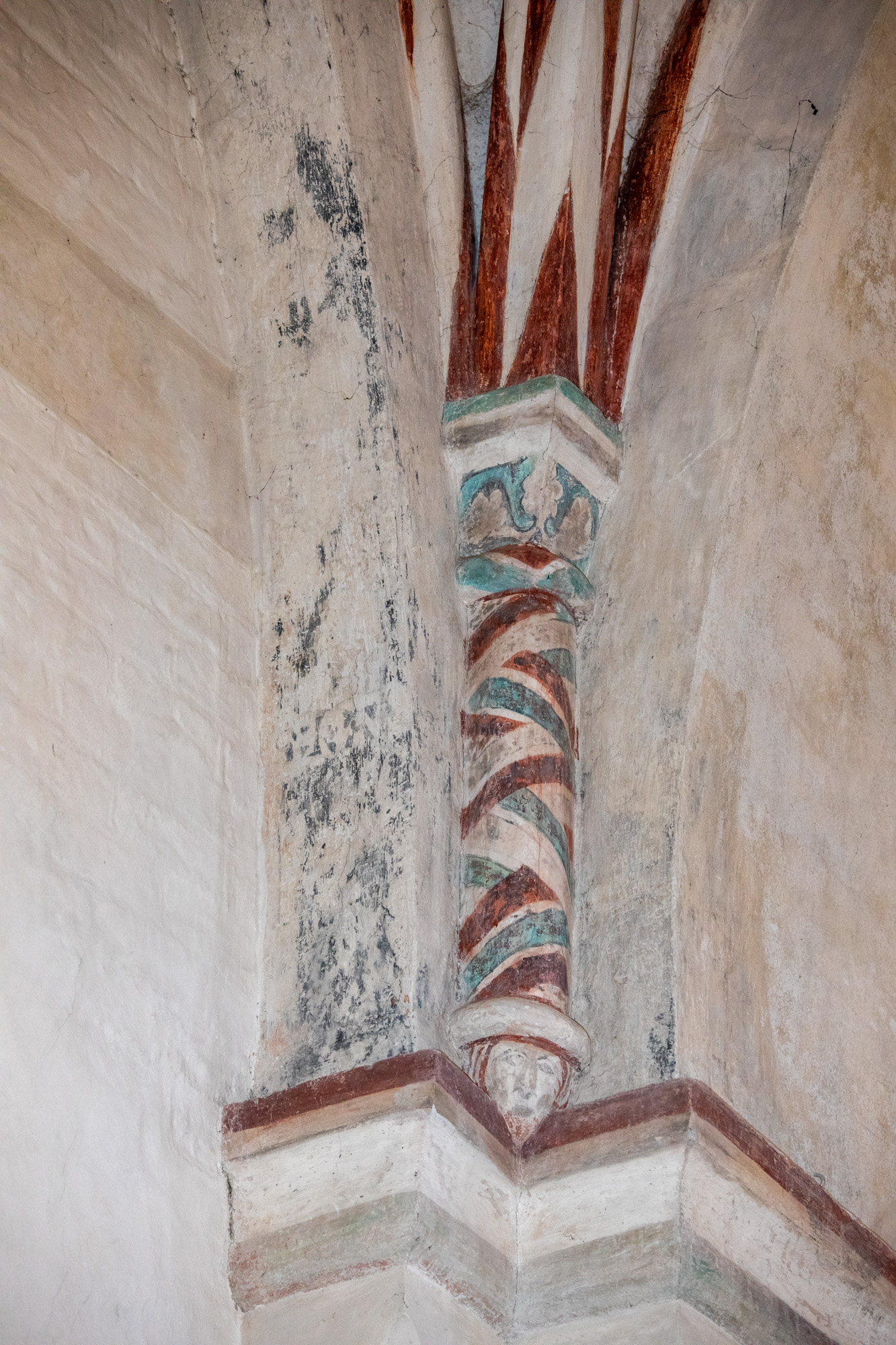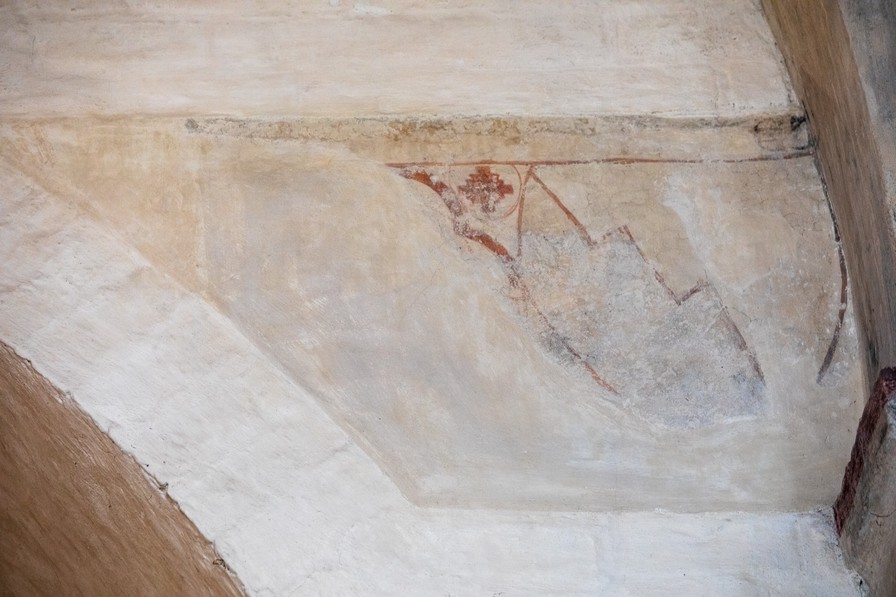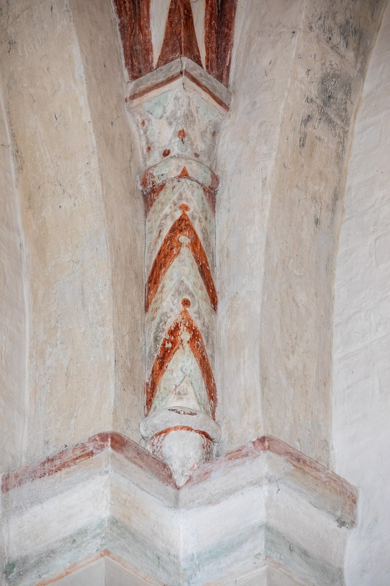 Koret, nordvæg. Til højre for ribbekonsollen ses en gruppe mennesker. Motivet er muligvis Verdensdommen. Til venstre for konsollen ses en stående person og nogle farvepletter. Det kan have hørt til Verdensdommen.