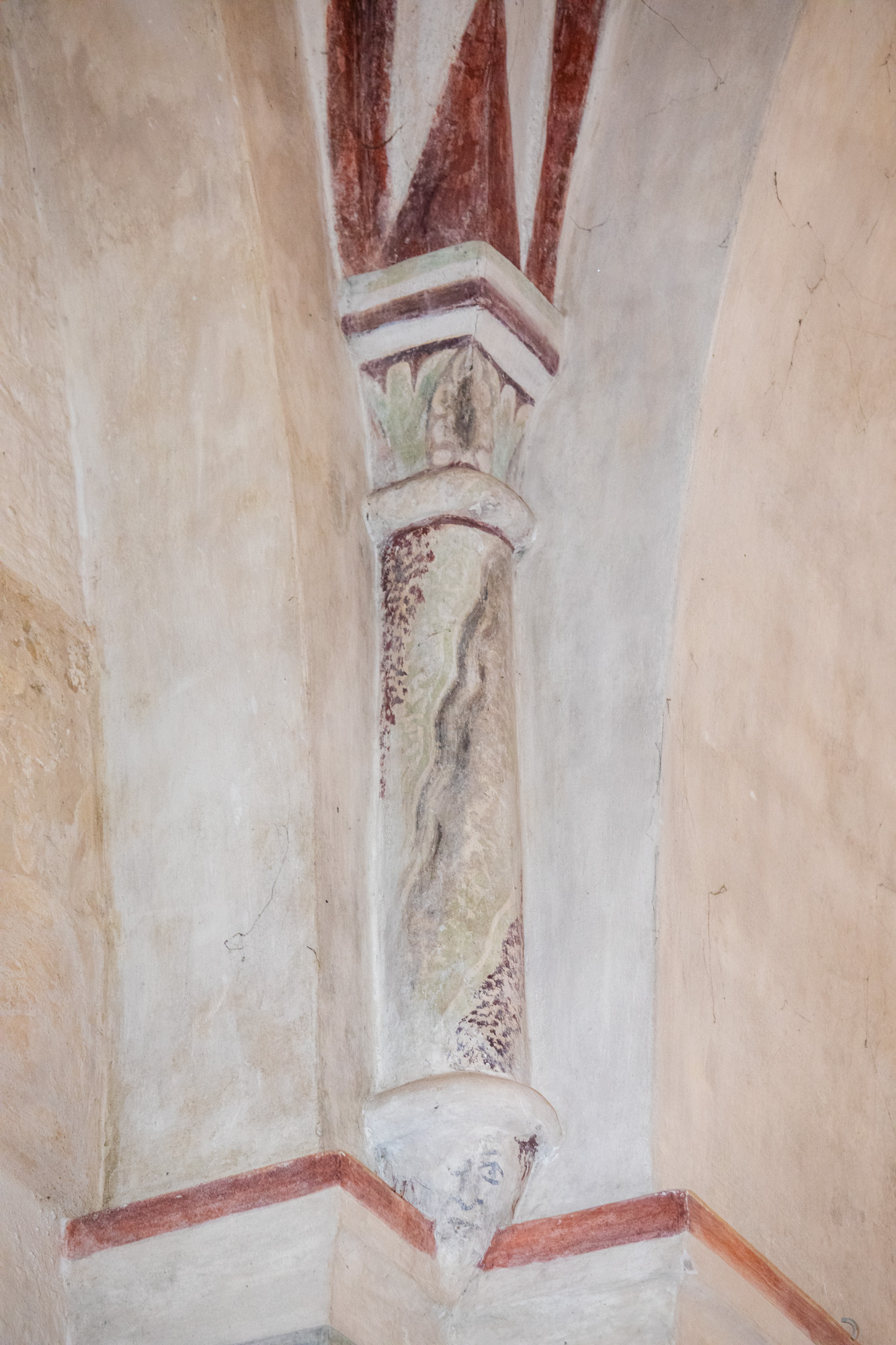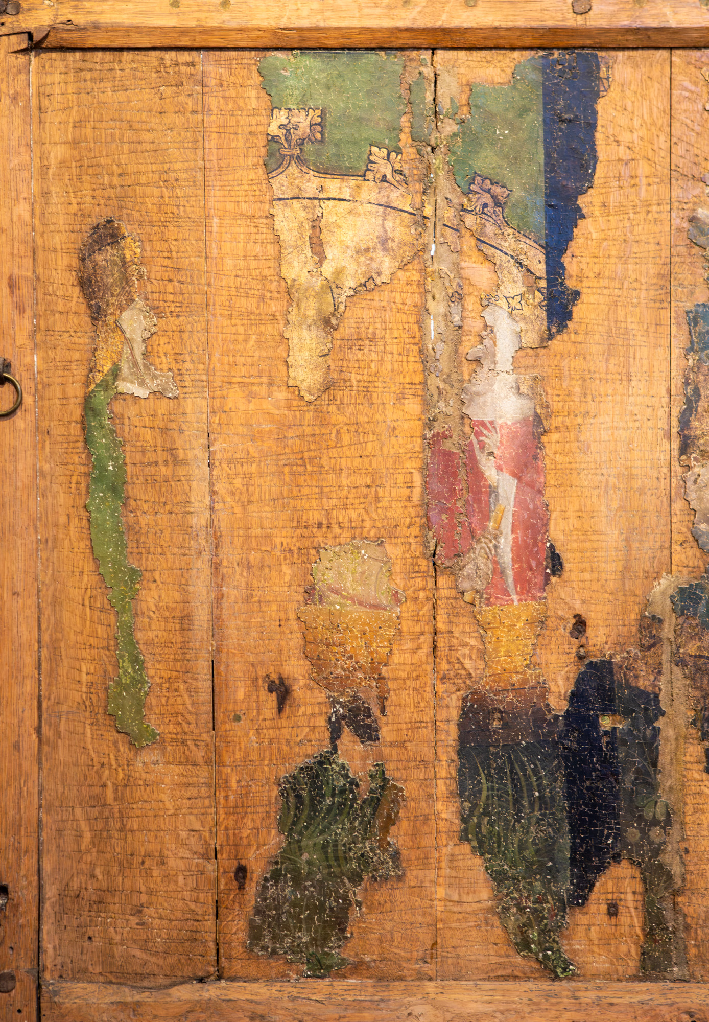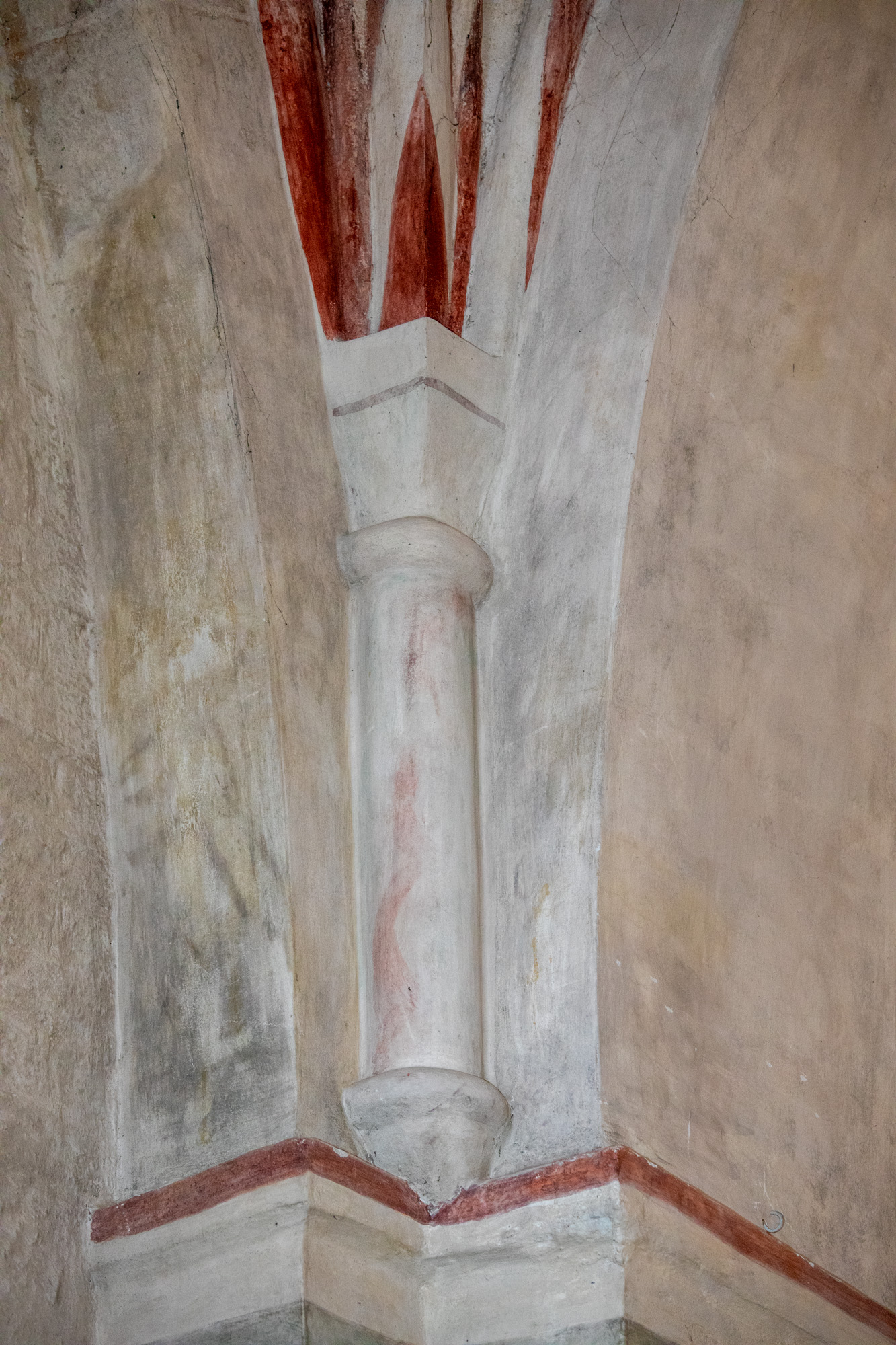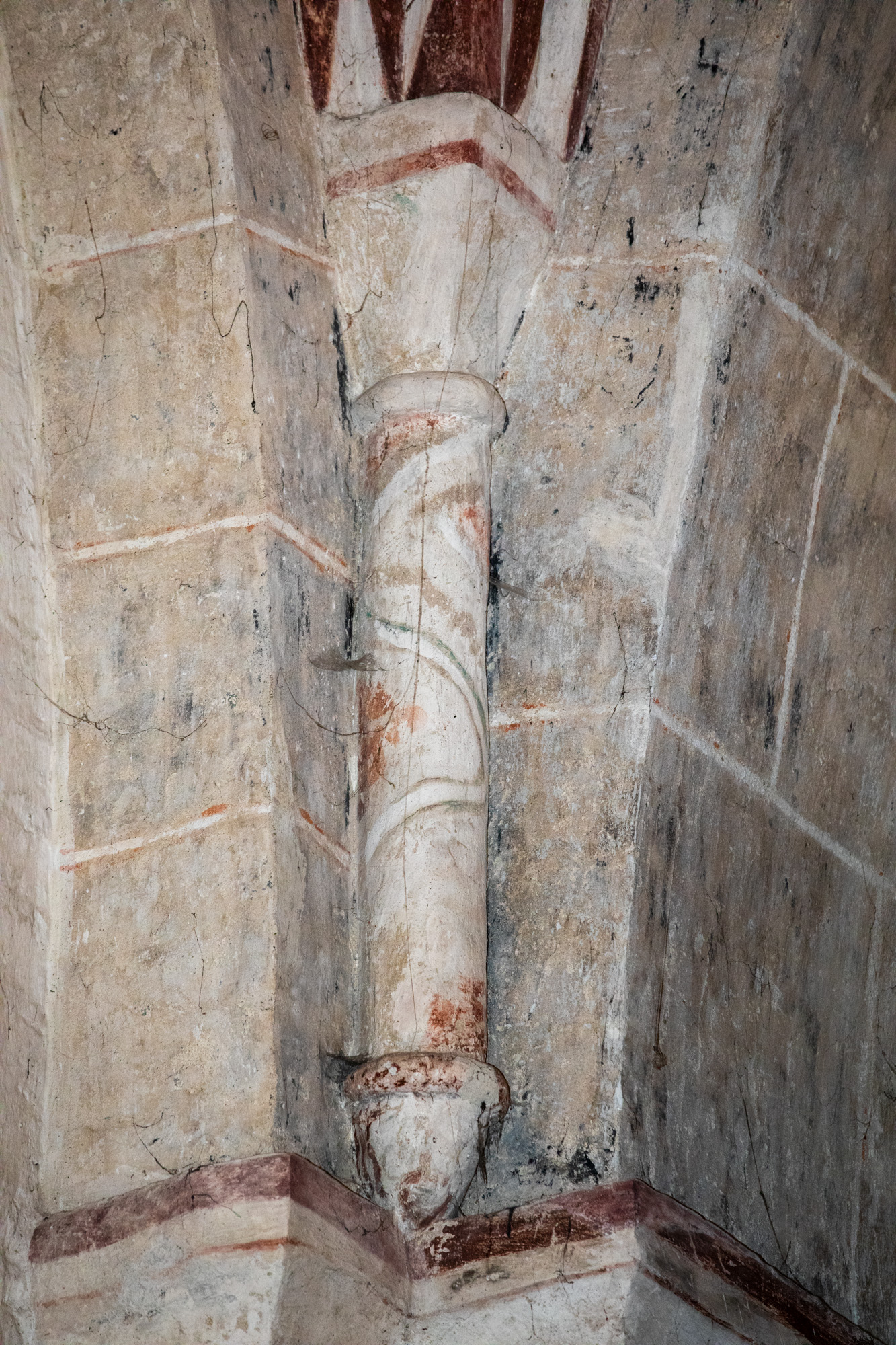Koret, nordvæg. Til højre for ribbekonsollen ses en gruppe mennesker. Motivet er muligvis Verdensdommen. Til venstre for konsollen ses en stående person og nogle farvepletter. Det kan have hørt til Verdensdommen.