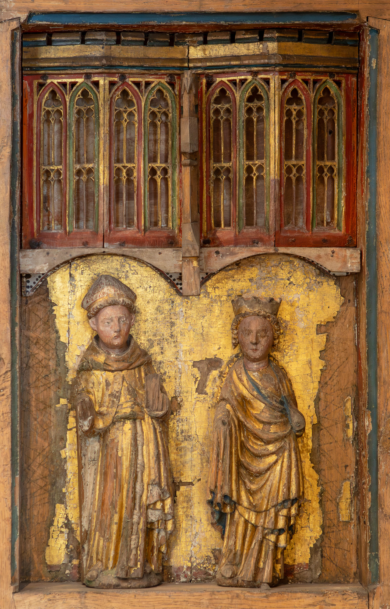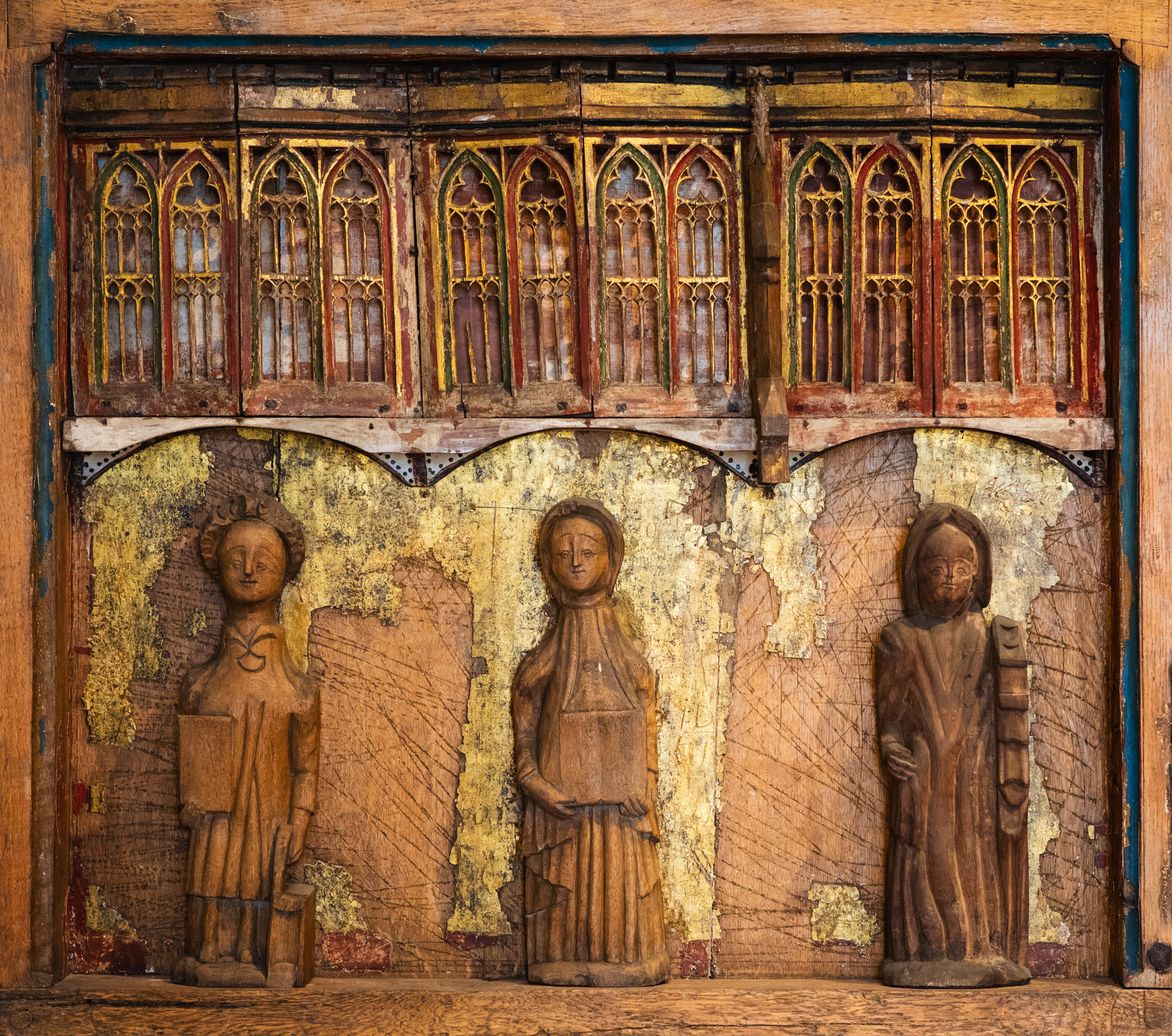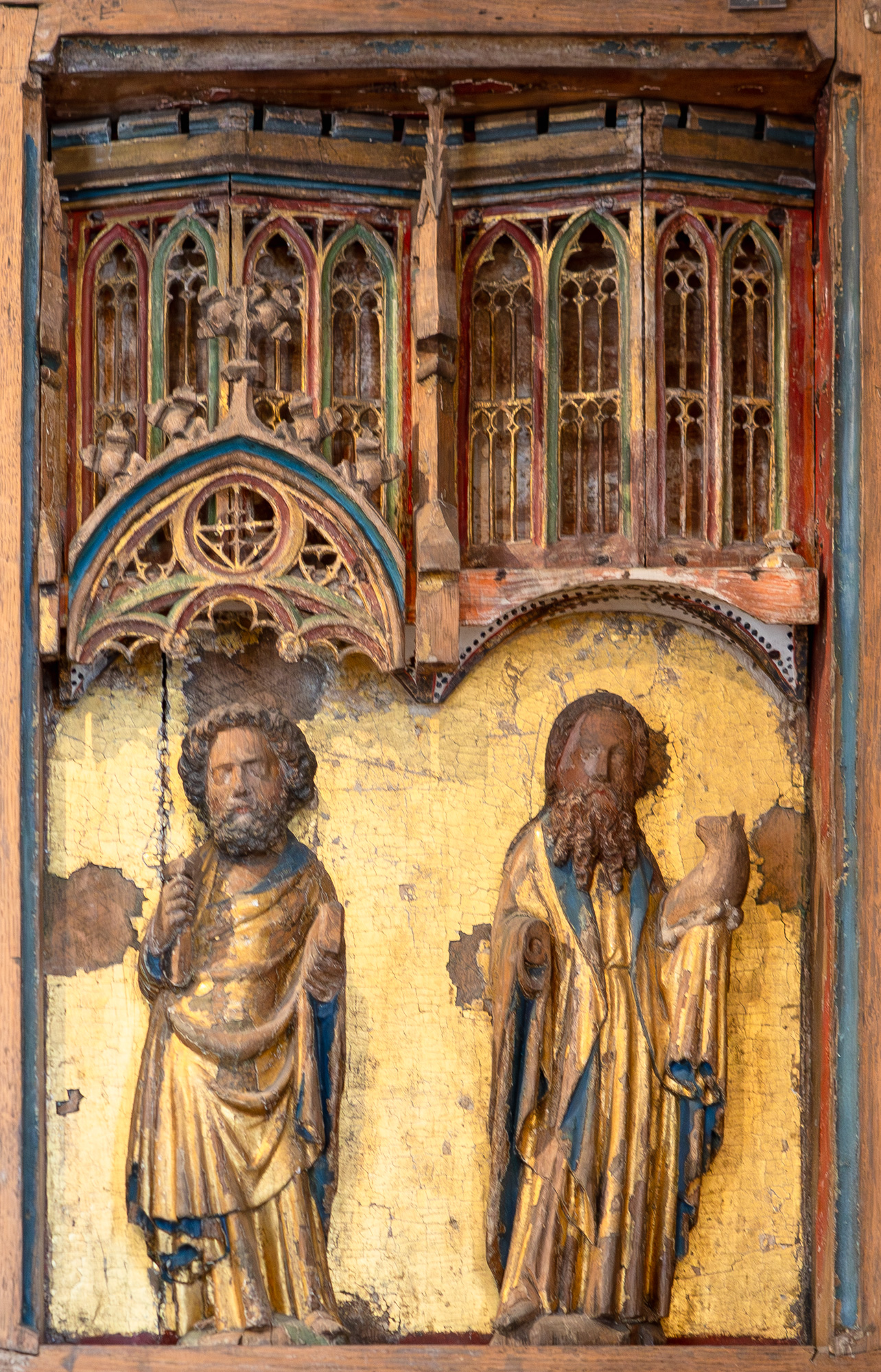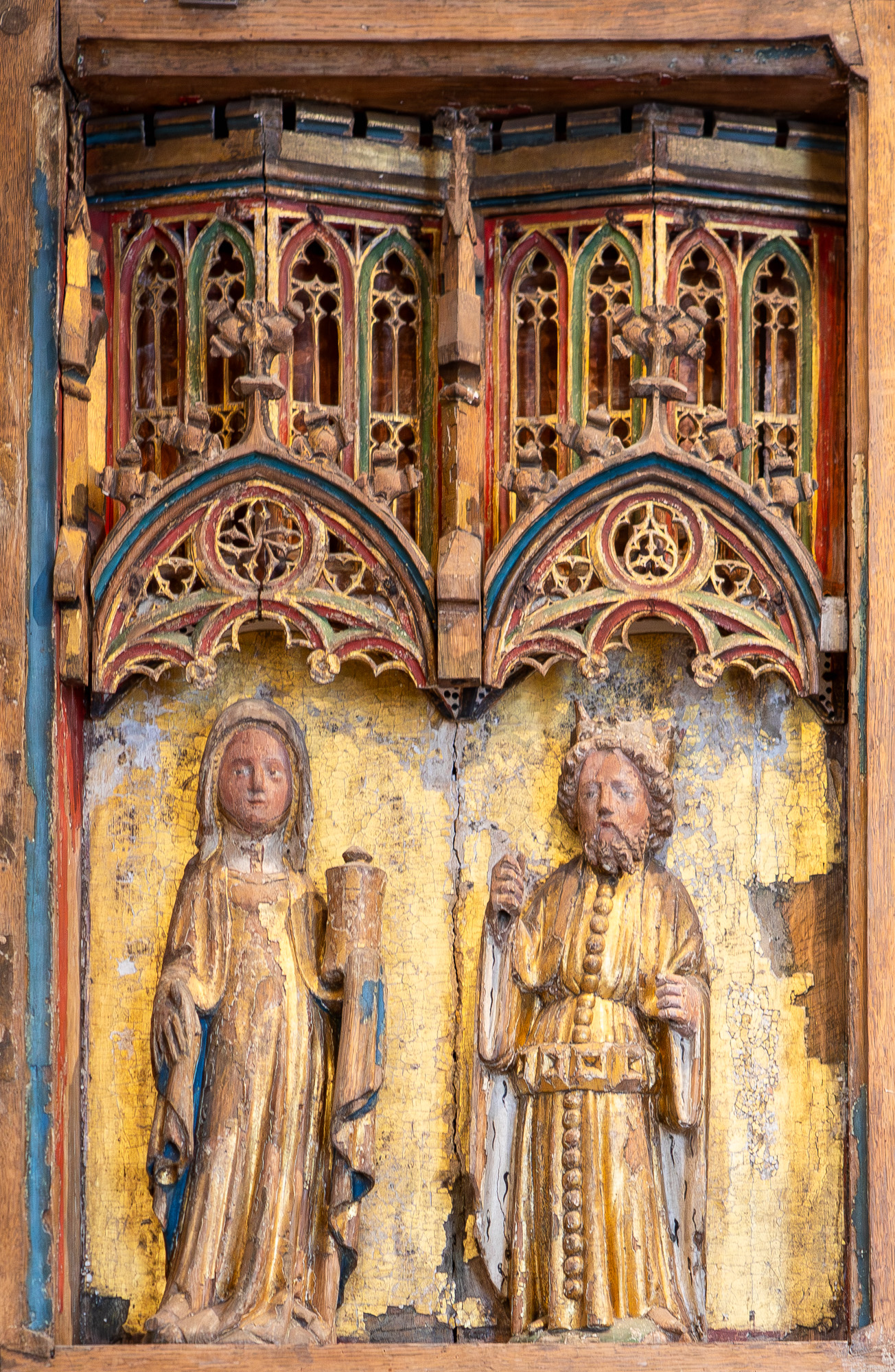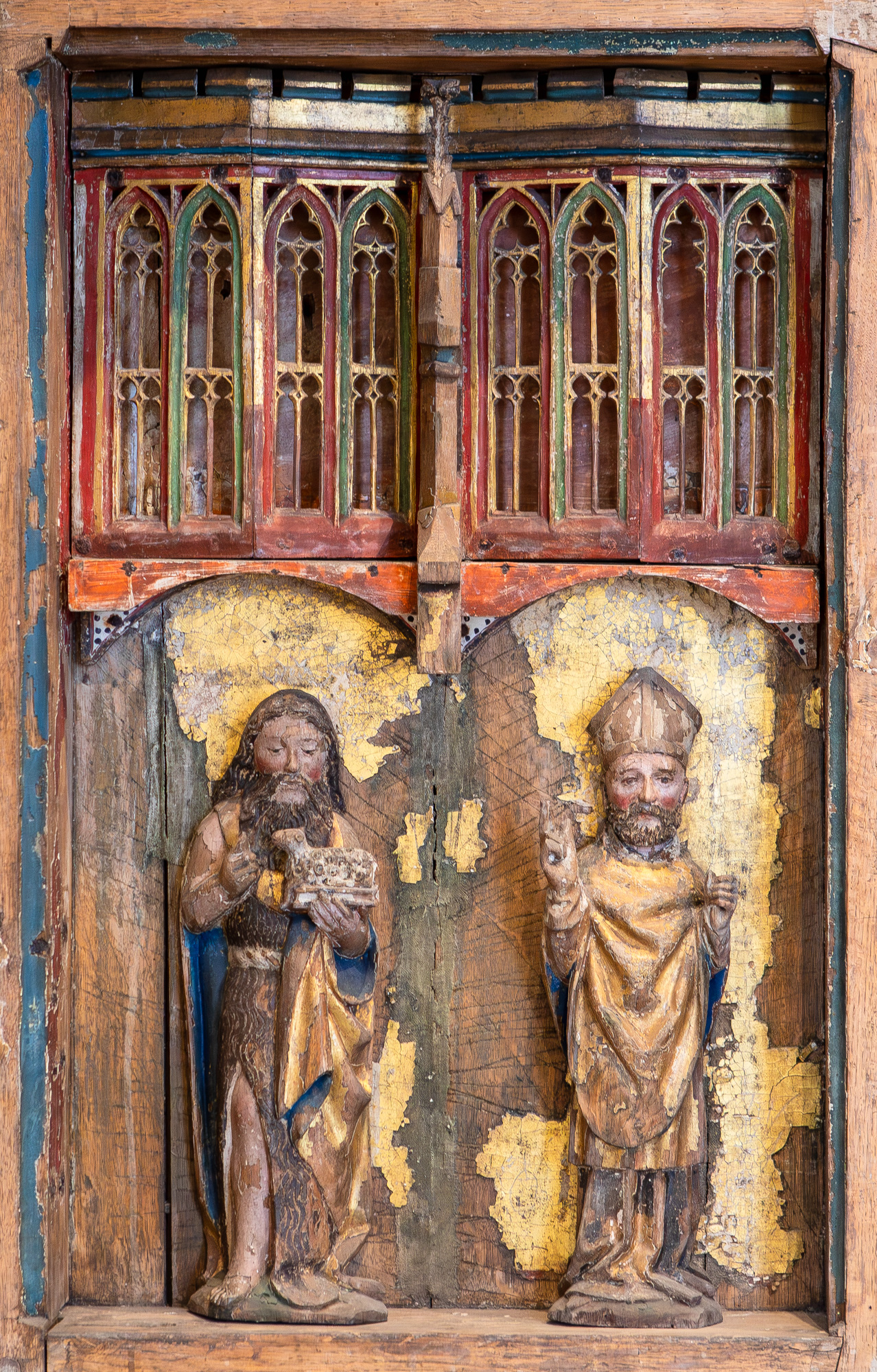 13 af helgenfigurerne er oprindelige. Heraf kan 7 identificeres: Barbara med krone og tårn i venstre hånd; Johannes Evangelist med kalk i venstre hånd; Maria Magdalena med hovedtørklæde og salvekrukke; Johannes Døber med lam på venstre arm; Skt. Jørgen stående på drage; Elisabeth af Thüringen med et fad med to fisk i venstre hånd og et brød i højre; Jakob den Ældre med pilgrimshat, bog, pilgrimspose og trekvartlang kjortel. De øvrige helgener: en abbed med mitra og reb om livet; en kongehelgen; en kvindelig helgen med krone og tre mandlige helgener.