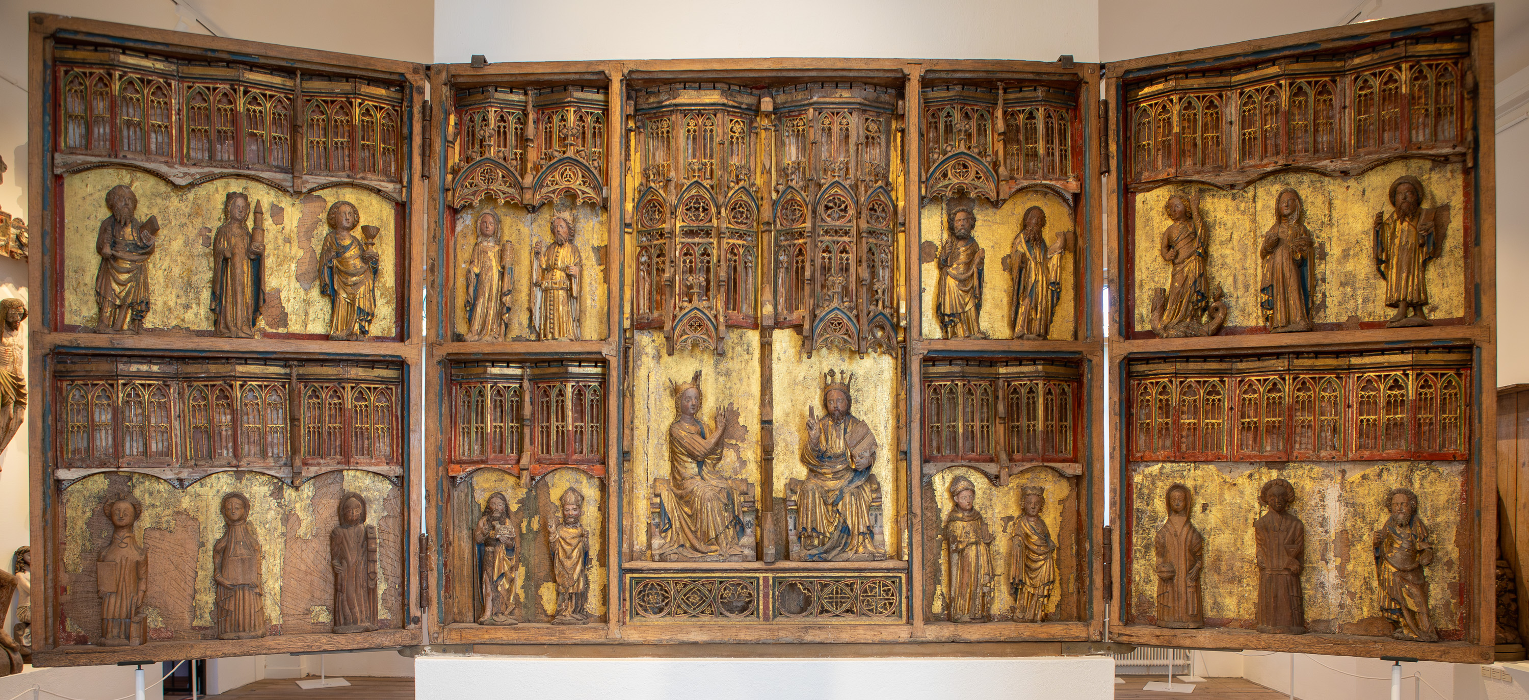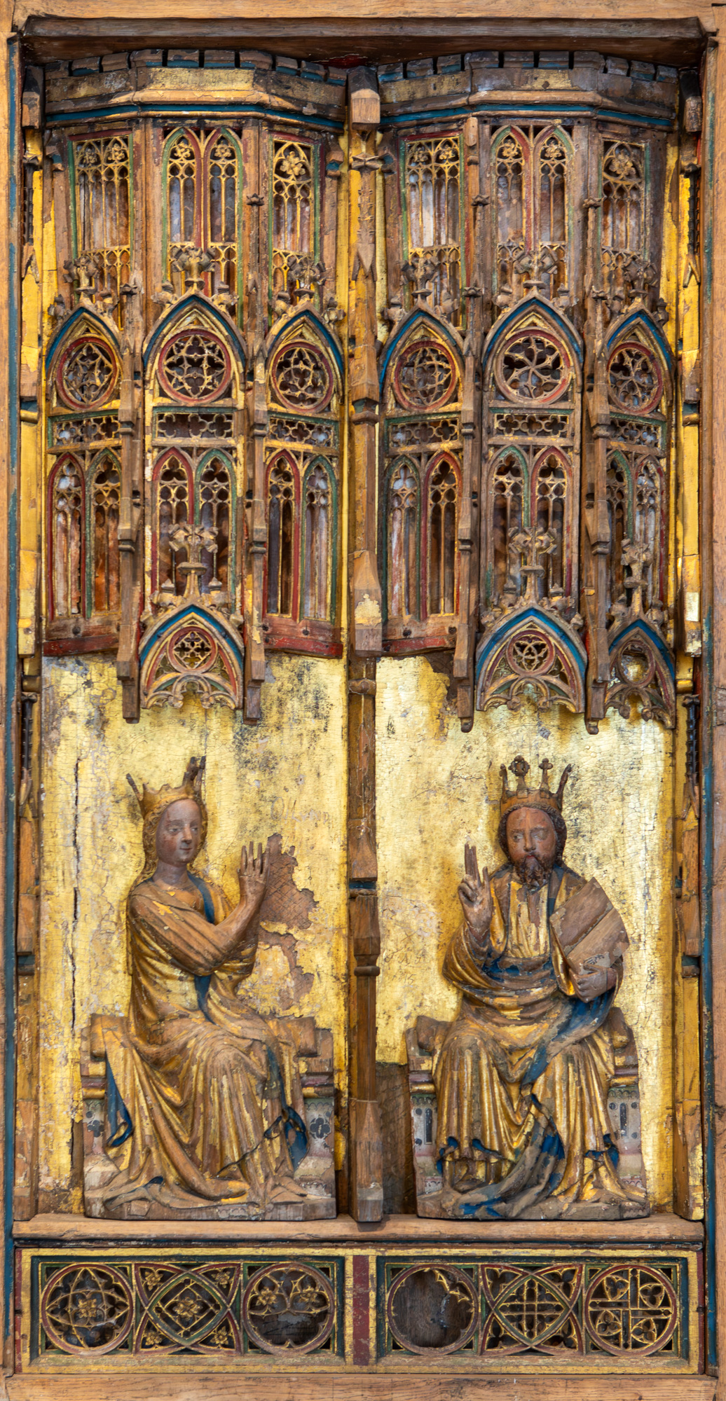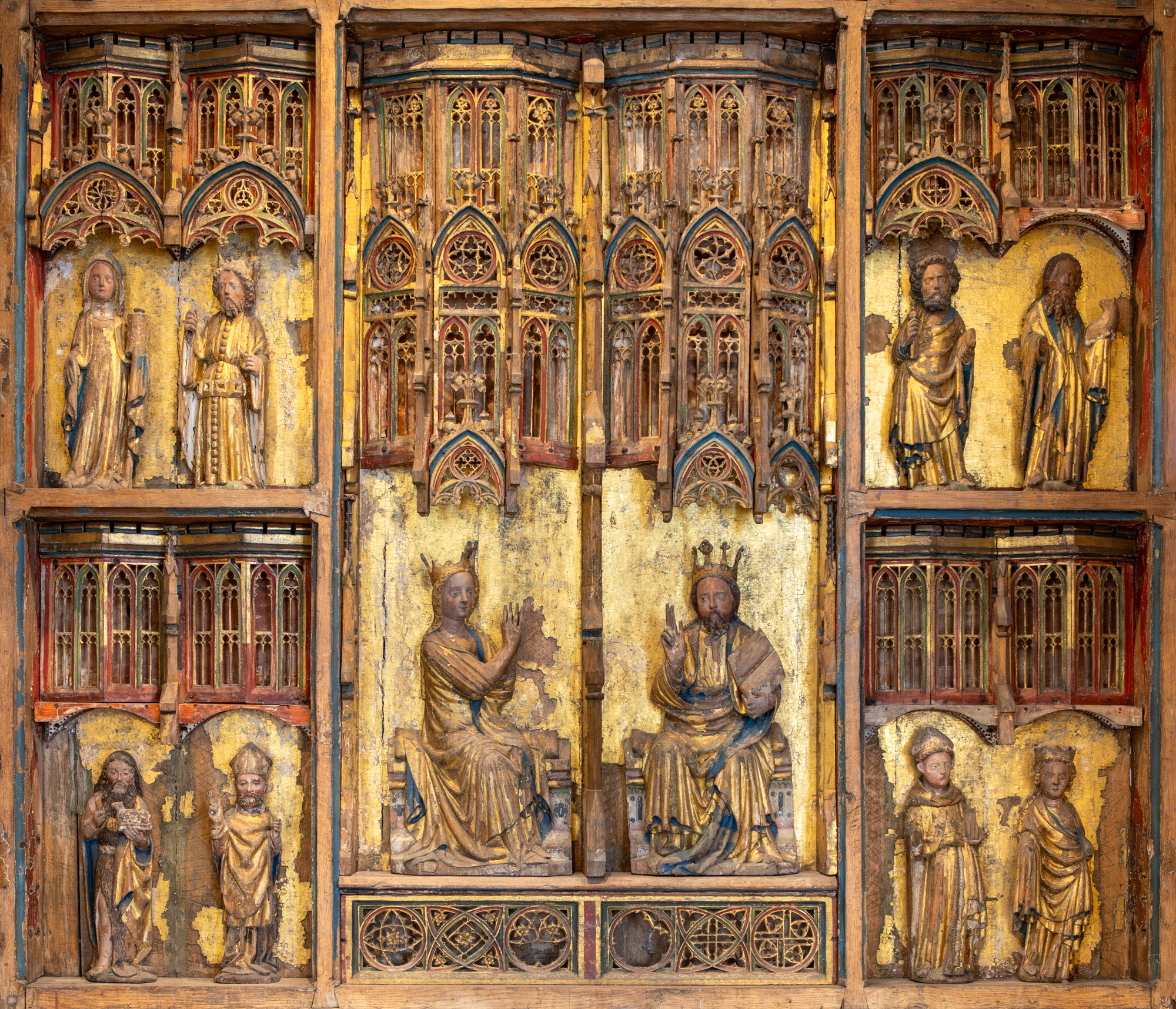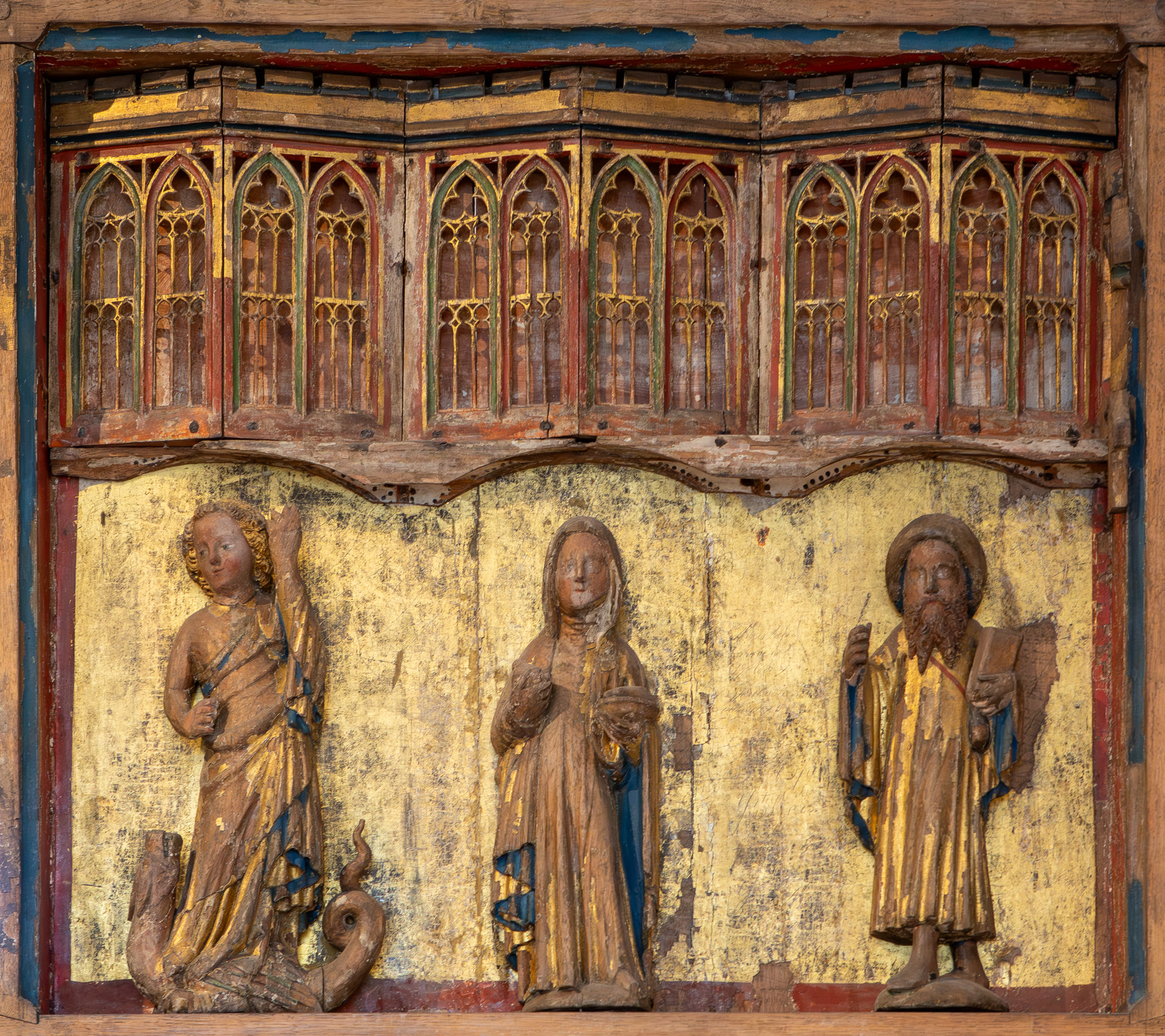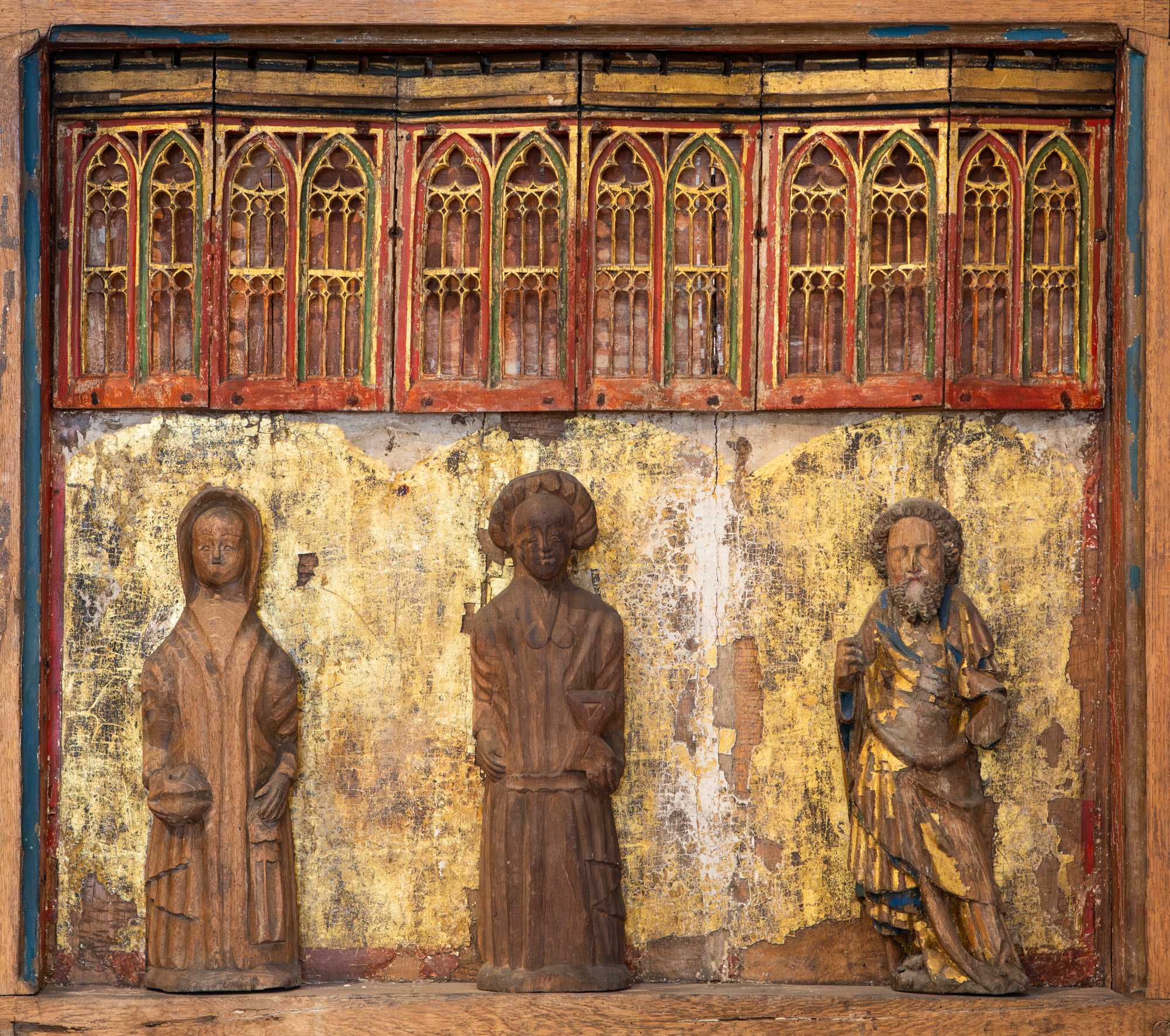13 af helgenfigurerne er oprindelige. Heraf kan 7 identificeres: Barbara med krone og tårn i venstre hånd; Johannes Evangelist med kalk i venstre hånd; Maria Magdalena med hovedtørklæde og salvekrukke; Johannes Døber med lam på venstre arm; Skt. Jørgen stående på drage; Elisabeth af Thüringen med et fad med to fisk i venstre hånd og et brød i højre; Jakob den Ældre med pilgrimshat, bog, pilgrimspose og trekvartlang kjortel. De øvrige helgener: en abbed med mitra og reb om livet; en kongehelgen; en kvindelig helgen med krone og tre mandlige helgener.