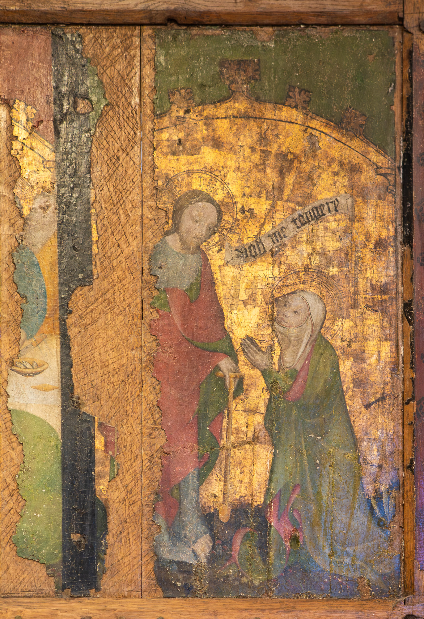 - Noli me tangere. Det er også det, der står i tekstbåndet. Maria Magdalene møder den Opstandne i haven, og han siger: Rør mig ikke. Joh. 20,11-18. Dette er det bedst bevarede af billederne.