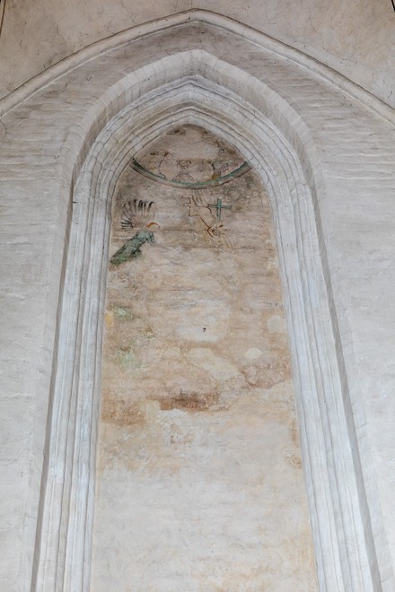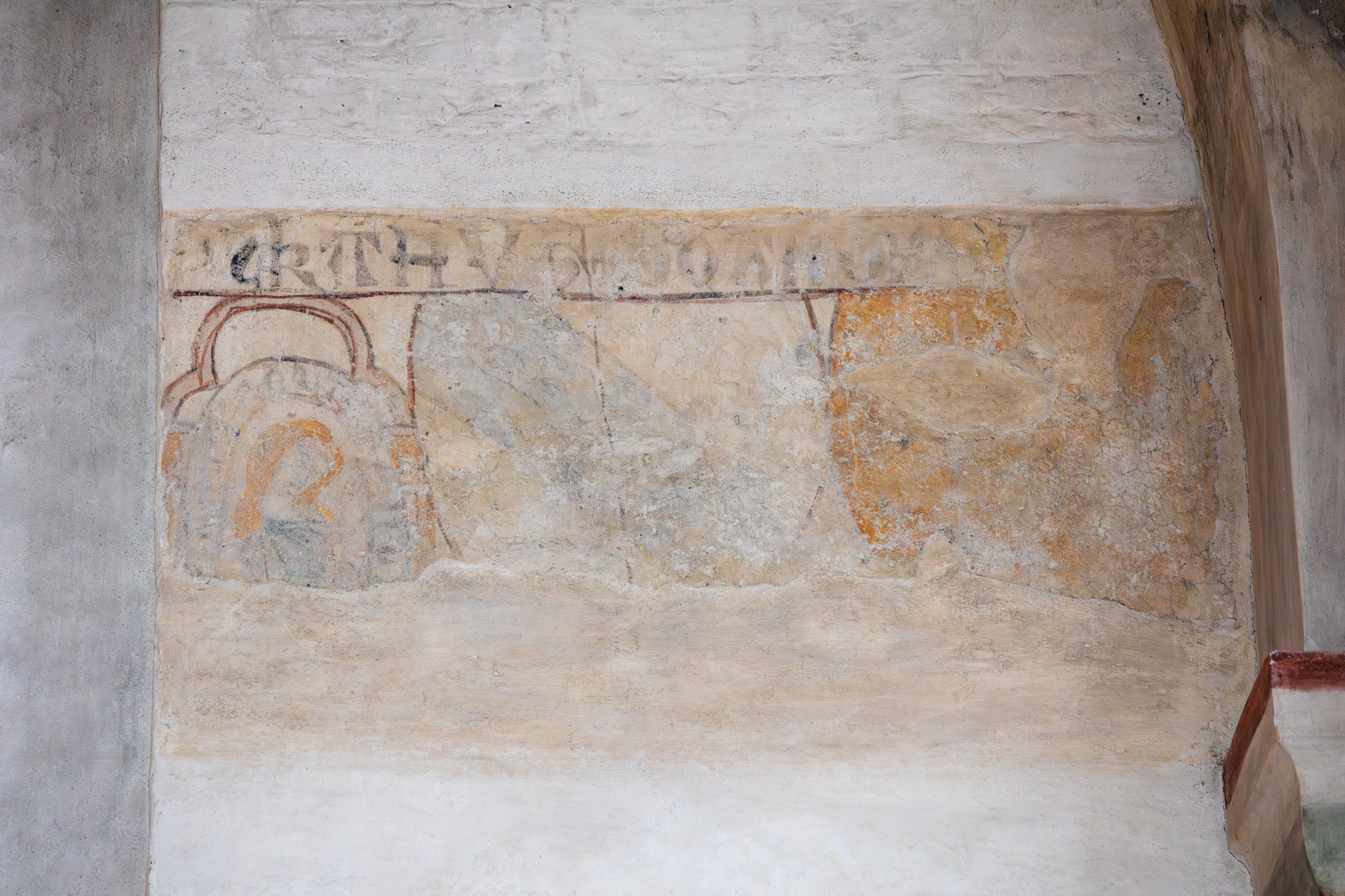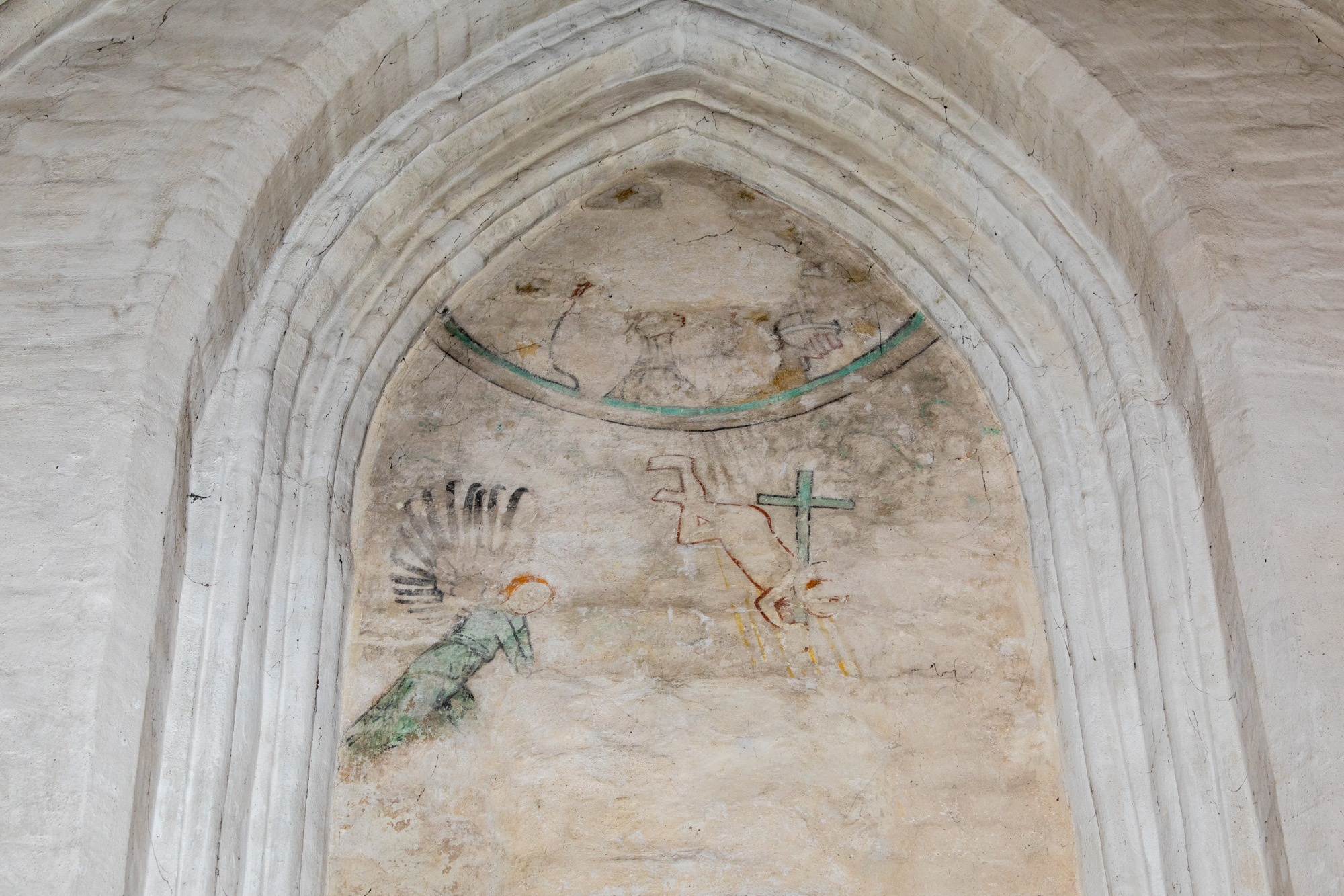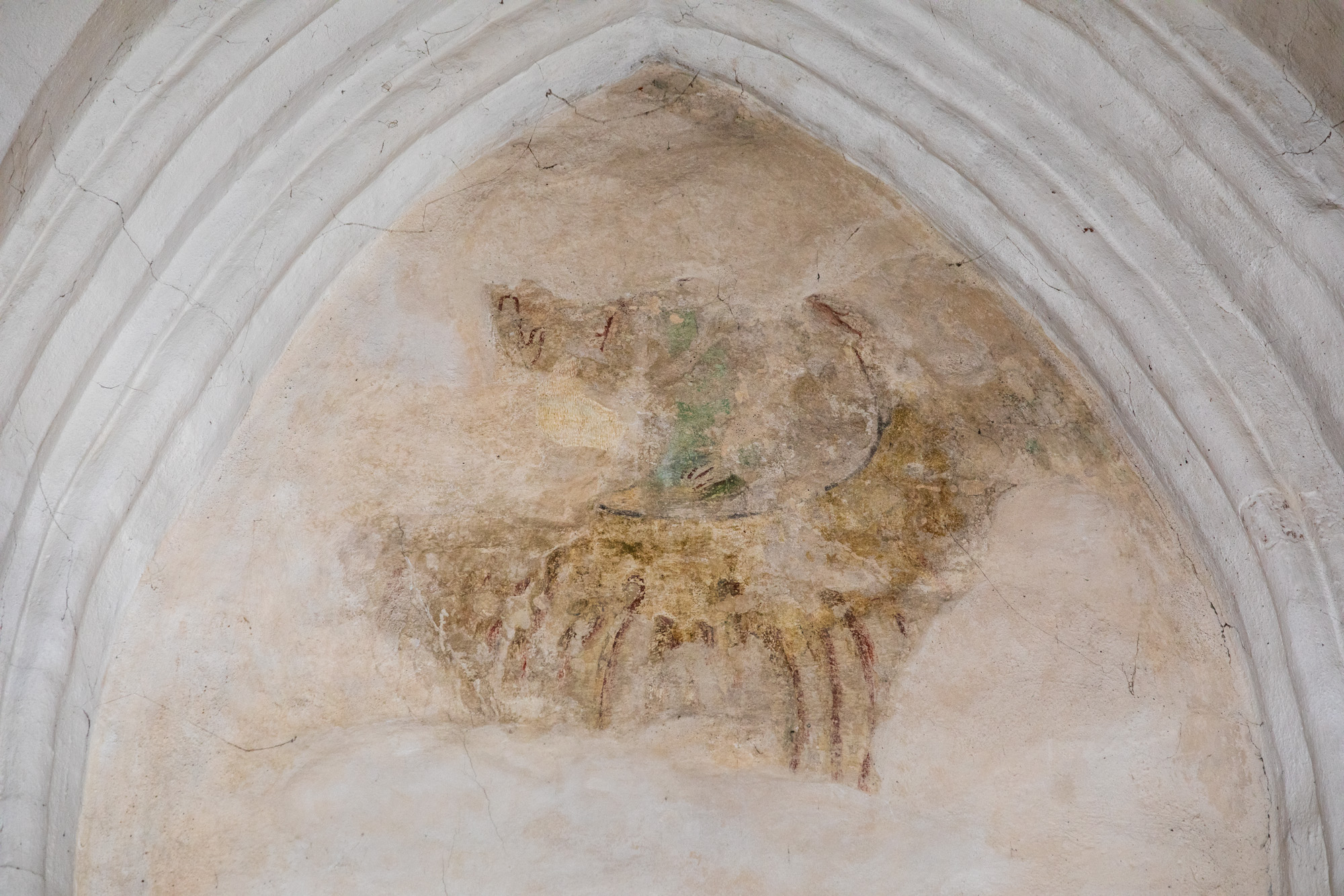 Skibet, 3. fag i buen ind til sideskibet. Kristus på korset. Det meste af billedet er gået tabt. Korrundingens sydøstlige hjørne i blænding. Tre helgener, som ikke kan identificeres.