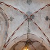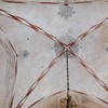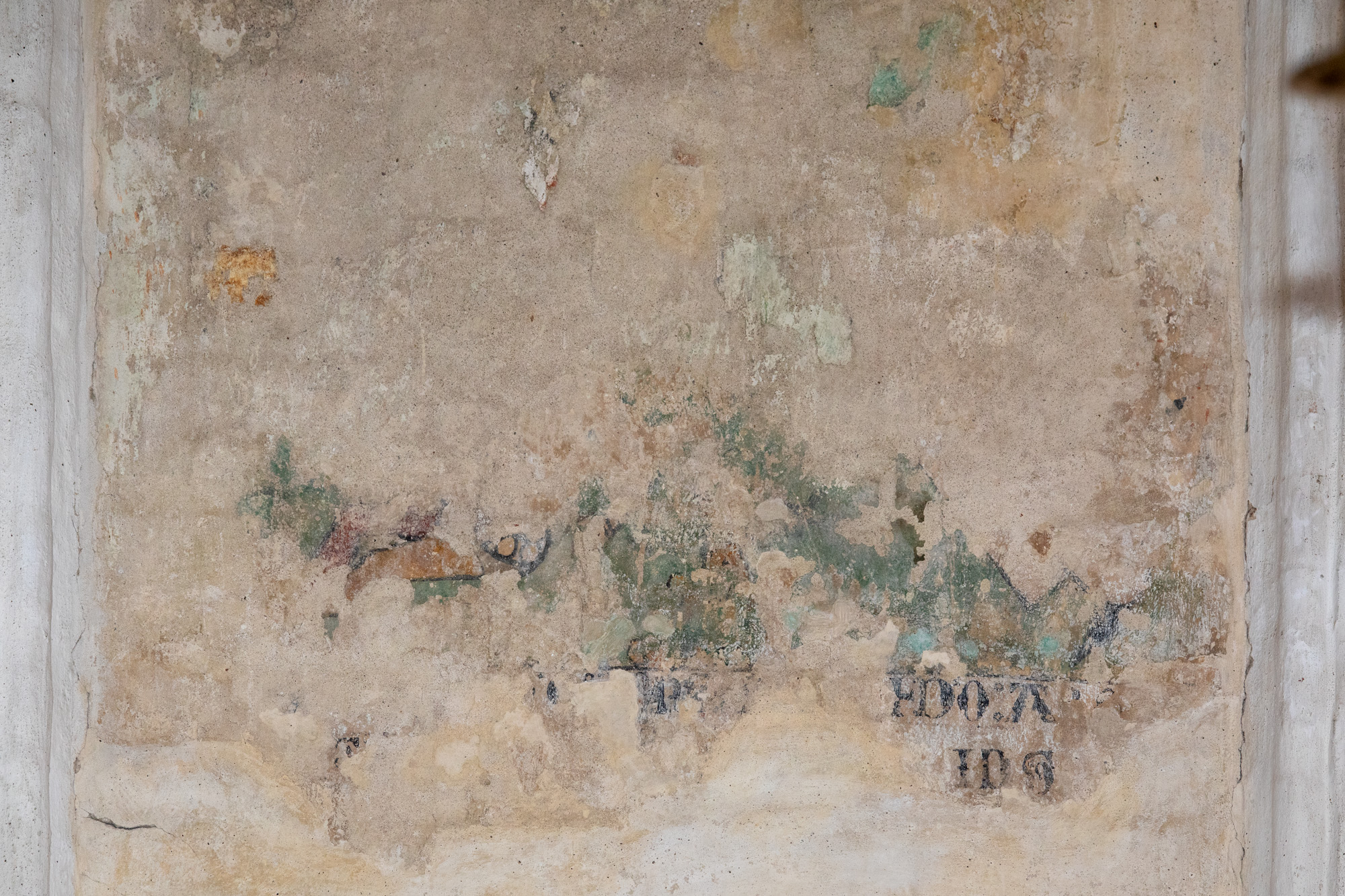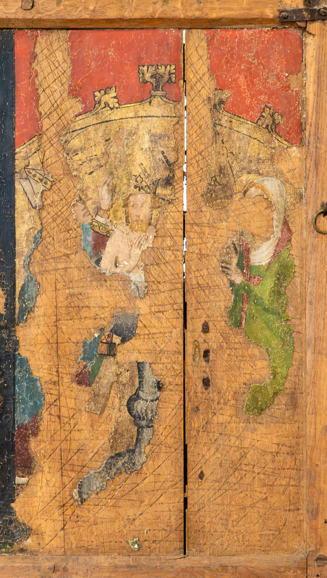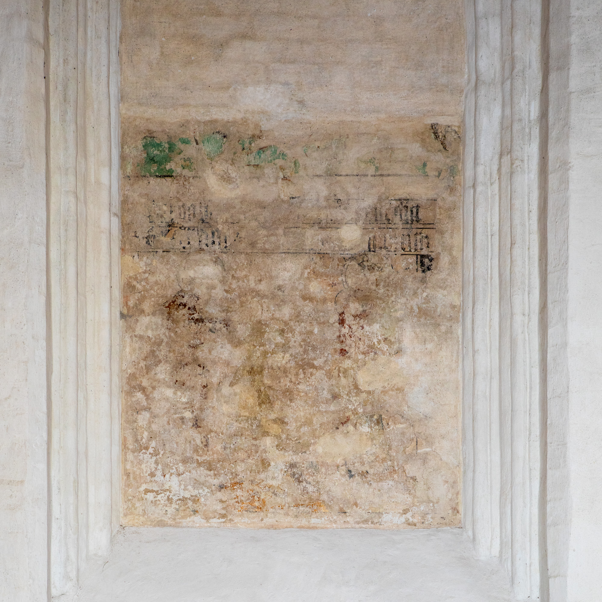 Skibet, 3. fag i buen ind til sideskibet. Kristus på korset. Det meste af billedet er gået tabt. Korrundingens sydøstlige hjørne i blænding. Tre helgener, som ikke kan identificeres.