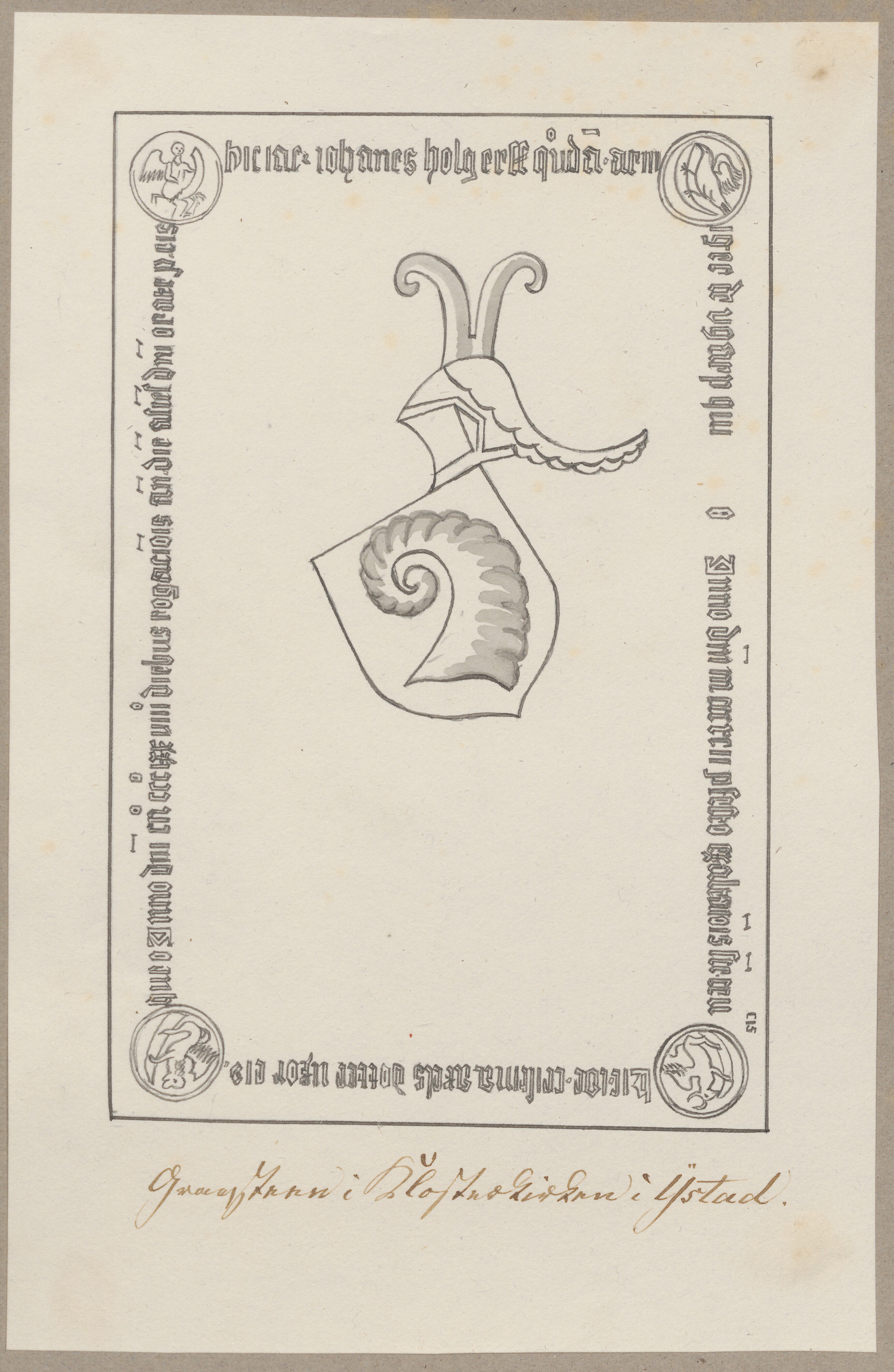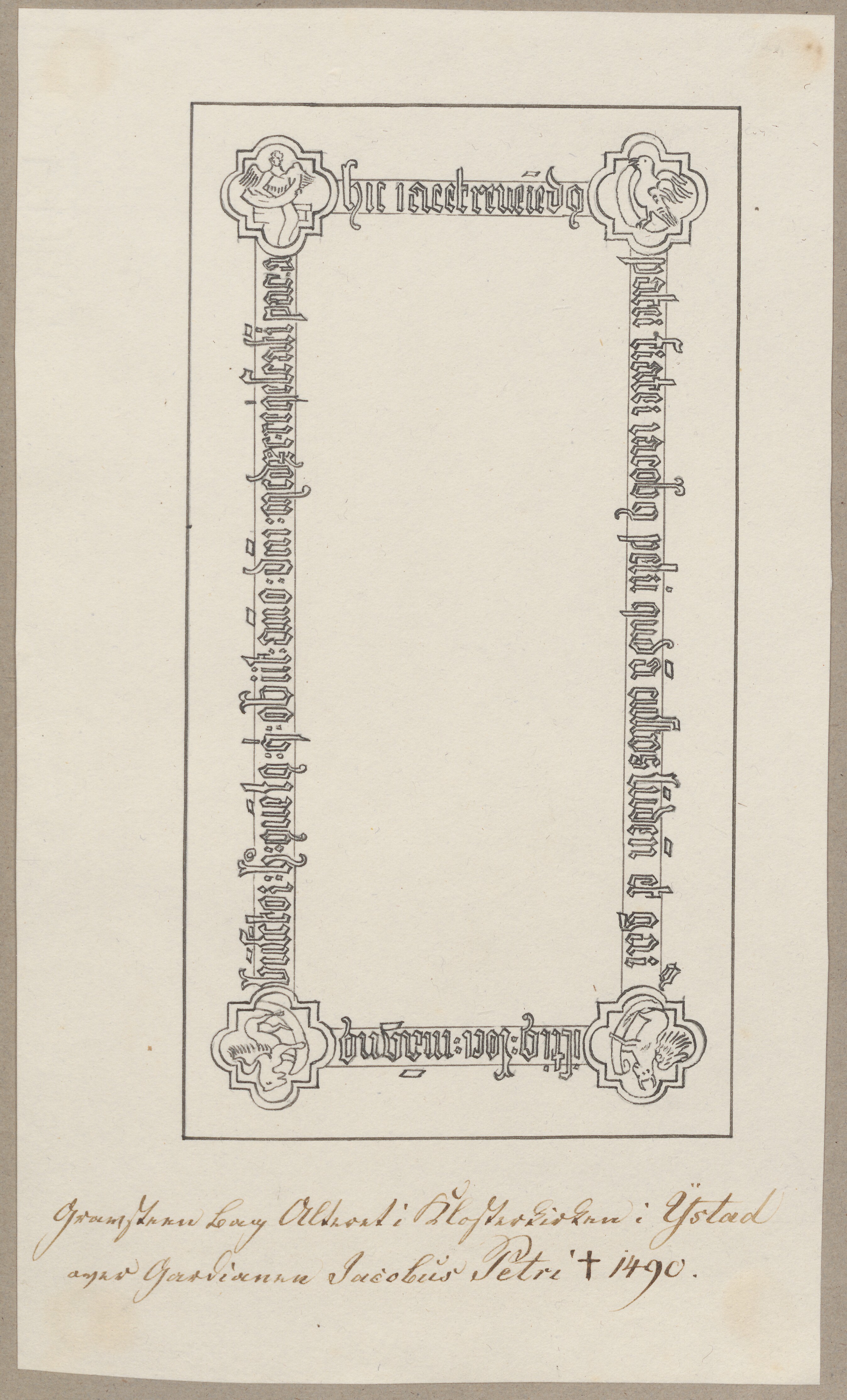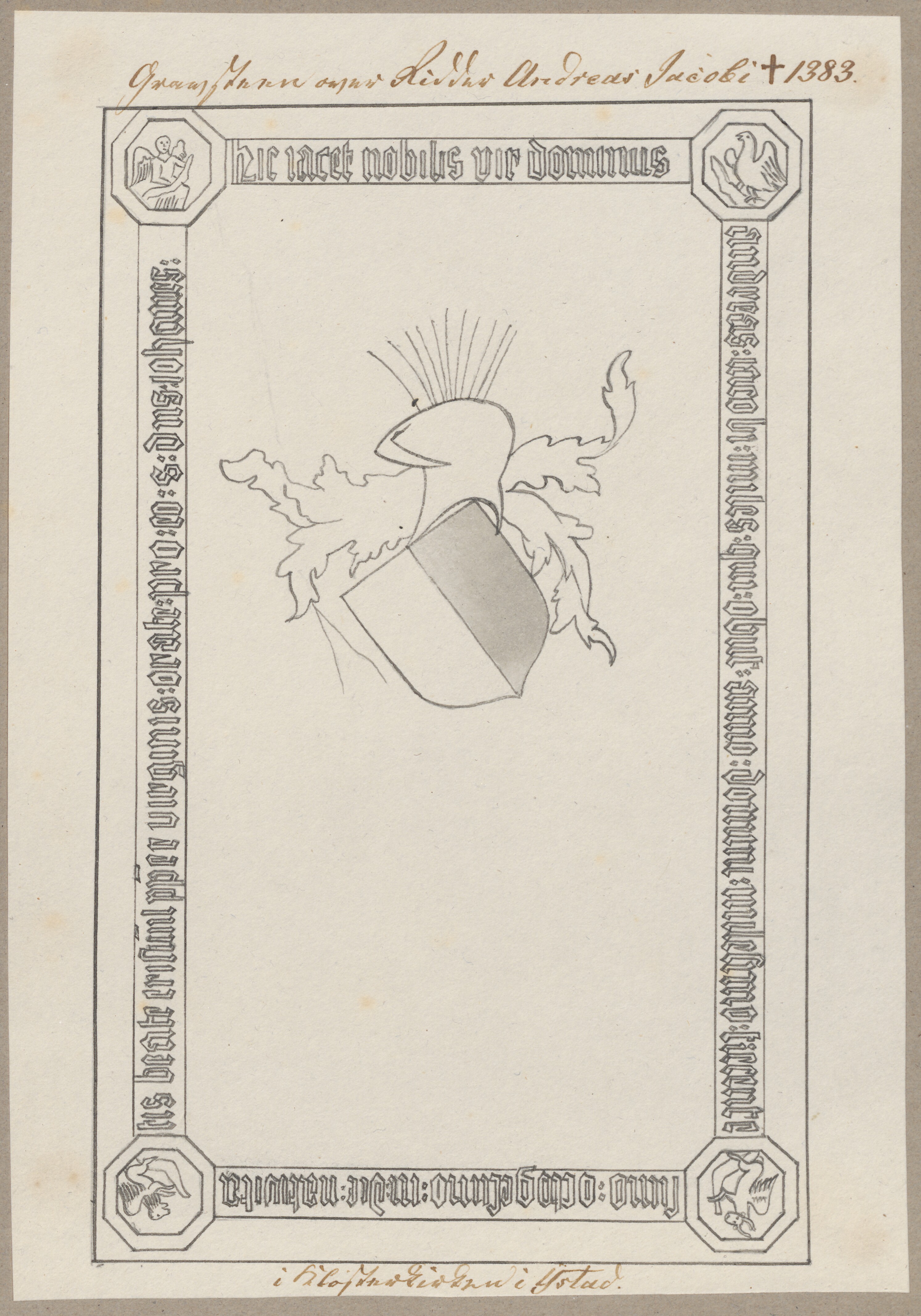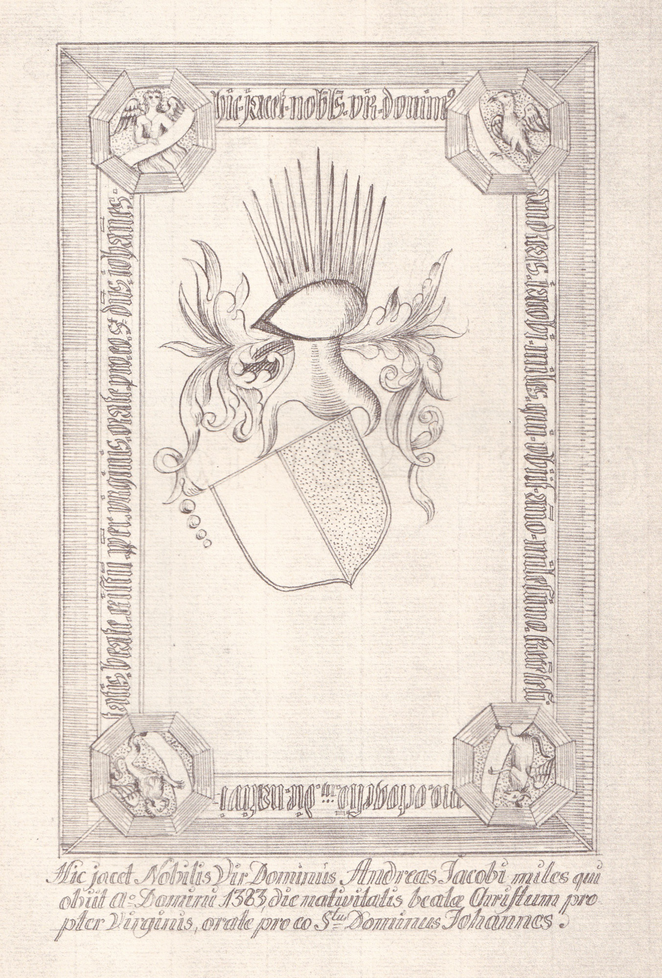 Hic jacet nobilis vir dominus Andrea Jacobi miles, qui obiit anno Domini 1383, die nativitatis beatæ Christum propter virginis orate pro eo. Dominus Johannes. (Her hviler den ædle mand, hr. Andreas Jacobi, ridder, som døde i det Herrens år 1383, på dagen for den hellige Kristi fødsel, for Jomfru Marias skyld, bed for ham. Herre Johannes.)