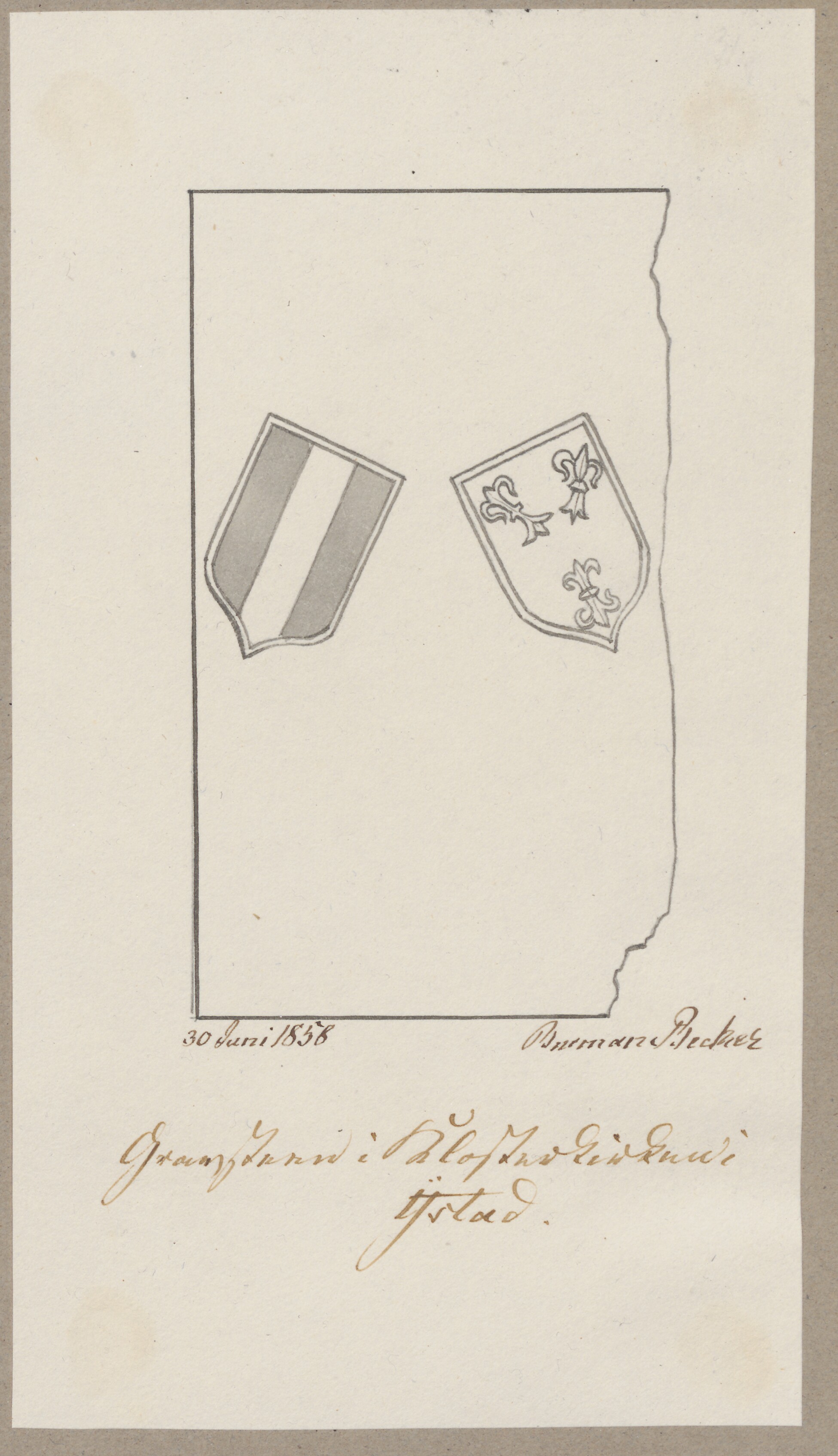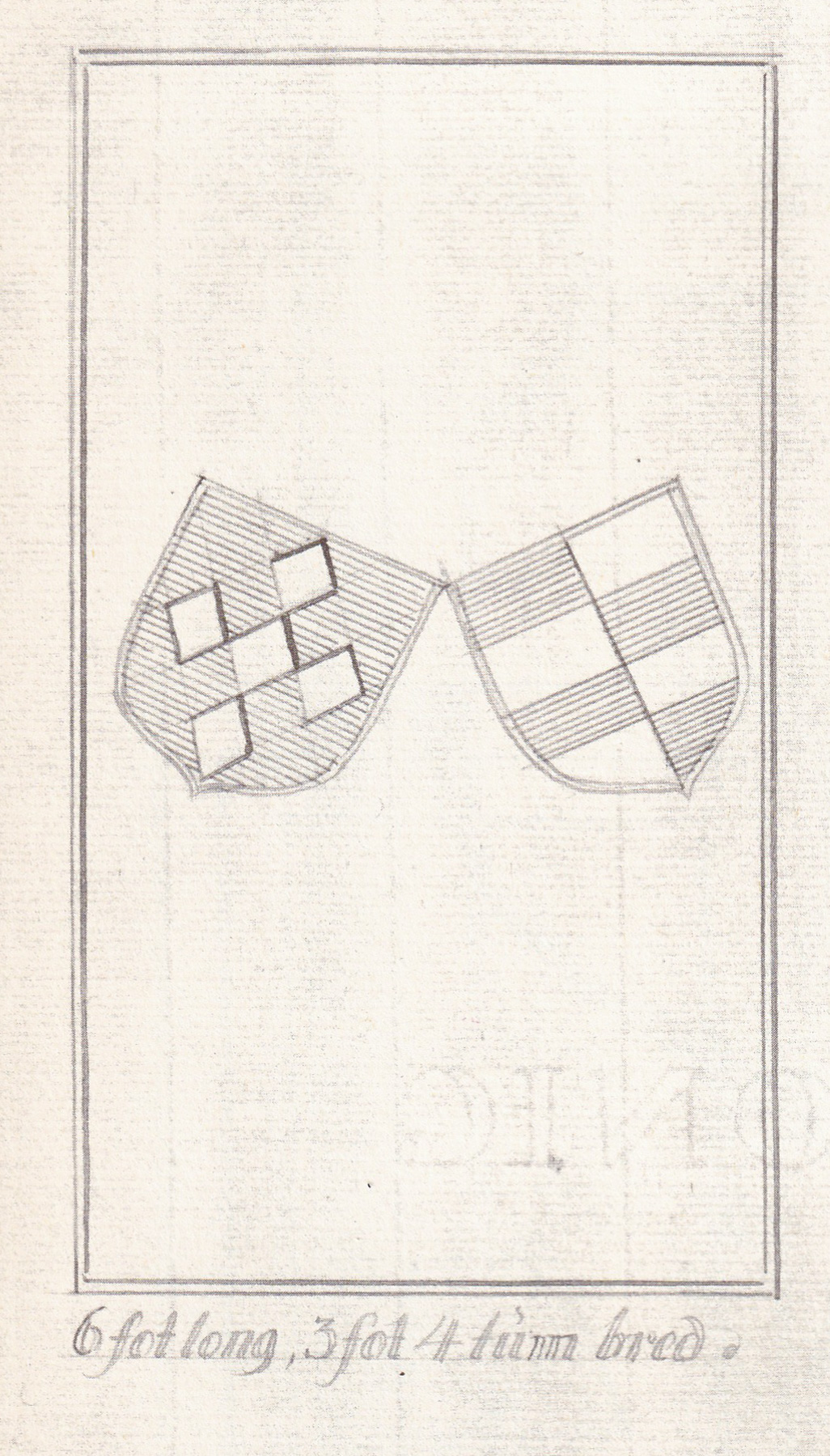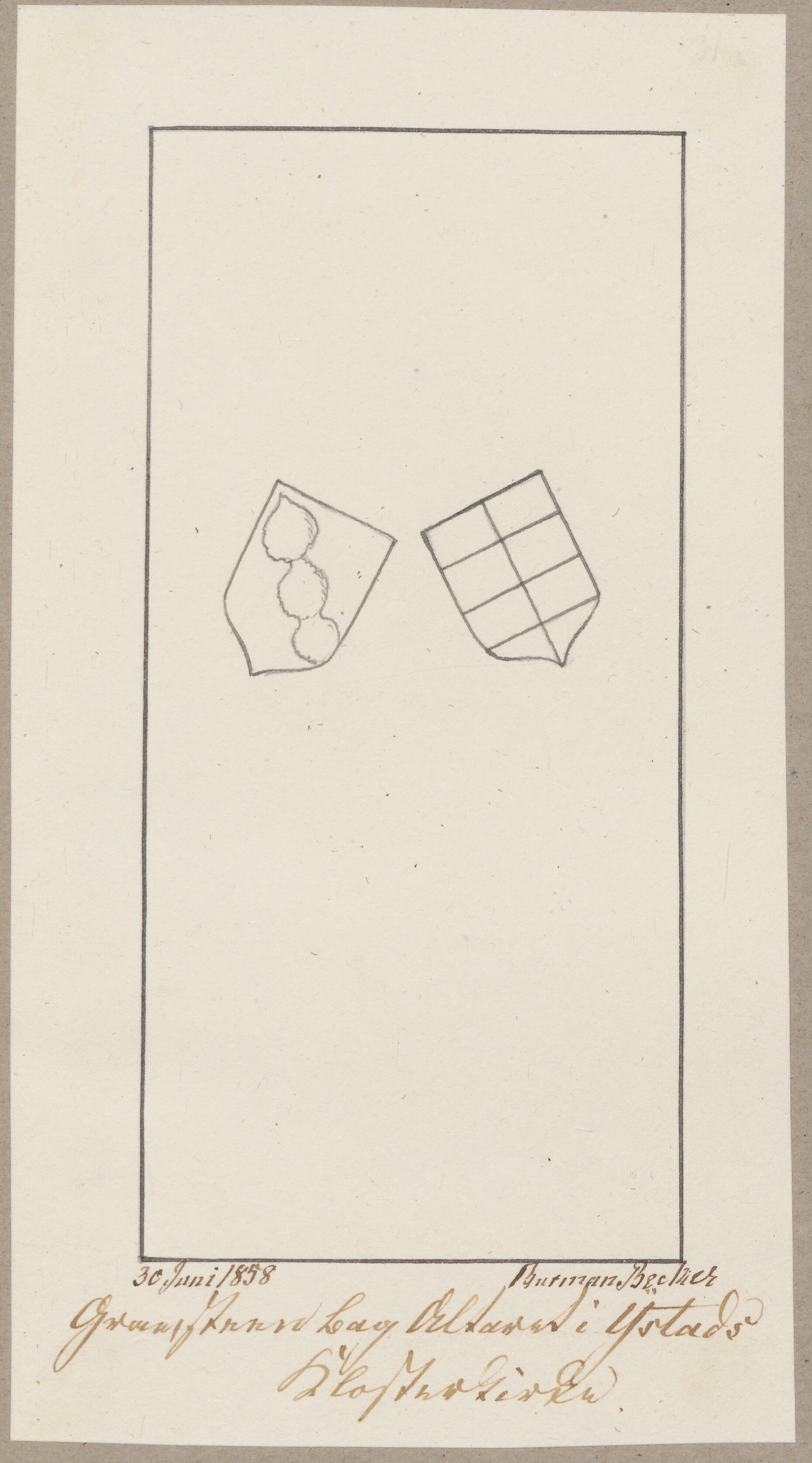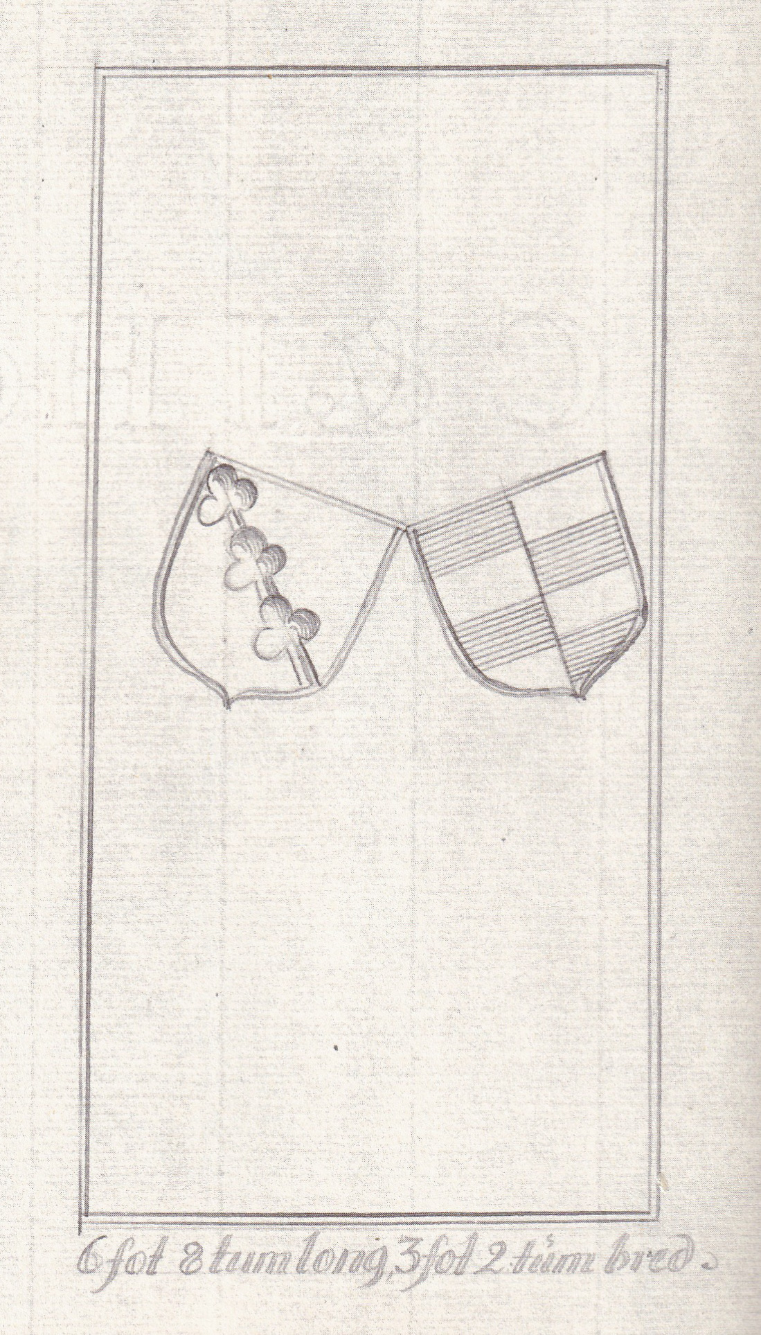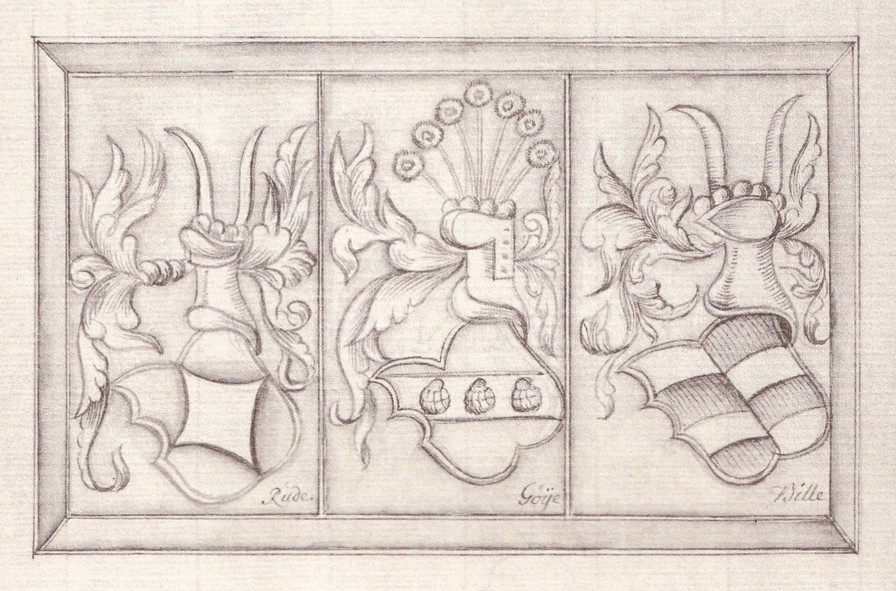 Gravsten i koret med våbenskjold for slægterne Rude og Bille. Den ene tegning har tillige et bomærke.