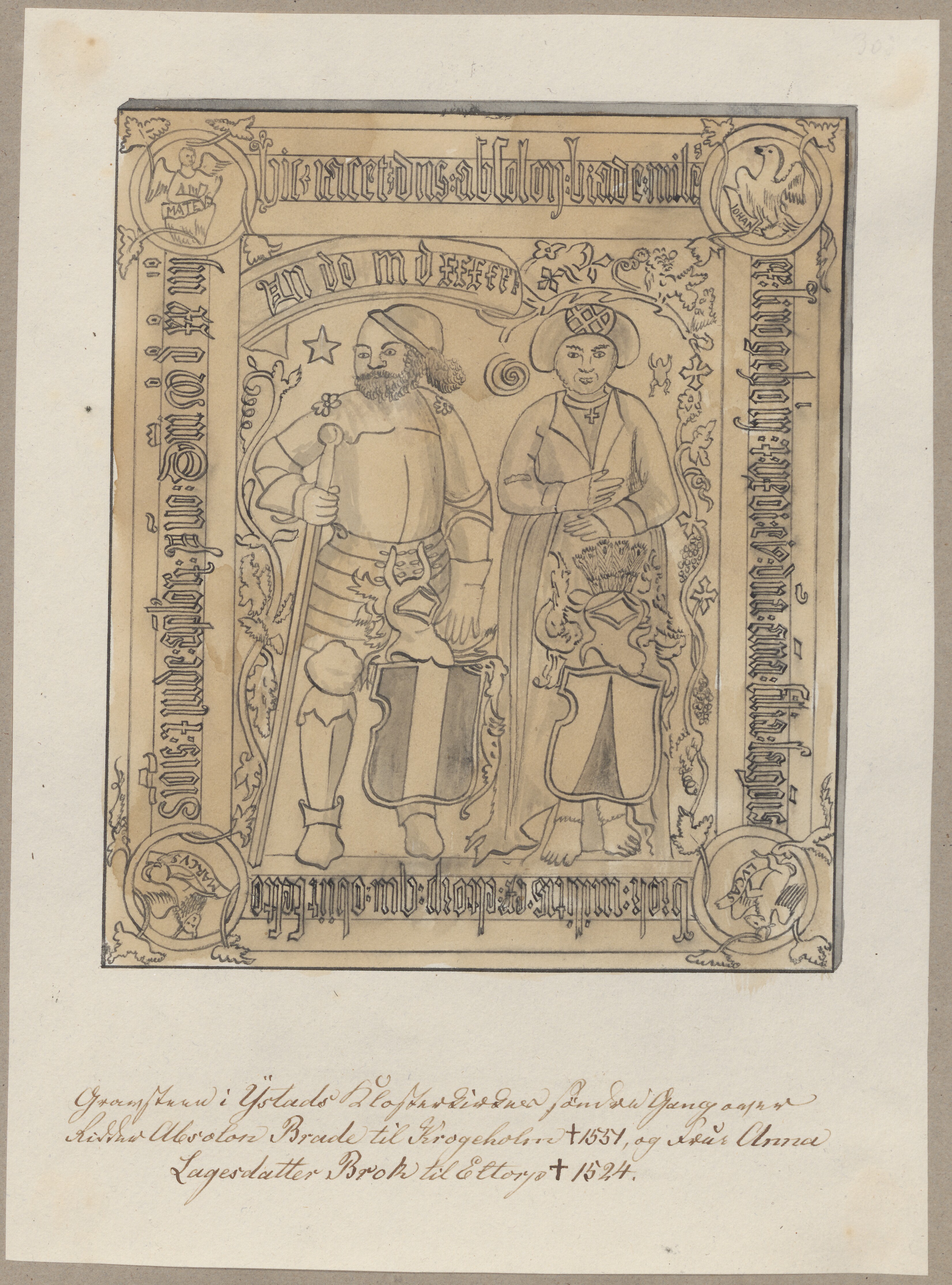 Våben foran de to figurers ben. Chr. Axel Jensen kalder det et såre såre naivt arbejde, ”hvis Portrætfigurer er rene Karikaturer”. Parret er kopieret efter Brahe-stenen i Tosterup.
