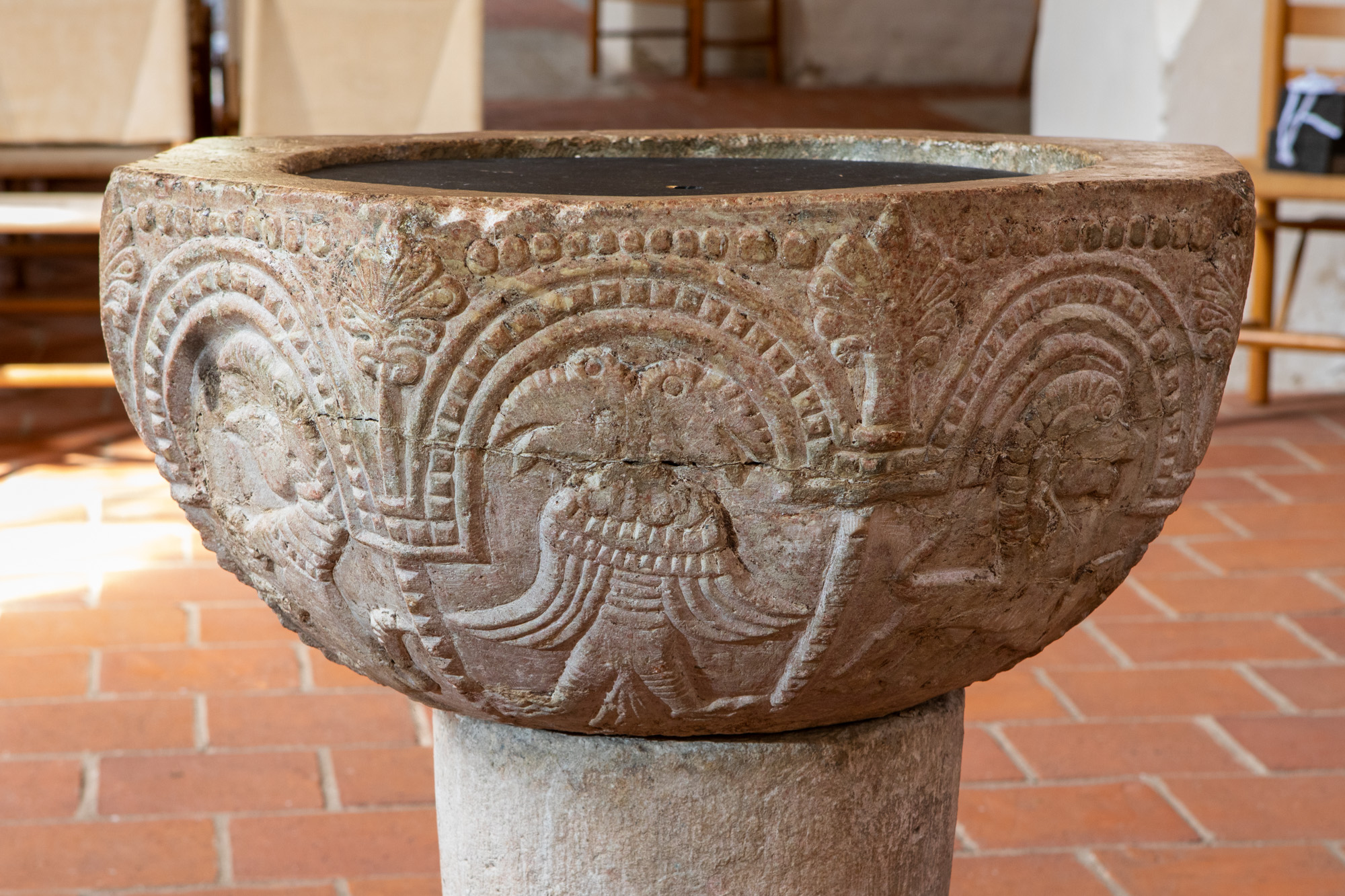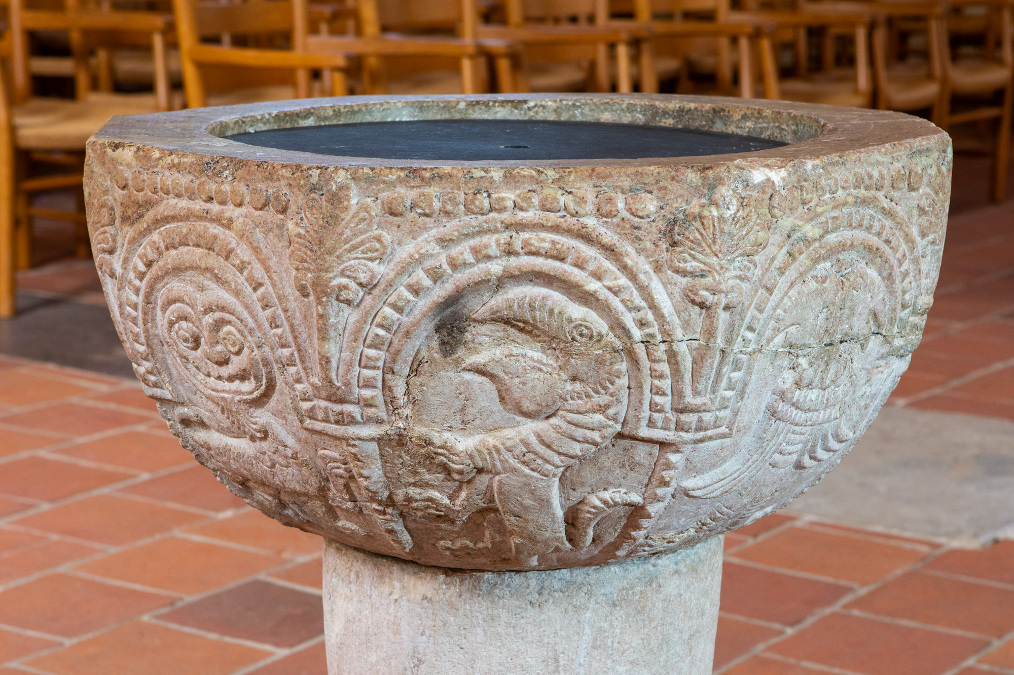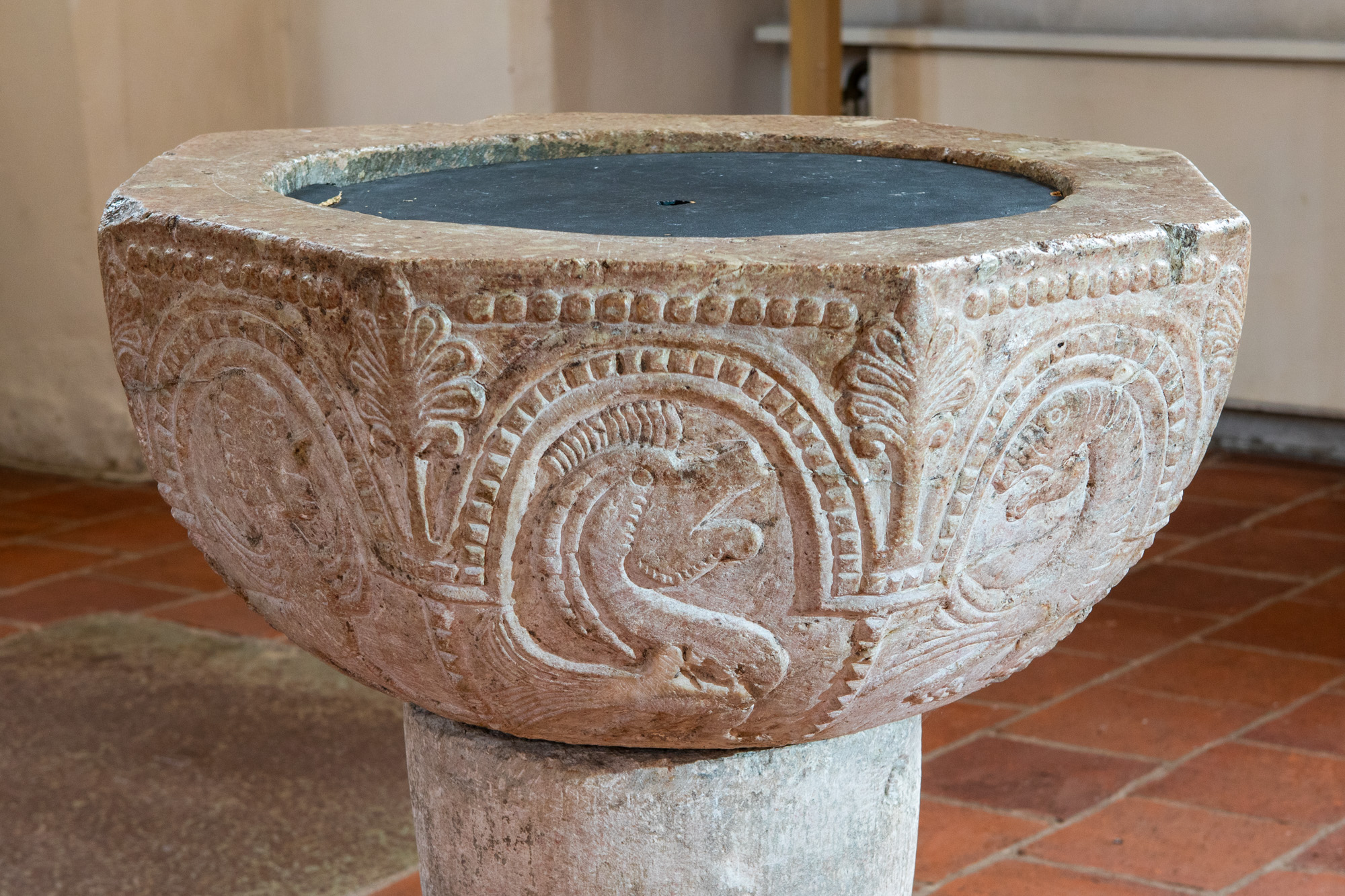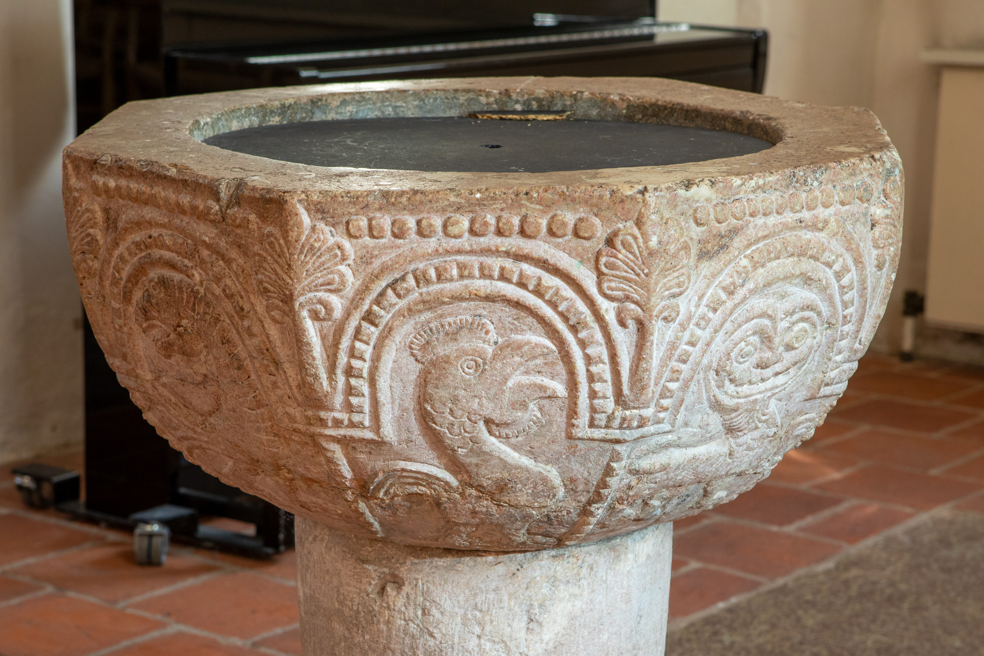 Døbefonten, som er af kalksten, tilhører Falsterbogruppen. Kummen er ottekantet. I hjørnerne er der smalle stave, som bærer rundbuer. I sviklerne bliver de smalle stave til palmetter. Langs den øverste kant går en række perler, som palmetterne gennemskærer. I rundbuerne står fantasidyr: en løve eller hest med en oprejst manke, et dyr med fire fødder, en fugl, endnu en fugl, som drejer hovedet bagud, en hane, et firfodet dyr med hovedet en face, et dyr, som står på bagbenene og en dobbeltørn. Kummen har ikke fals, og i bunden sidder en kobberplade.