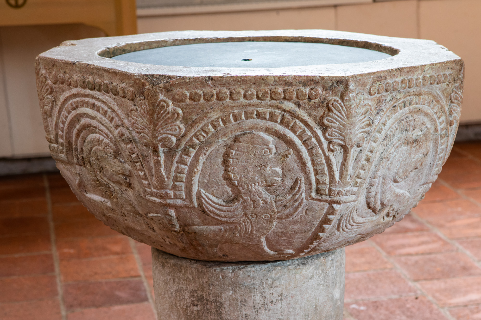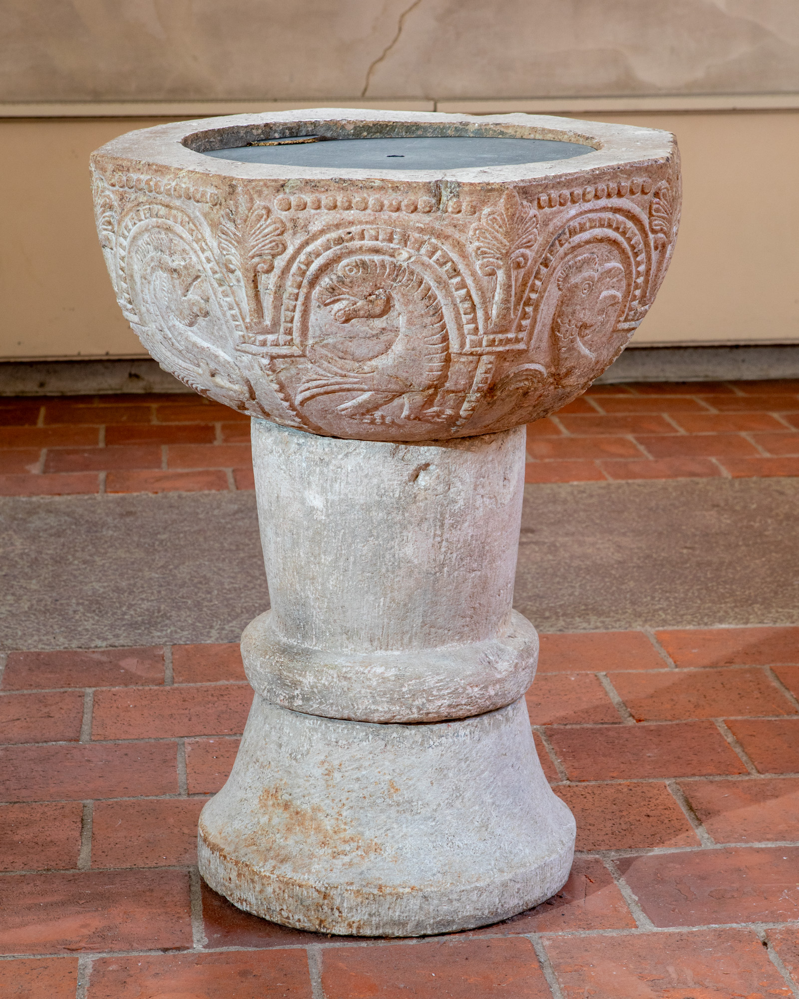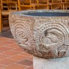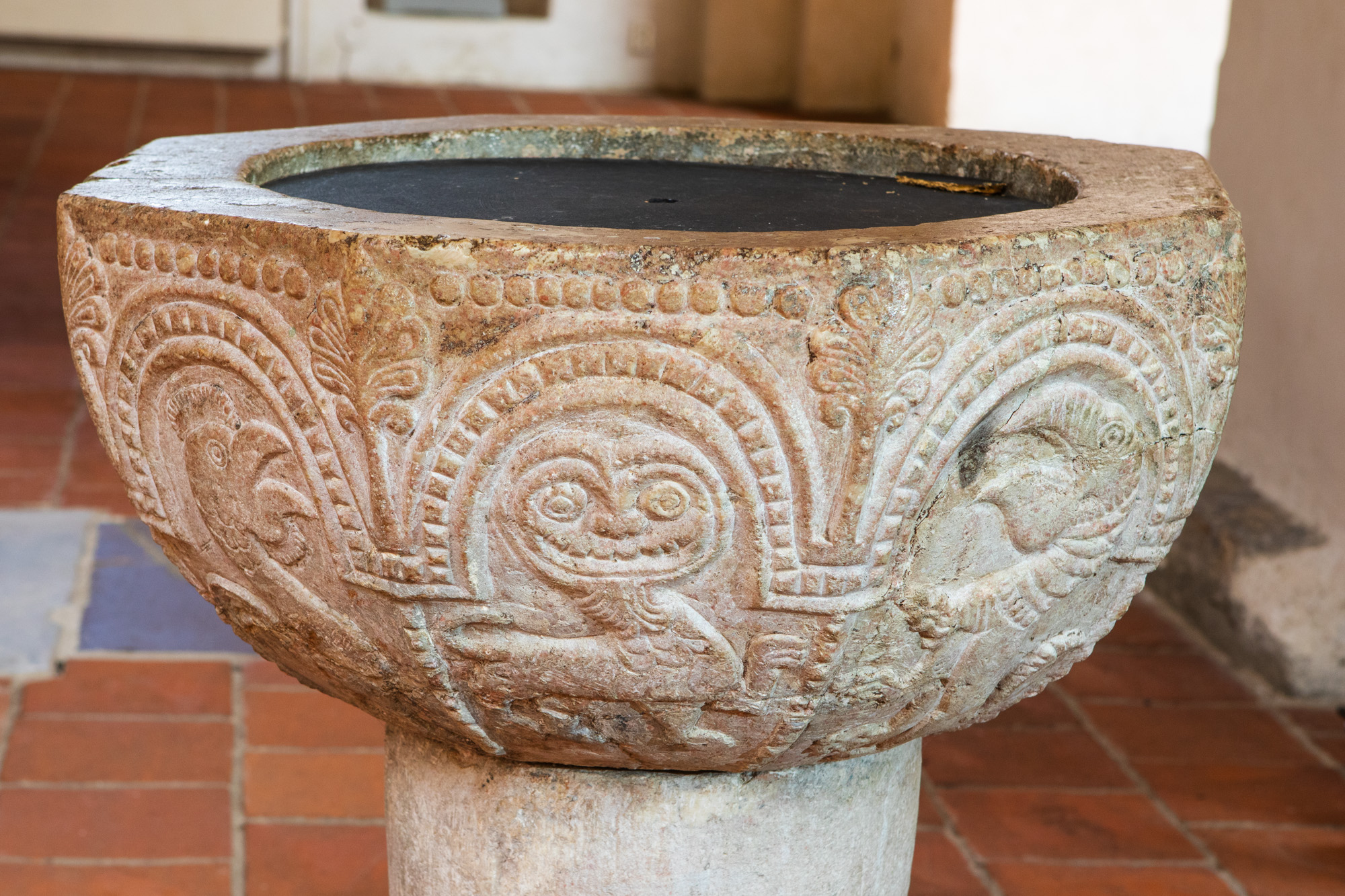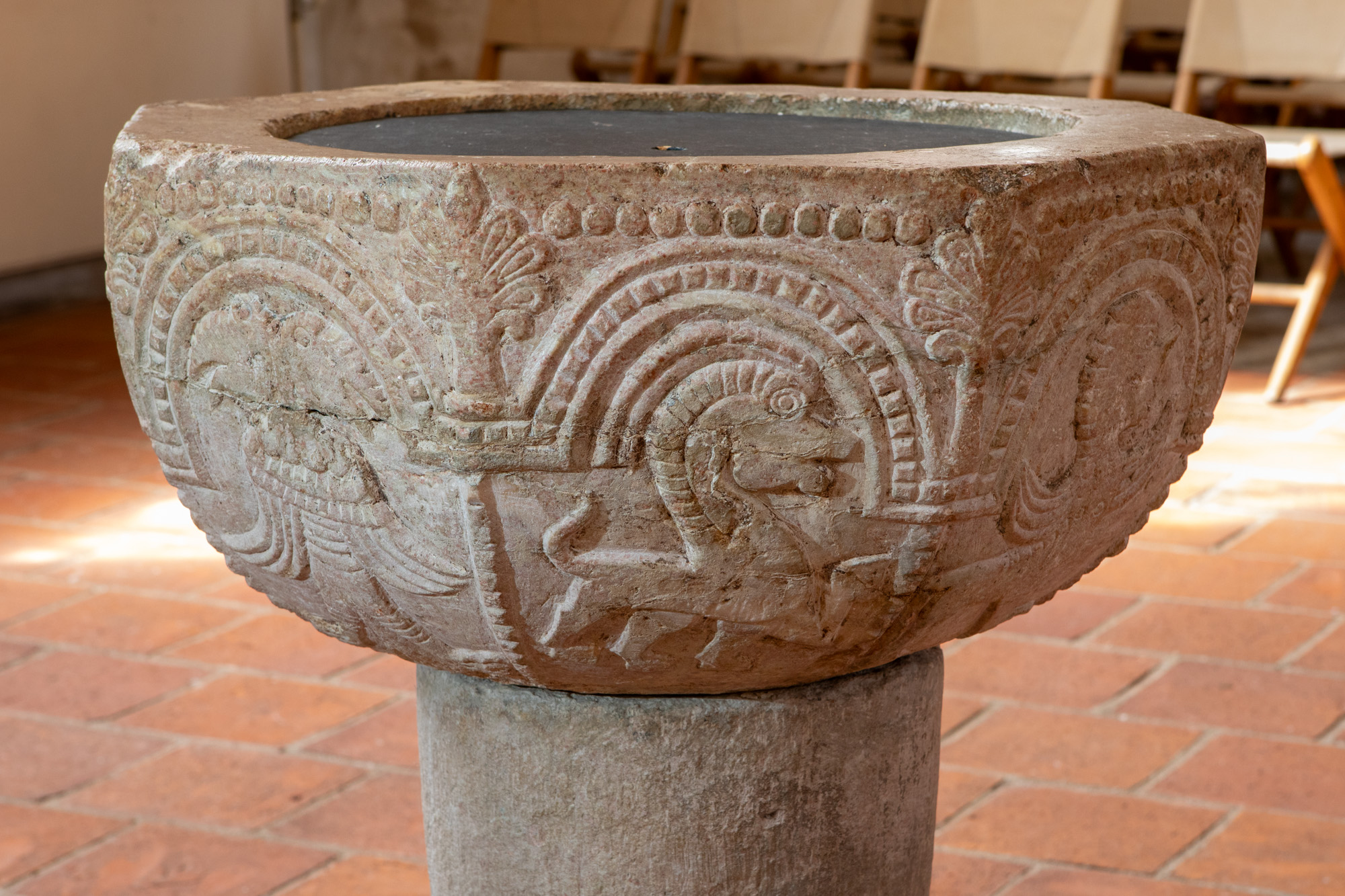 Døbefonten, som er af kalksten, tilhører Falsterbogruppen. Kummen er ottekantet. I hjørnerne er der smalle stave, som bærer rundbuer. I sviklerne bliver de smalle stave til palmetter. Langs den øverste kant går en række perler, som palmetterne gennemskærer. I rundbuerne står fantasidyr: en løve eller hest med en oprejst manke, et dyr med fire fødder, en fugl, endnu en fugl, som drejer hovedet bagud, en hane, et firfodet dyr med hovedet en face, et dyr, som står på bagbenene og en dobbeltørn. Kummen har ikke fals, og i bunden sidder en kobberplade.