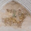 Koret, nordvæg, blænding længst mod øst. Billedet er meget fragmentarisk, men kan vise Fødslen (øverst) og Hyrdernes Tilbedelse (nederst).