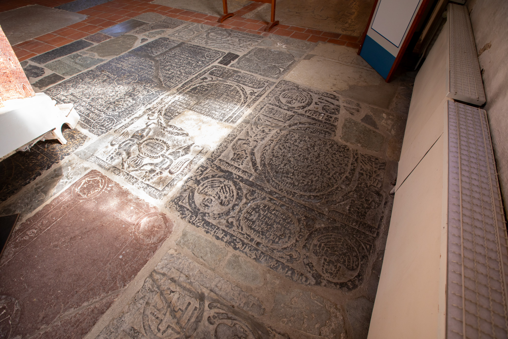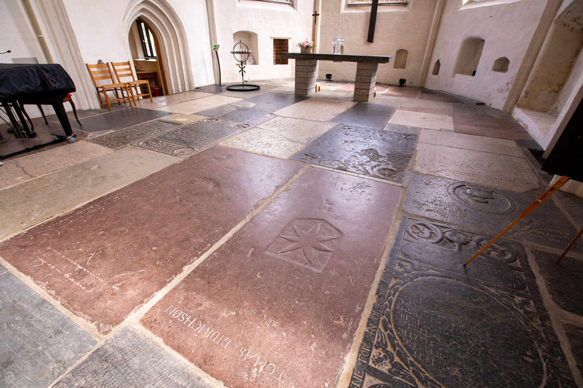 Et stort antal gravsten er blevet flyttet og genanvendt som gulvbelægning både i sideskibets vestlige del og i koret. Her medtages et mindre antal, som er omtalt i litteraturen.