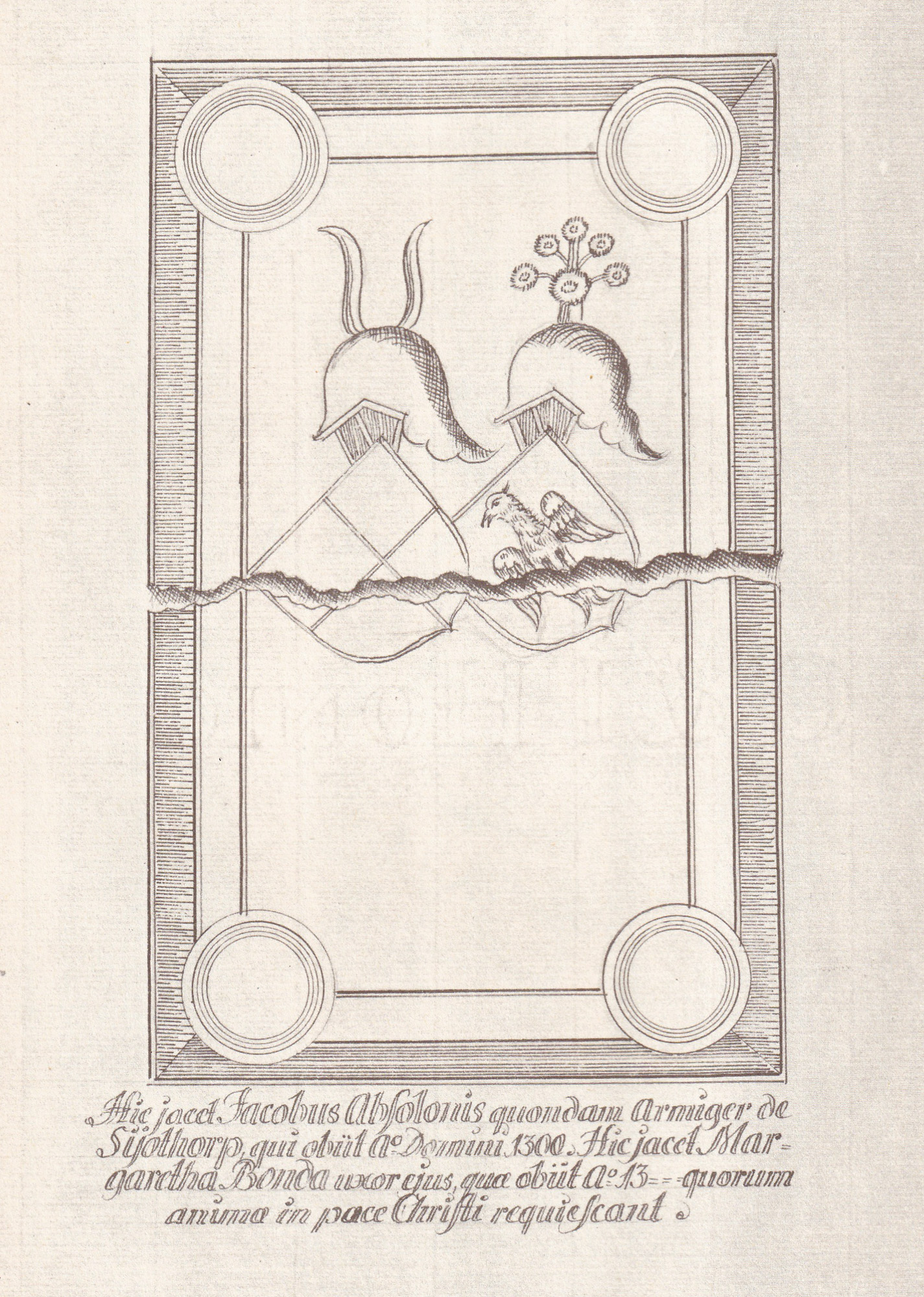 Hic iacet Iacobus Absolonis quandum armiger de ?yothorp qui obiit anno domini 1300. – Hic jacet Margareta Bondadotter (?) uxor ei que obiit anno domini 1300.