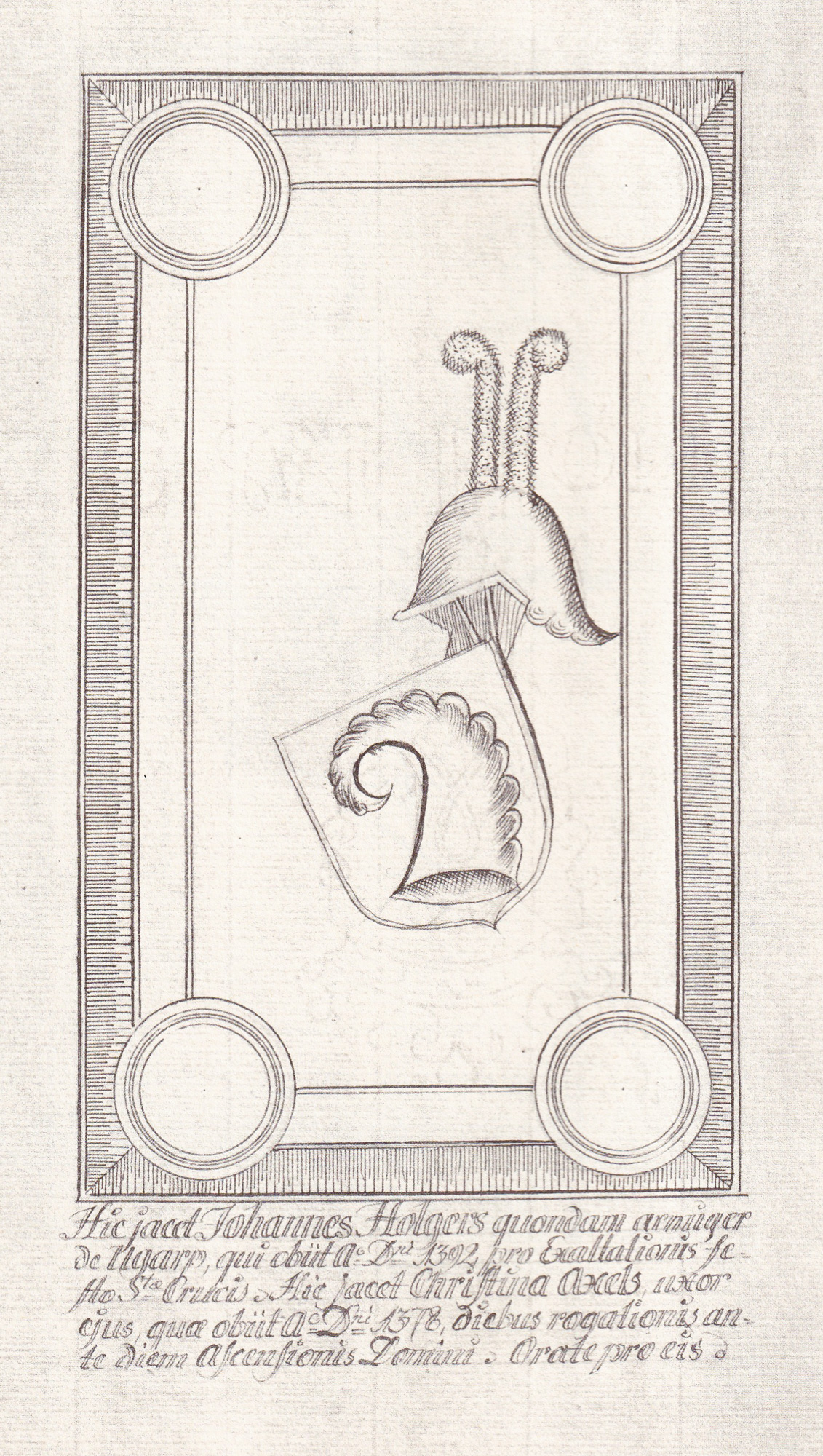 Hic jacet Johannes Holgersøn quondam armiger de Ugarp (Ugerup) qui obiit anno domini 1392 pro festo exaltationis sancte crucis. Hic jacet Christina Axelsdotter uxor ejus, qua obiit anno domini 1378 diebus rogacciones ante dia ascensionis domini. Orate pro ea. - (Her ligger Johannes Holgersøn, tidligere væbner i Ugerup, som døde i det Herrens år 1392 på festdagen for Det Hellige Kors’ ophøjelse. Her ligger Christina Axelsdatter, hans hustru, som døde i det Herrens år 1378 på bønne-dagene før Herrens himmelfartsdag. Bed for hende.)