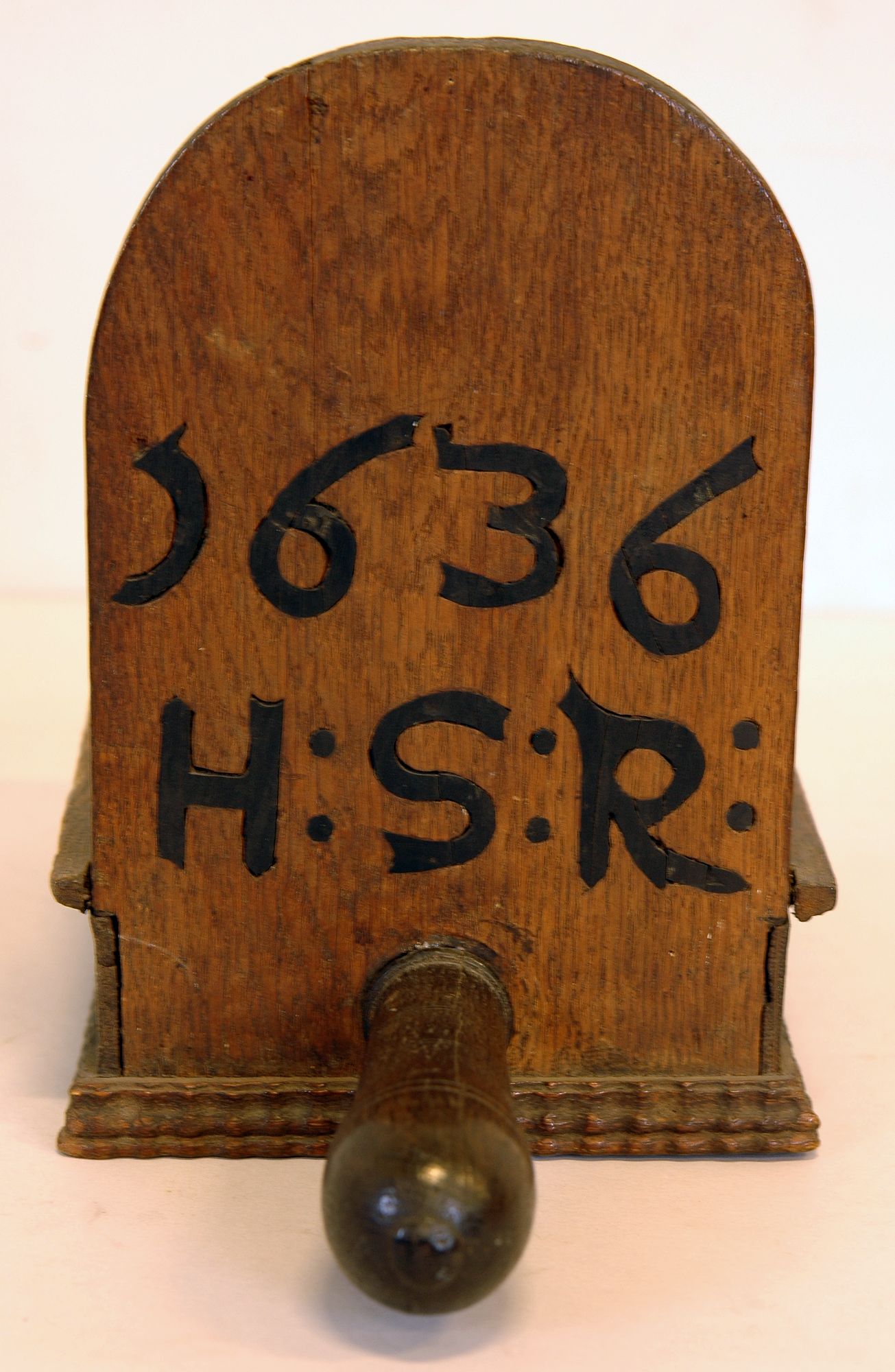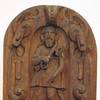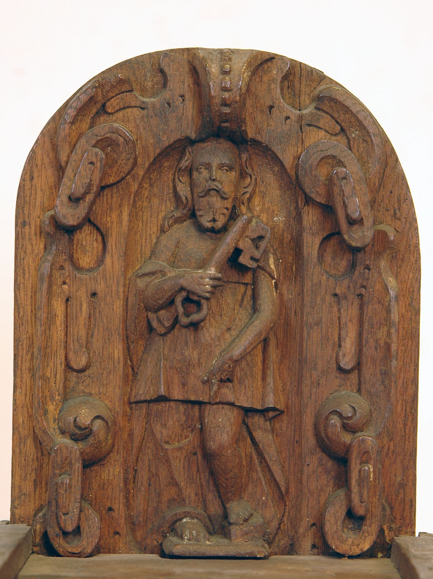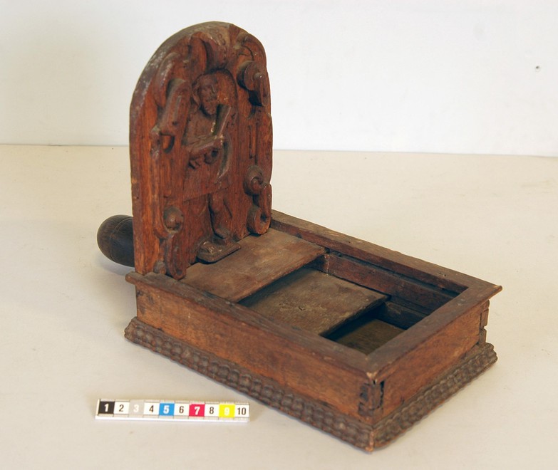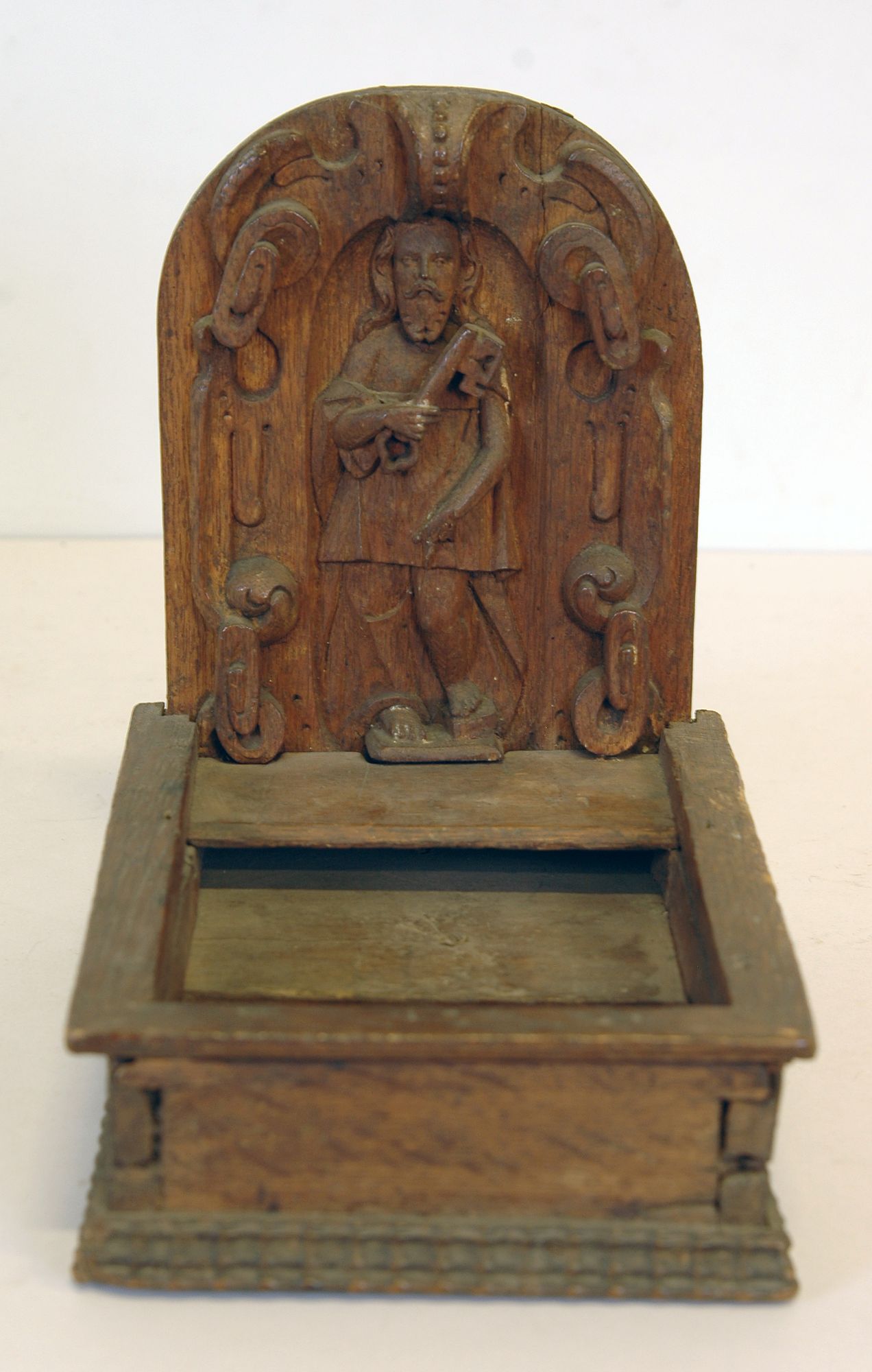 Kasse til indsamling af kollekt. 1636. Peter med nøgle indrammet af rundbue med bruskornamentik.