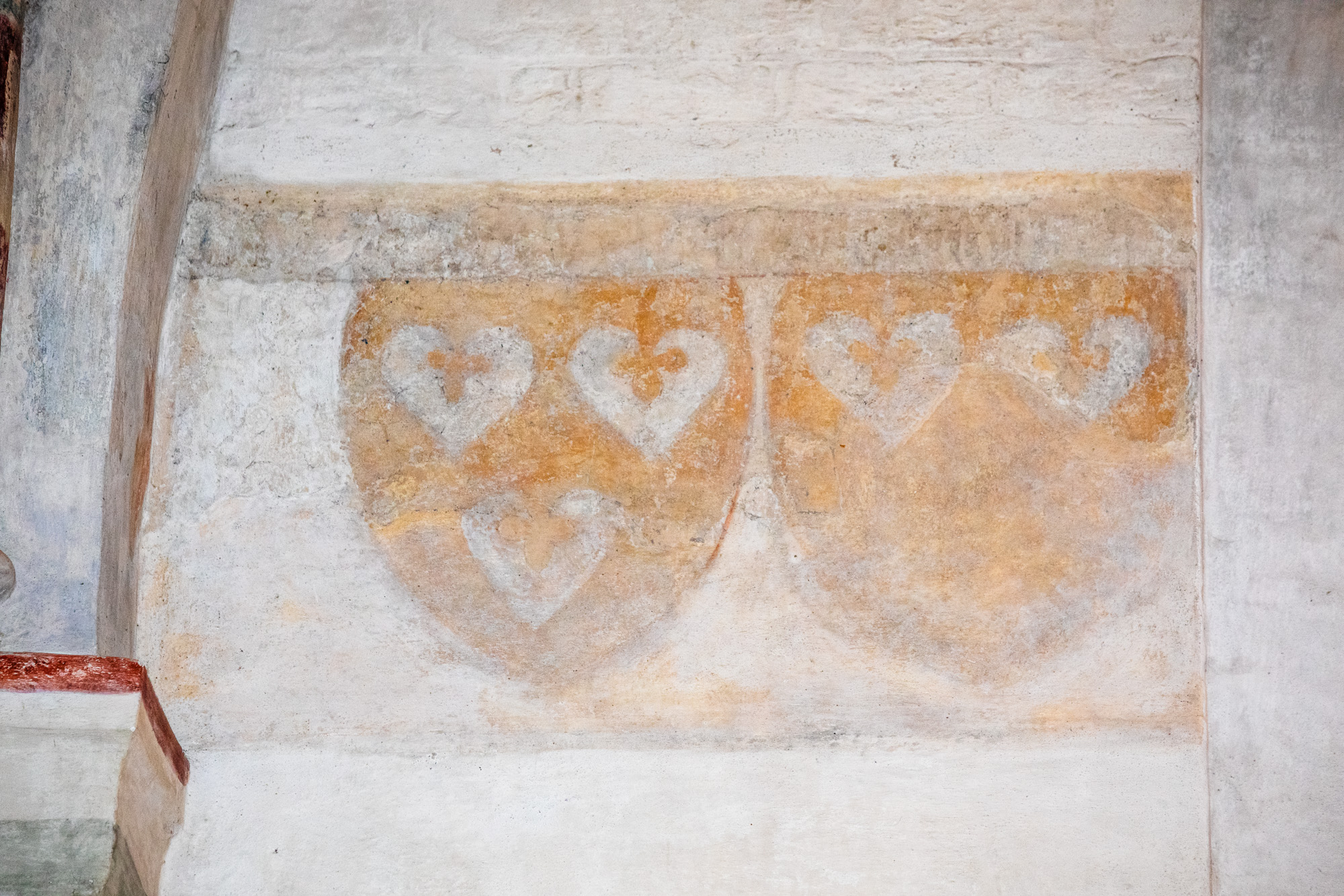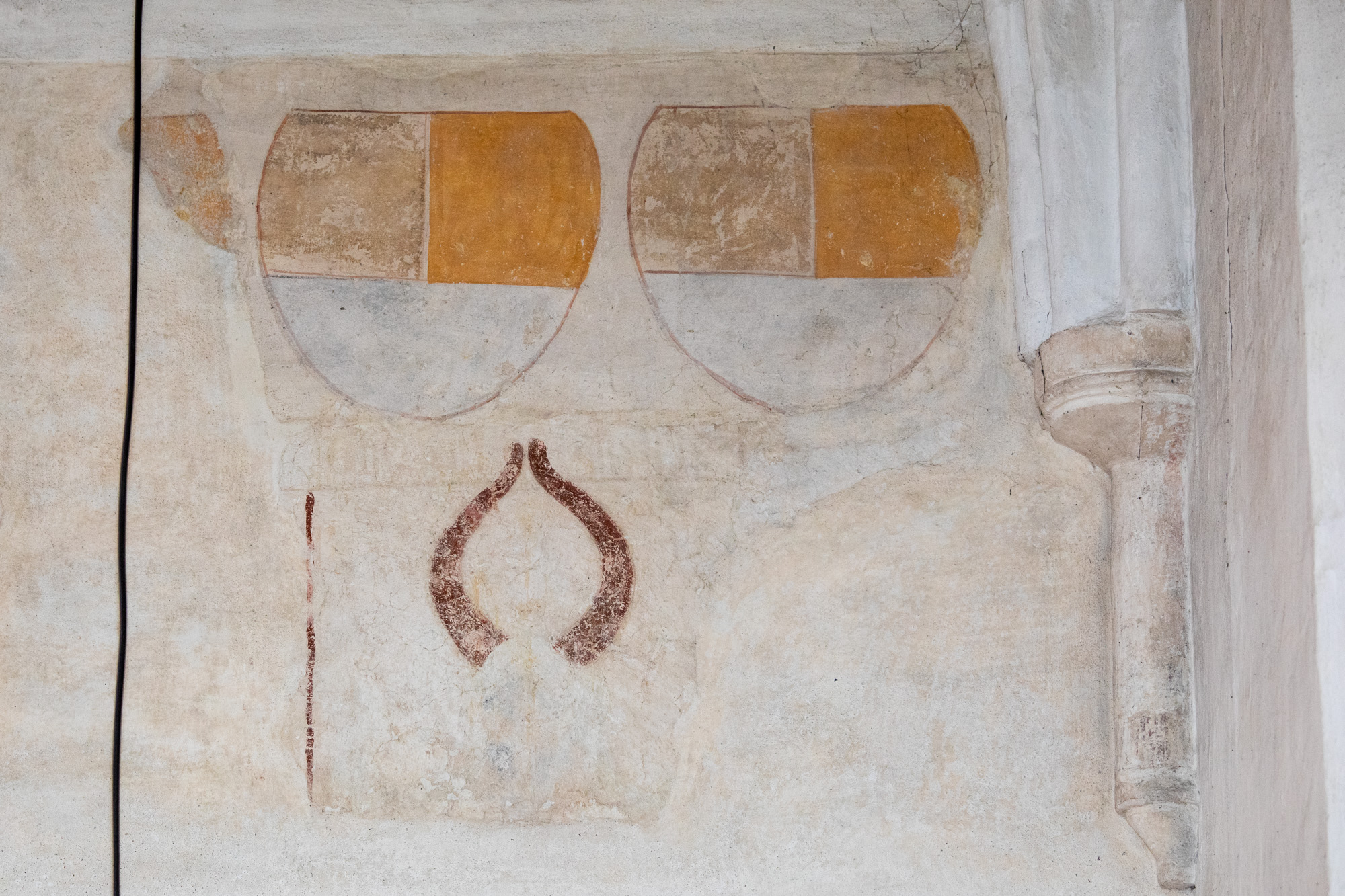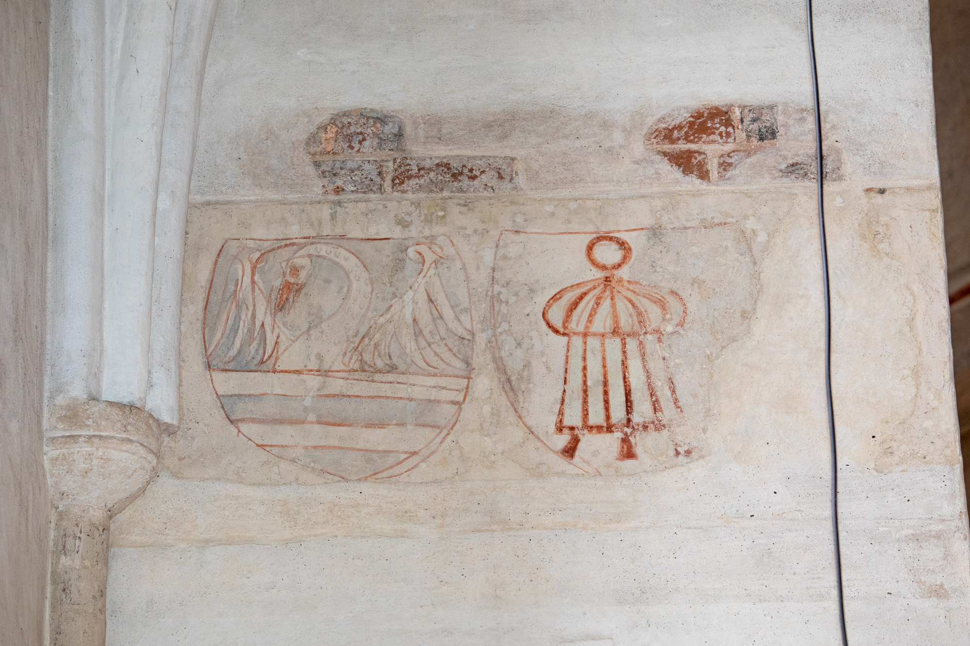 - fag, nordvæg vest for vinduet. De to skjold har sikkert tilhørt en af slægterne Kyrning, Porse, Pæp eller Ribbing, men kan eventuelt også repræsentere hanseatiske købmænd fra Lübeck, som har slået sig ned i byen.