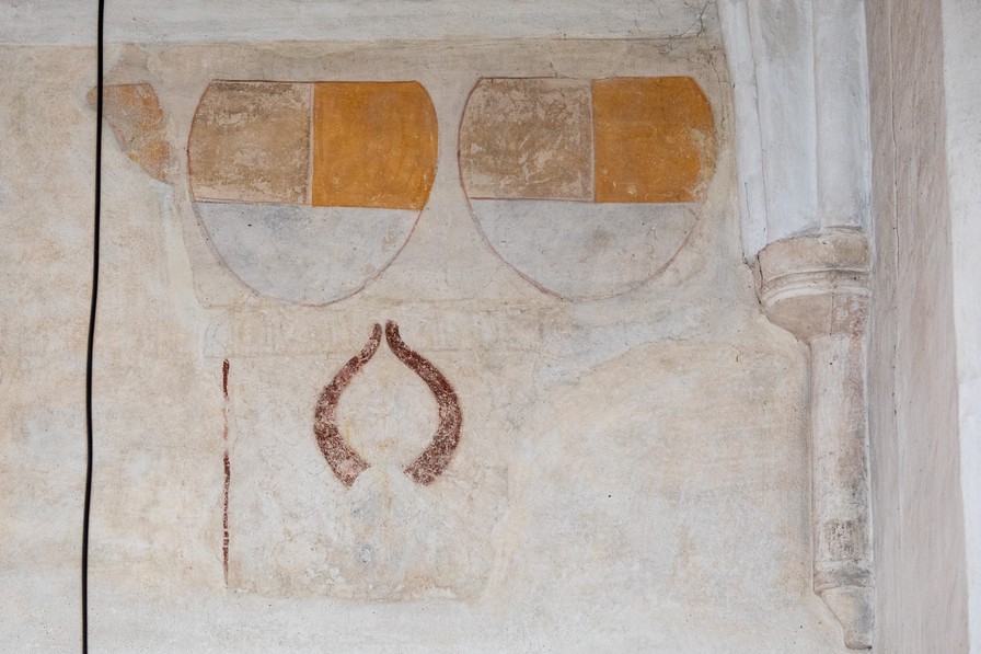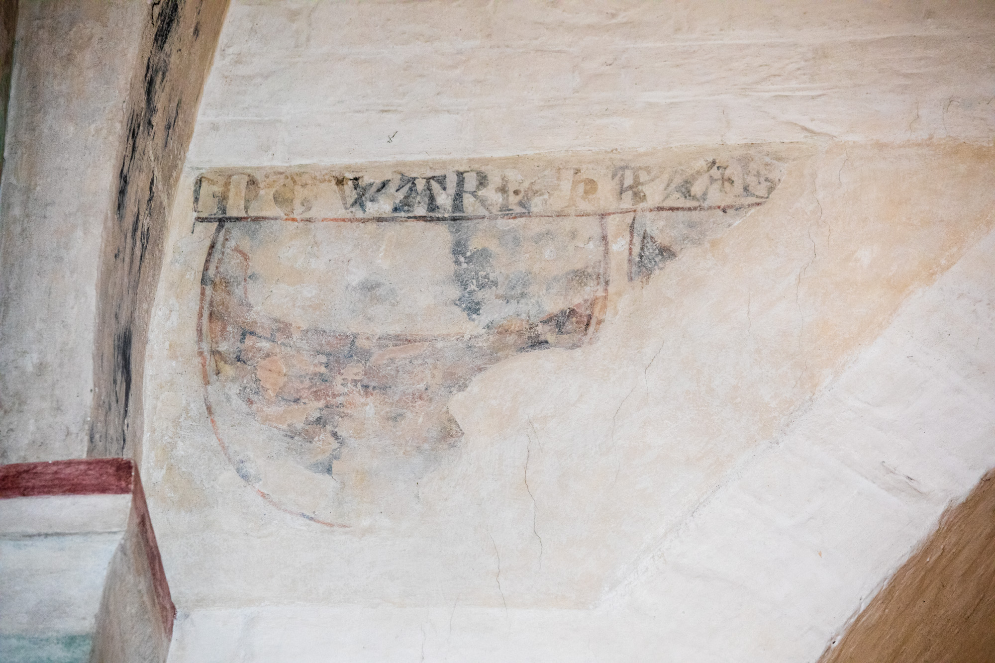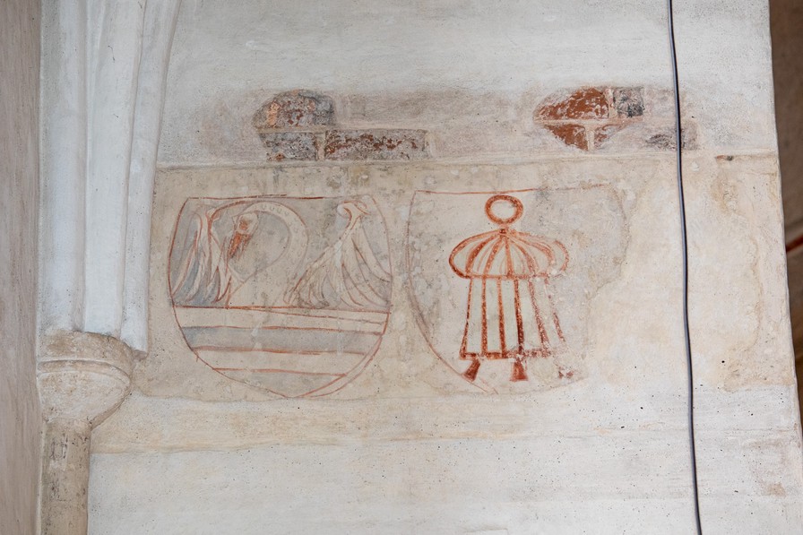 Skib, 2. fag, vest for åbning mod sideskib. To våbenskjold. Tydningen er usikker.