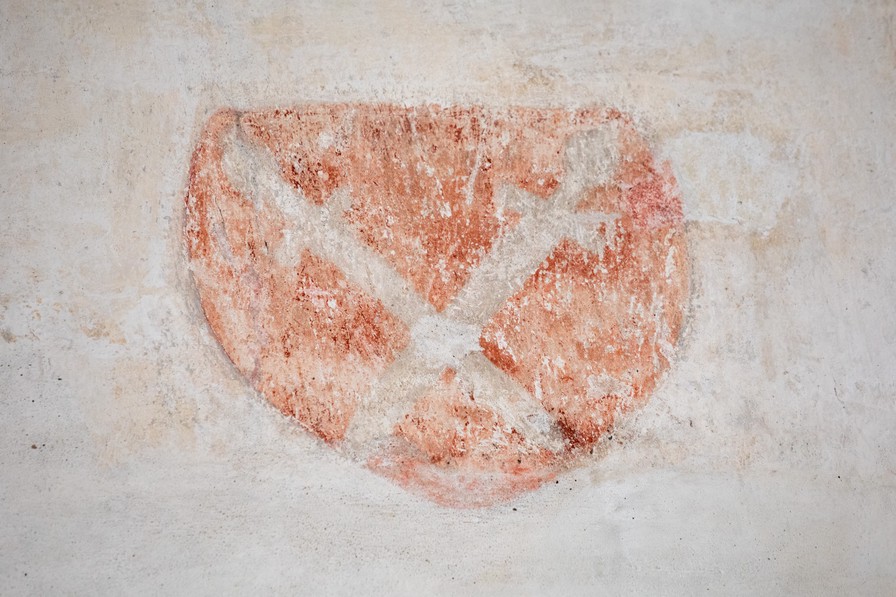 På den anden side af ribbekonsollen (til højre i billedet) er et meget fragmentarisk våbenskjold, som kan have tilhørt slægten Krovel fra Mecklenburg.